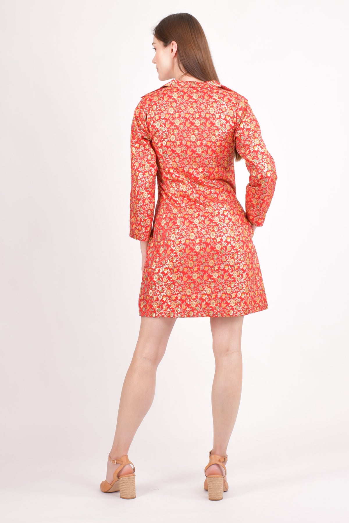 The Clara Red Silk Jacquard Blazer Dress is designed in luxurious silk jacquard. This red mini blazer dress features a structured silhouette with a gold floral brocade pattern, offering a polished yet feminine look, making it perfect for elegant dinners, formal events and evening occasions.