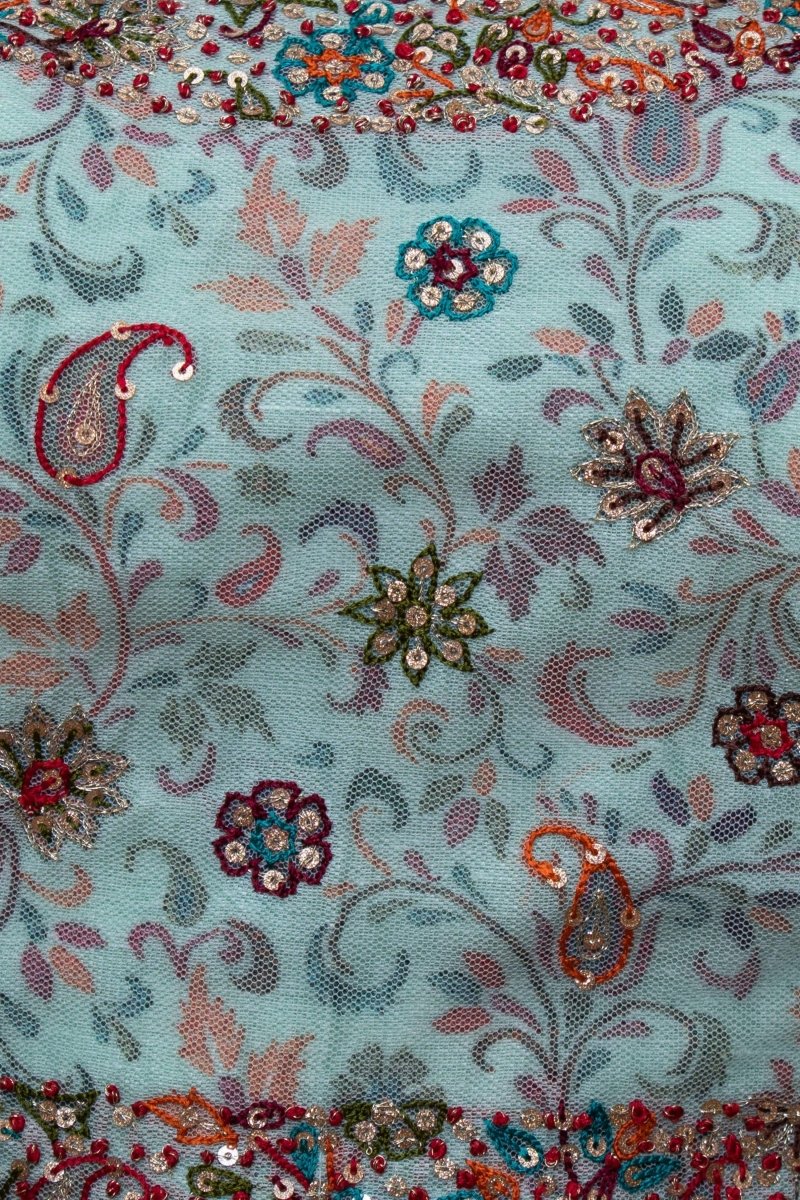 Elevate your celebration with this stunning Sage Green Sequins Lehenga Choli, a three-piece ensemble designed for the modern bride and festive occasions. The sleeveless blouse features intricate sequins and resham embroidery with a closed back and string tie closure, while the 42" lehenga showcases heavy sequins and kasab work for maximum sparkle. Crafted from premium net and printed silk layers, this piece combines traditional craftsmanship with contemporary elegance. The coordinating net dupatta completes the look. Professional dry clean only. Perfect for weddings, engagements, and Indian celebrations across the US.