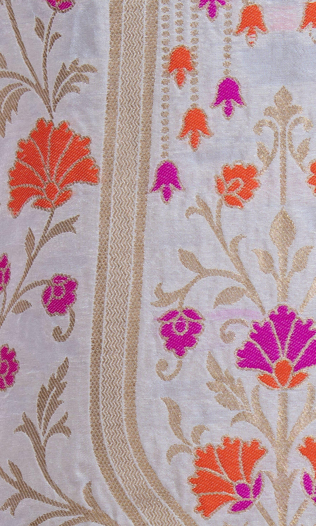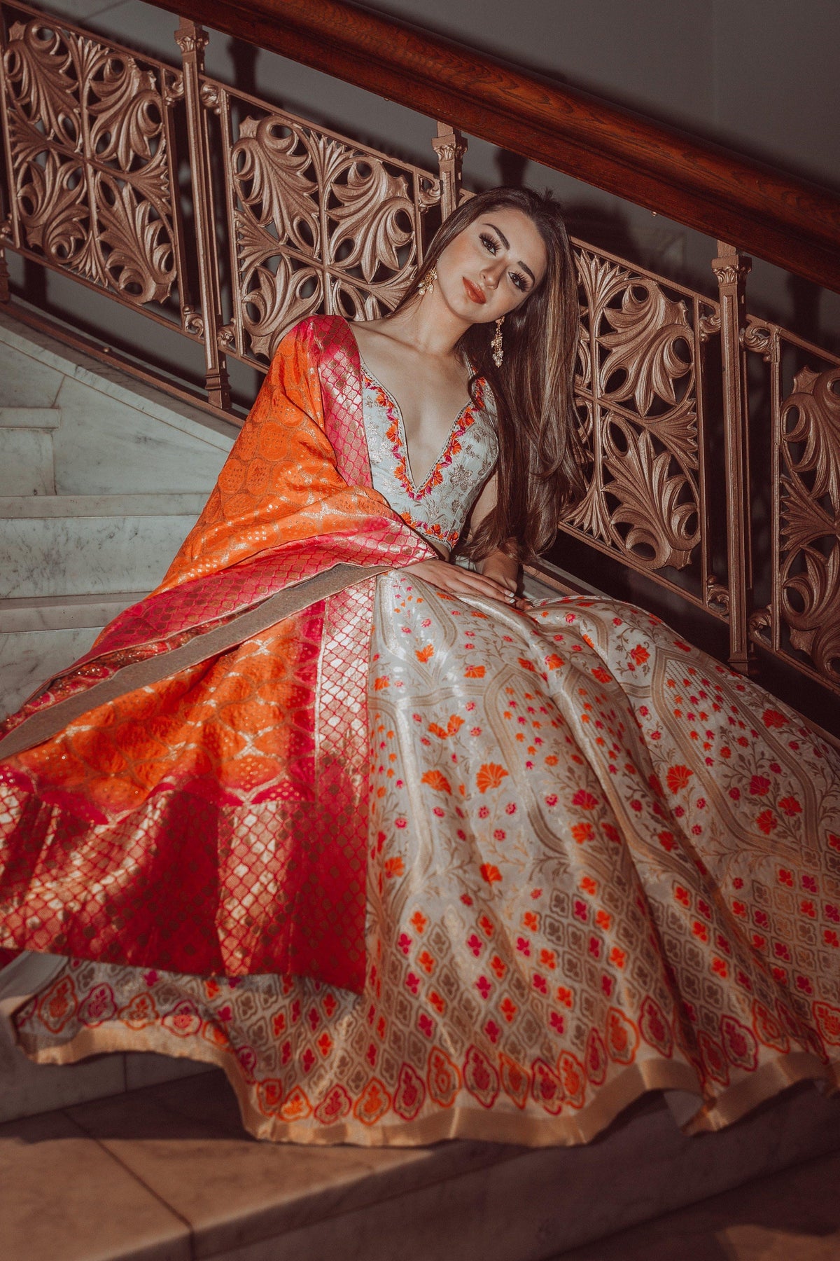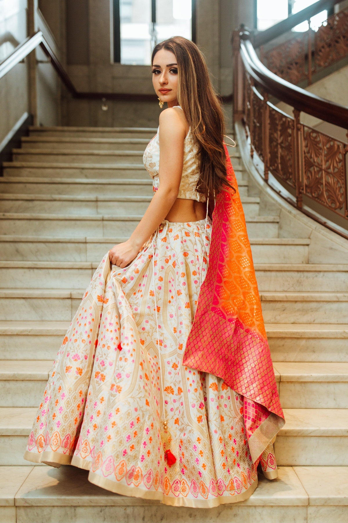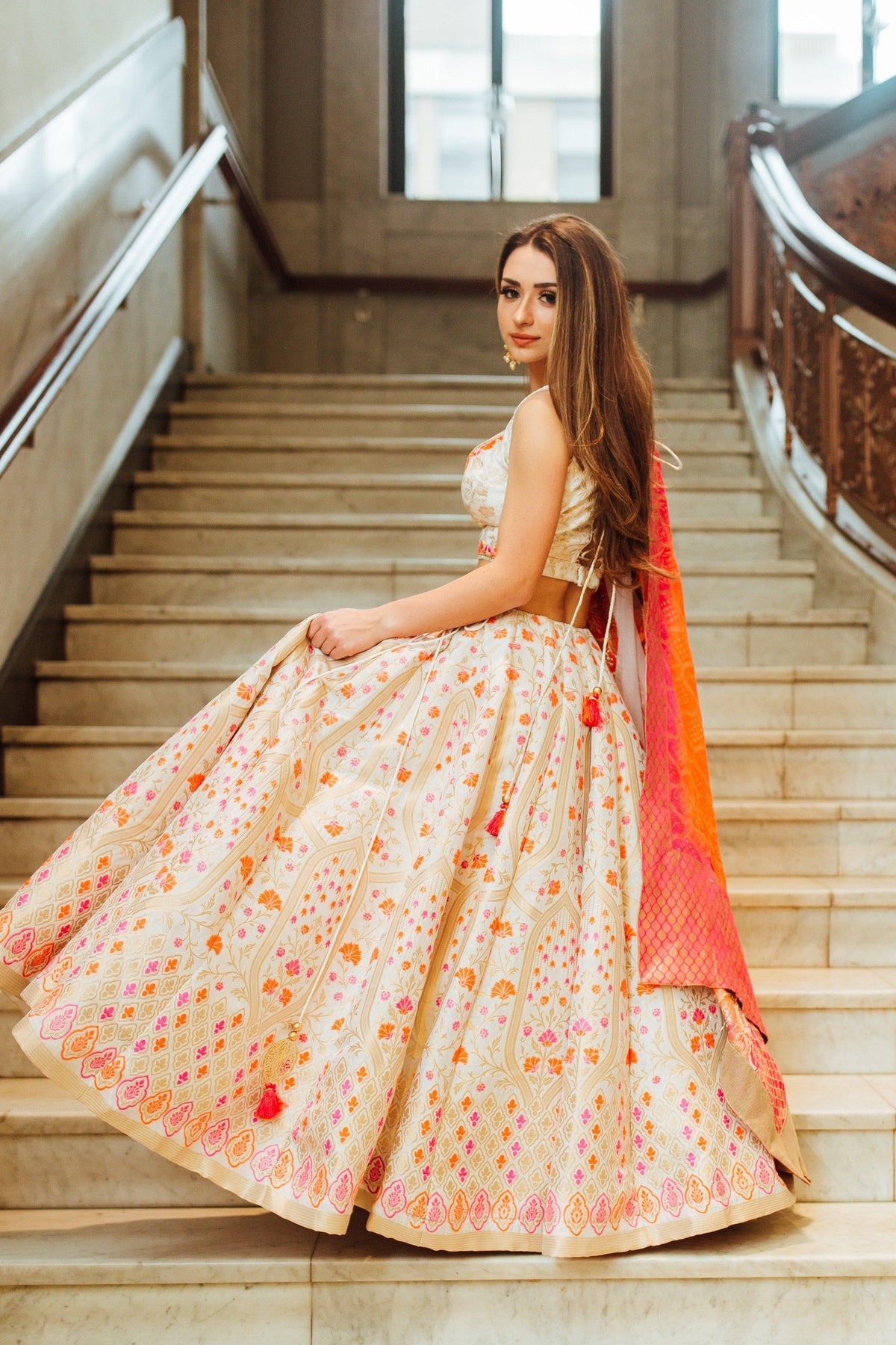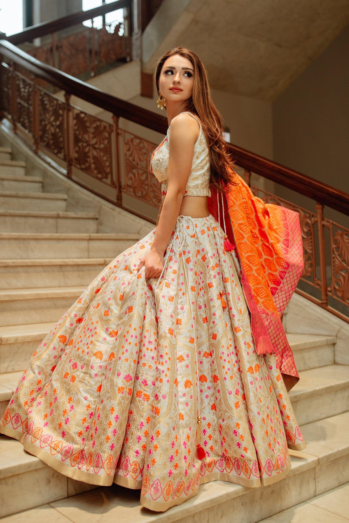 Indulge in timeless elegance with this exquisite off-white designer Oriel Jacquard Brocade Lehenga Choli Set. The blouse is adorned with intricate resham embroidery. The lustrous, shiny borders gracefully accentuate the edges to add an aura of opulence to the ensemble. Crafted from premium silk, the lehenga exudes a sophisticated allure, while the accompanying silk dupatta flows elegantly to enhance the grandeur of this luxurious outfit. Perfectly suited for celebrations where you seek to make a lasting impression, the Oriel Jaquard Barocade Lehenga Choli Set embodies both tradition and modern opulence. Lehenga weaving May wary. Delivery time 3-4 week