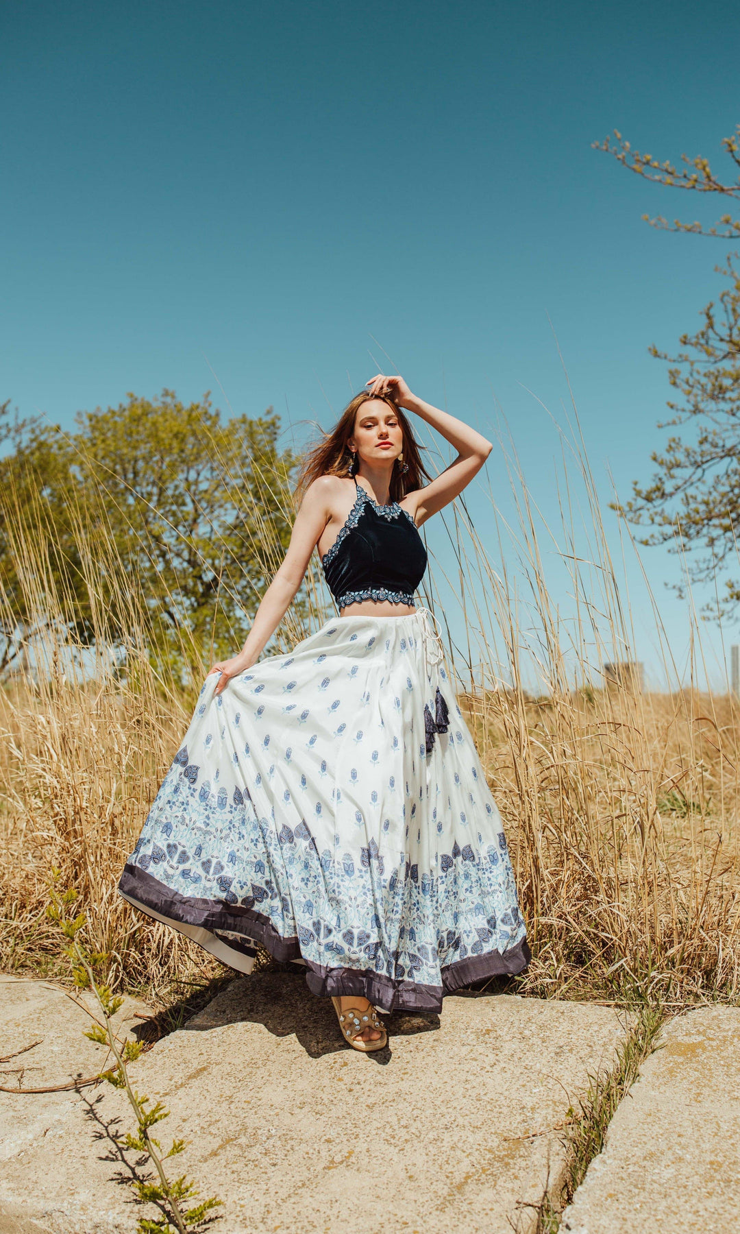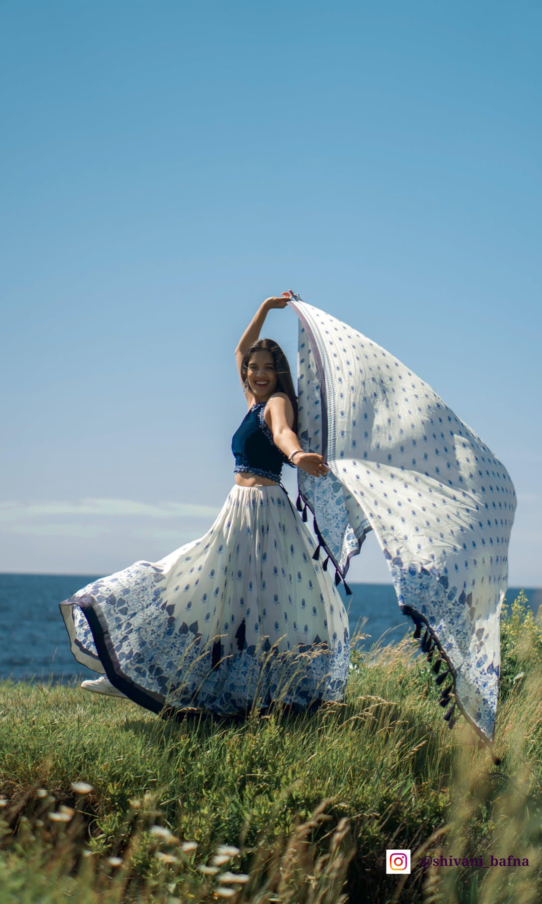 Dress like a dream in the Afina Lehenga Choli Set. The Lehenga, crafted from pure muslin silk, creates the perfect canvas to play with colors and textures with its minimalistic elegance. The Lehenga is paired with a luxurious velvet blouse with cutwork resham embroidery. Completing the Afina Lehenga Choli Set is a printed muslin dupatta that echoes the lehenga’s patterns. Whether for a festive celebration or a special gathering, this lehenga choli set will make you feel effortlessly classy.