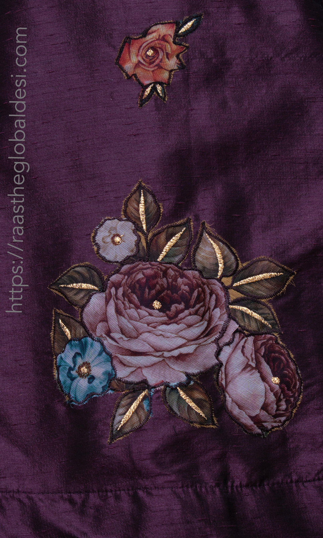 - Blouse: Fully lined, bold neckline, open back with string tie, contains resham, cutwork, & patchwork embroidery