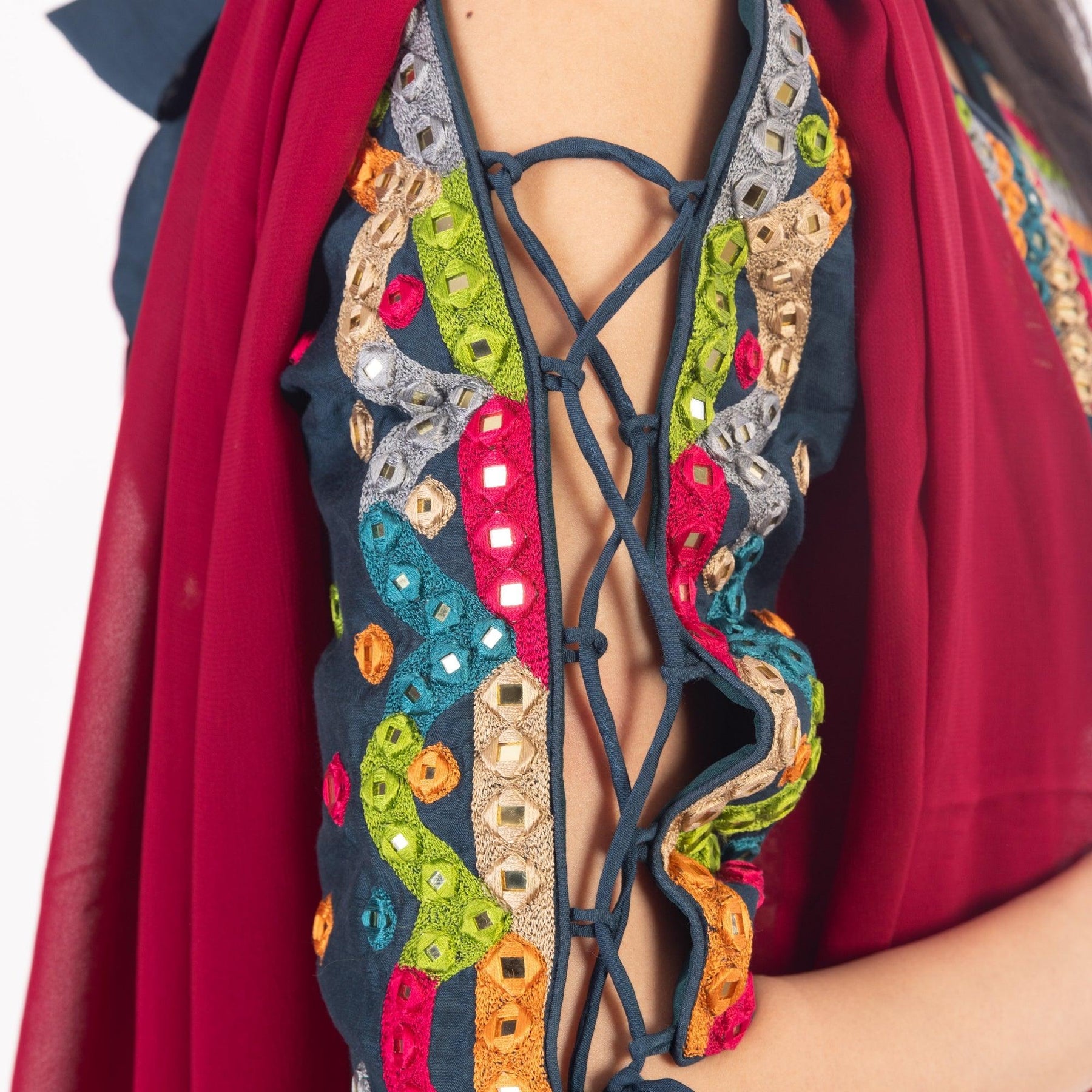 - Blouse: Half sleeves, embroidered, open back with string tie