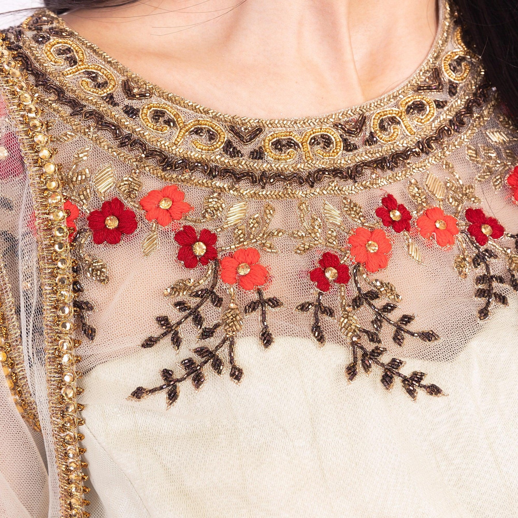 • Blouse: Sleeveless, embroidered, back closure with hook, zardoshi work