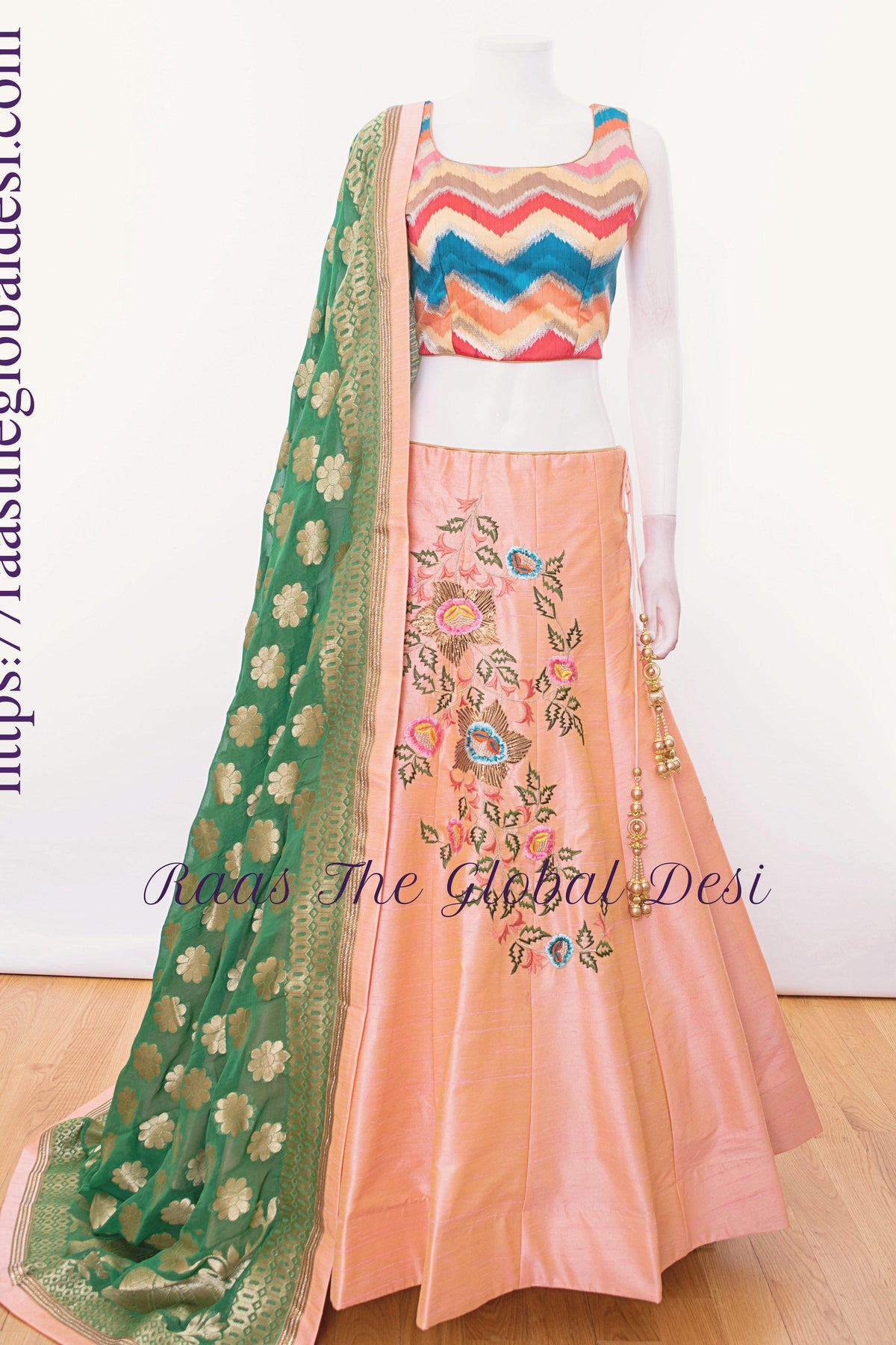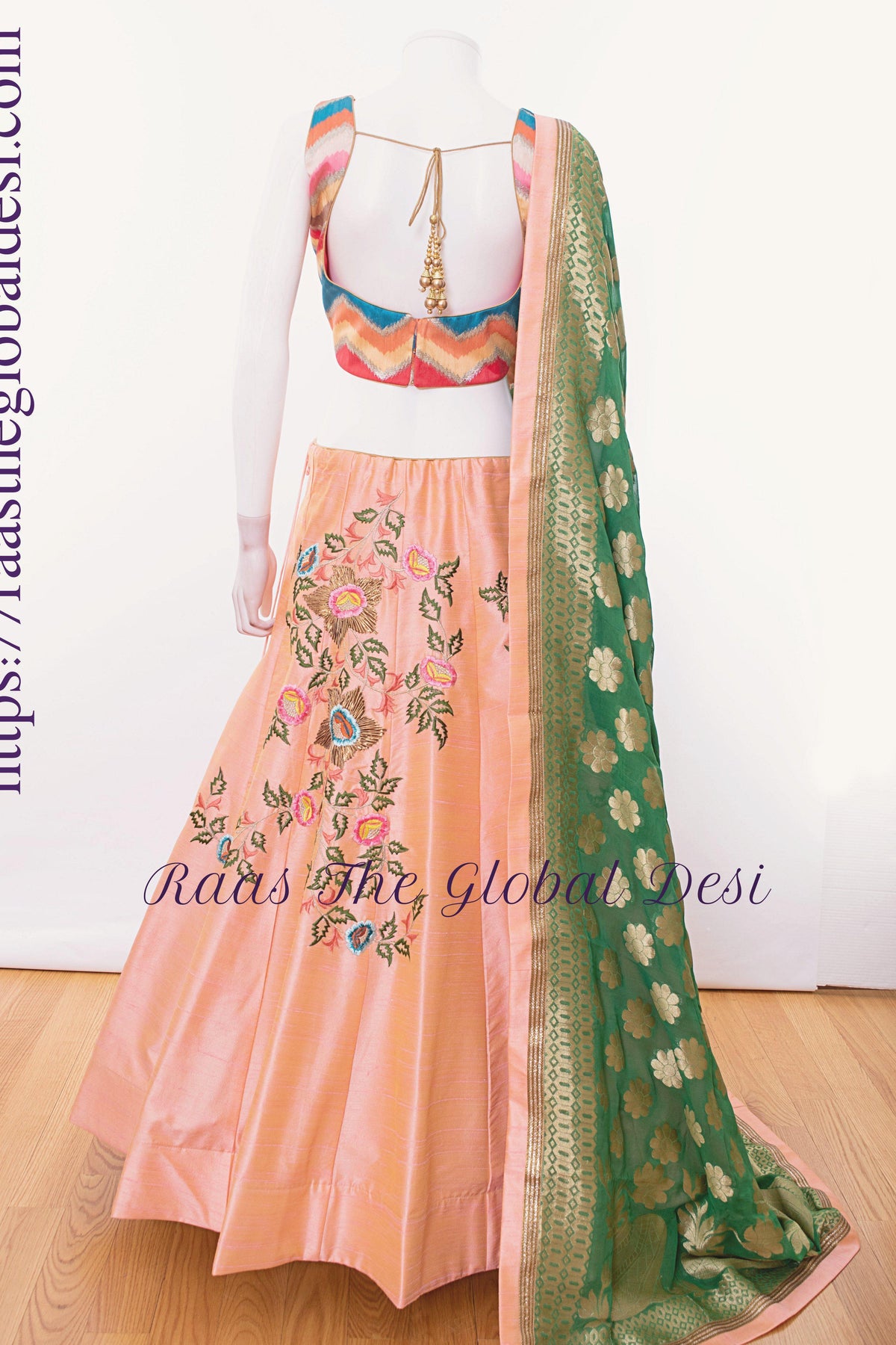 Lift your style quotient wearing this captivating designer lehenga choli set featuring peach skirt bearing resham sari embroidery with multi color silk choli and banarasi dupatta.