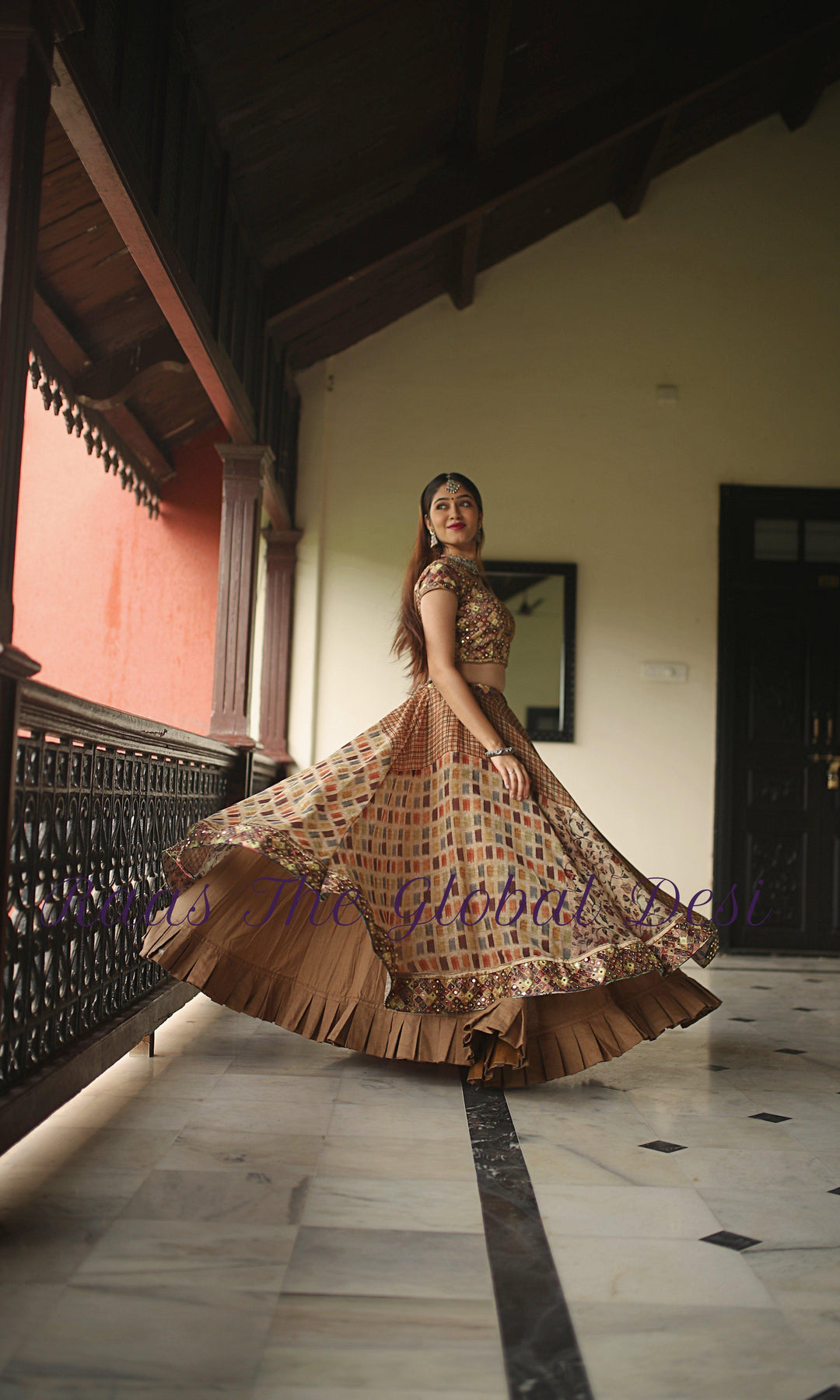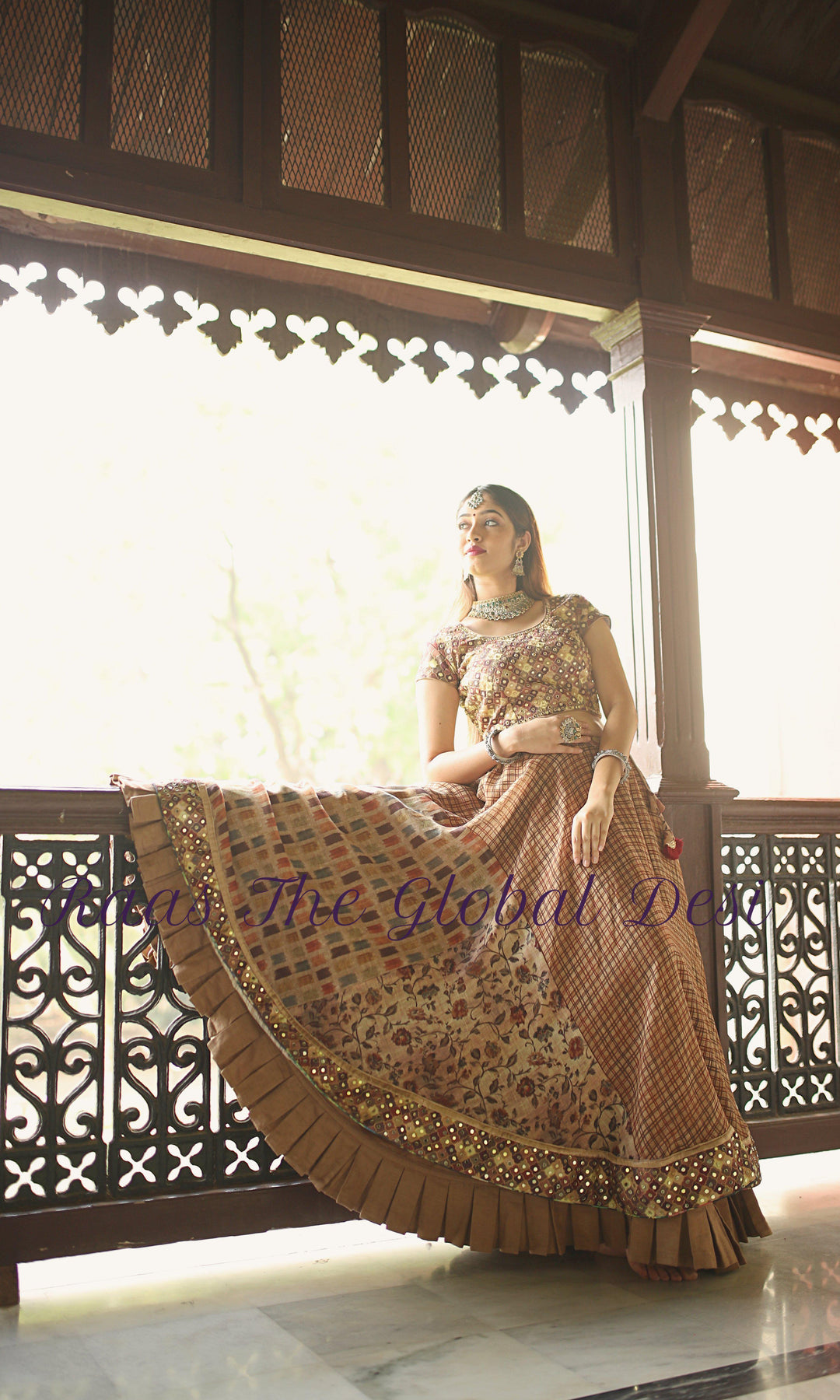 Designer pure linen full flare (6-8 meters) chaniya choli featuring linen layered chaniya with mirror work border with designer all over embrodery with mirror work blouse and net dupatta.(dupatta print may vary)