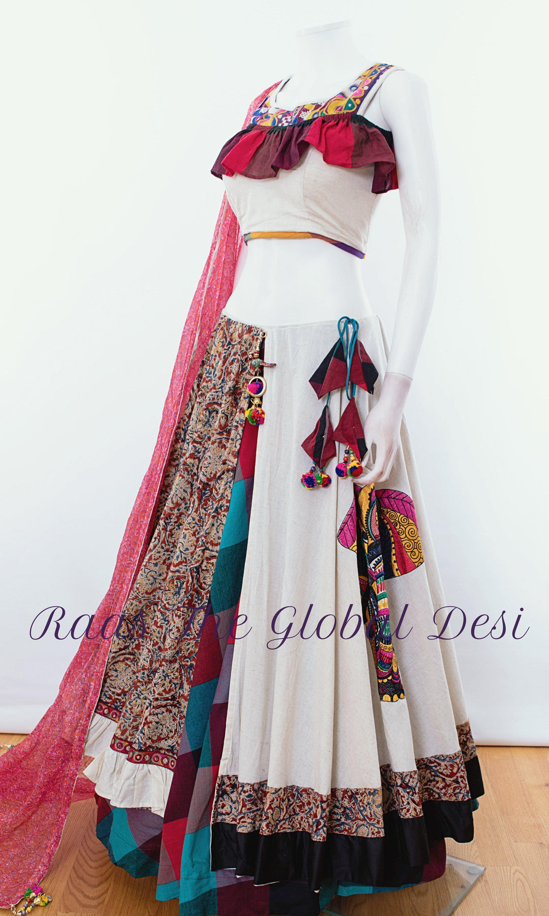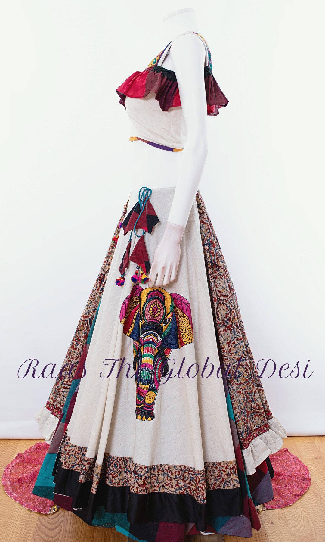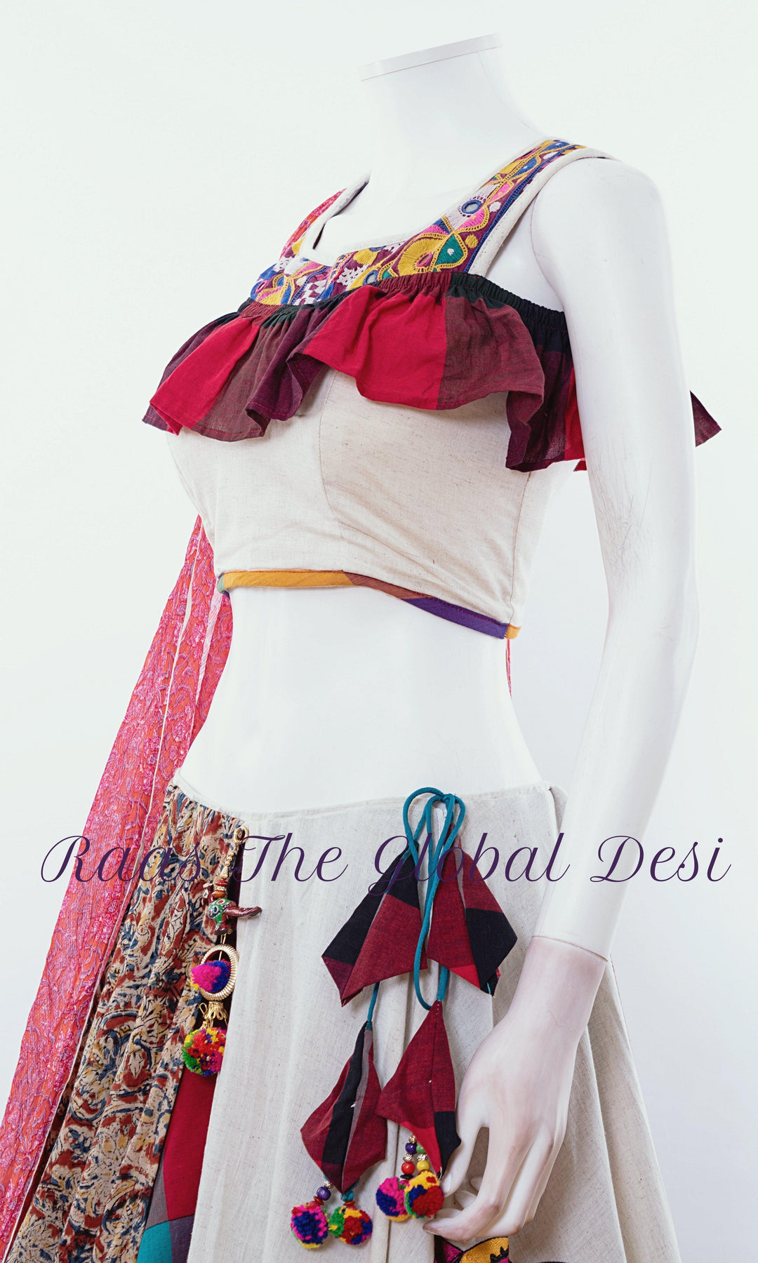 Full (8 meters plus) flare layered cotton layered flap chaniya with embroidery on outer layer, designer blouse with hand work with dupatta