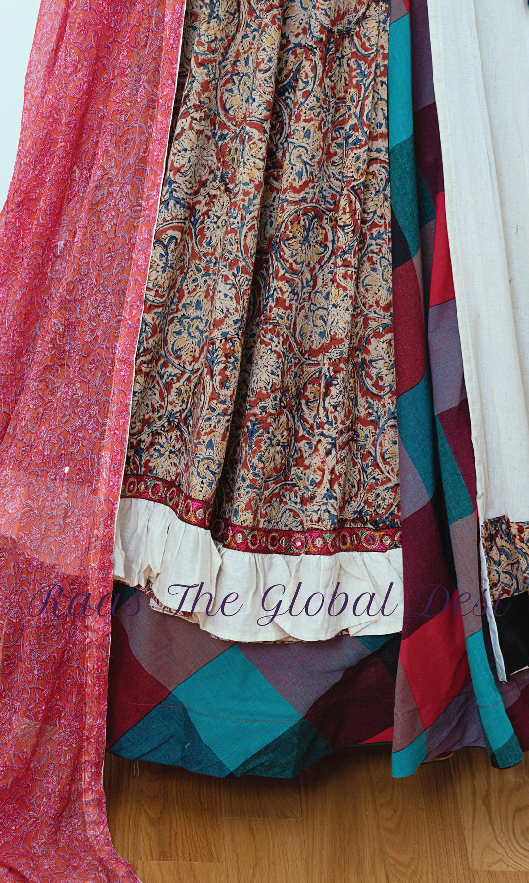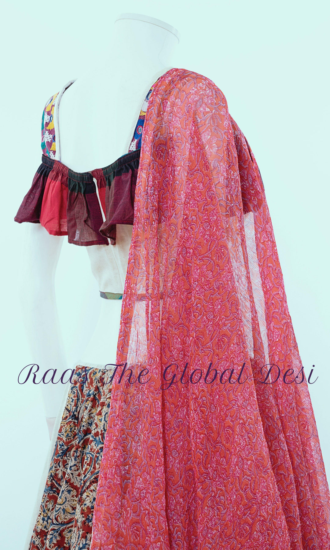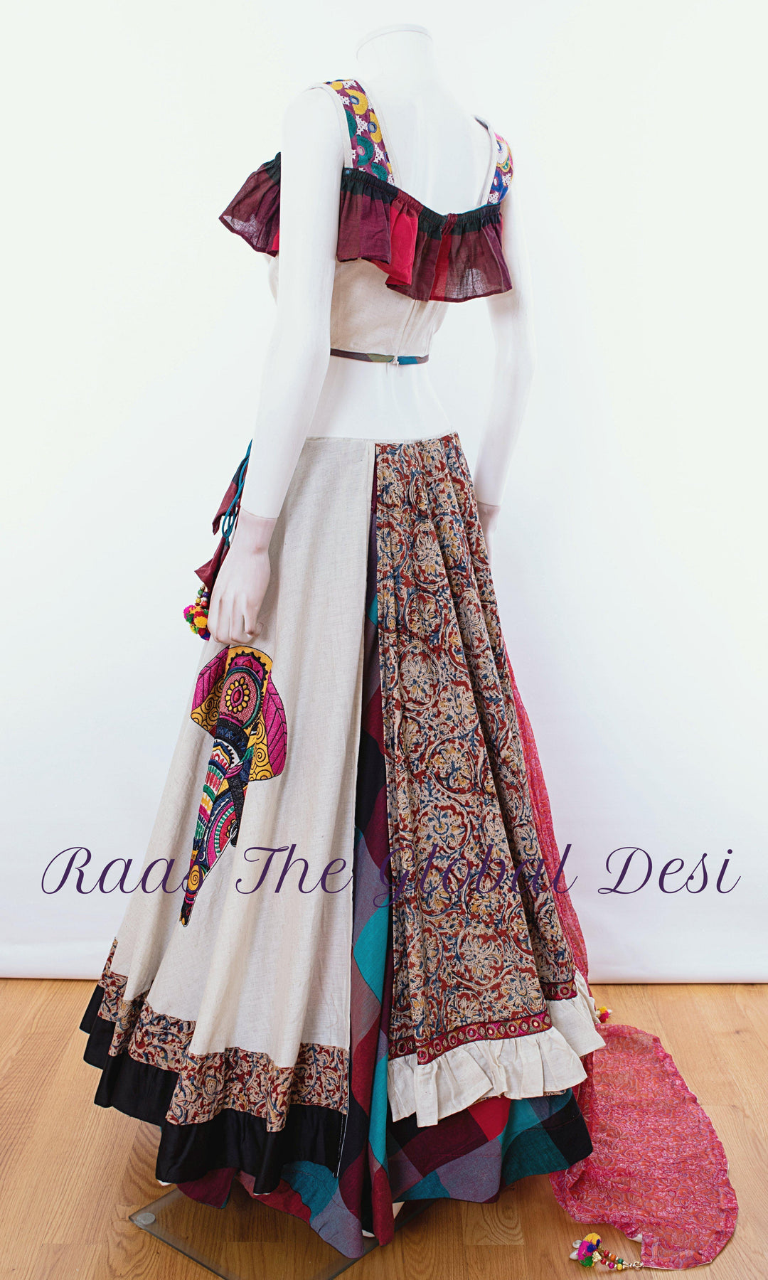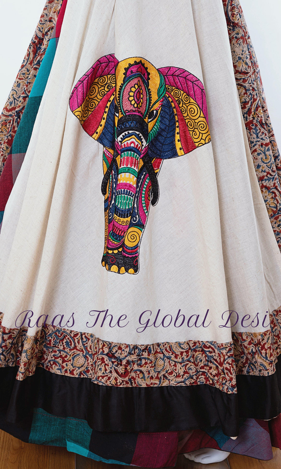 Full (8 meters plus) flare layered cotton layered flap chaniya with embroidery on outer layer, designer blouse with hand work with dupatta