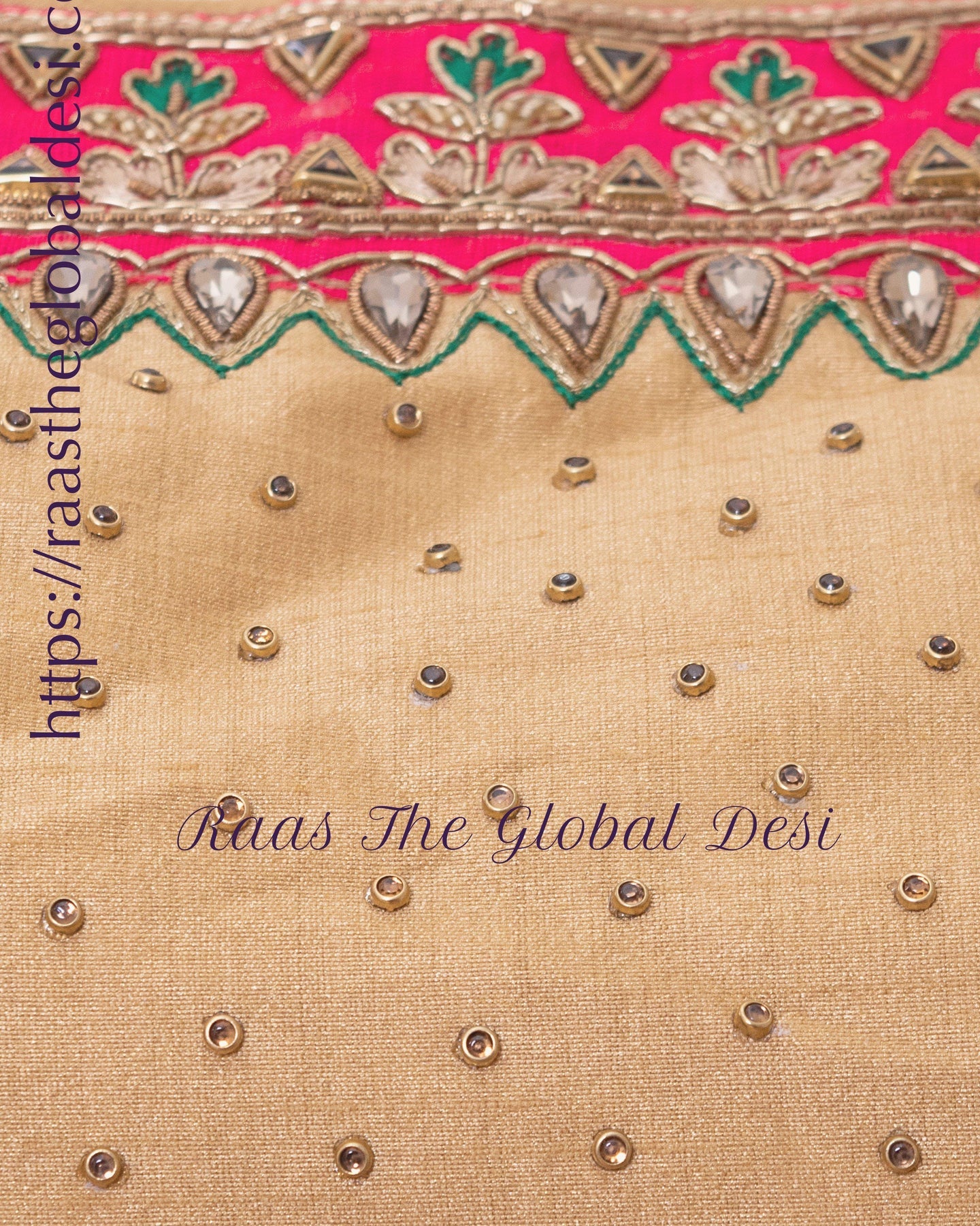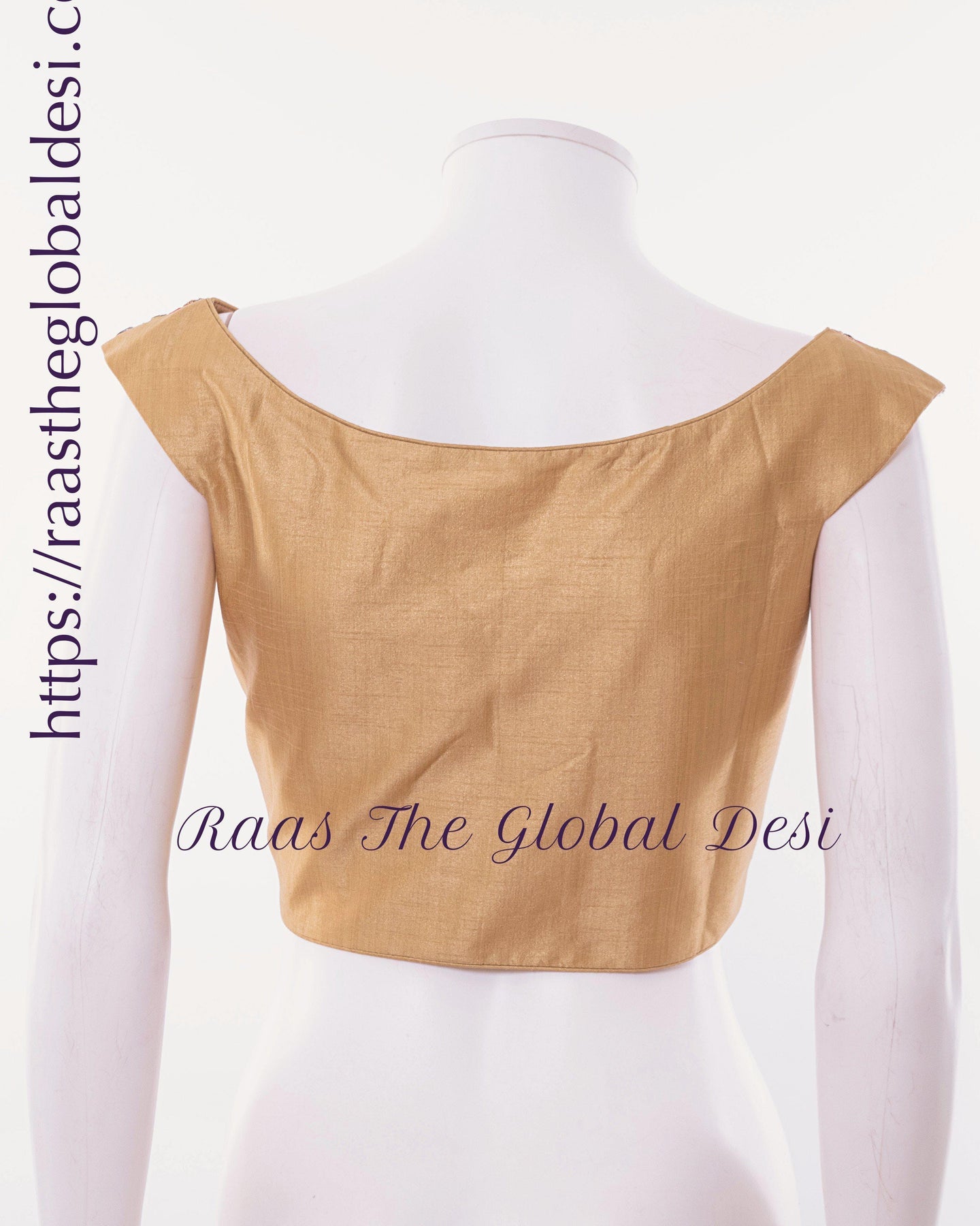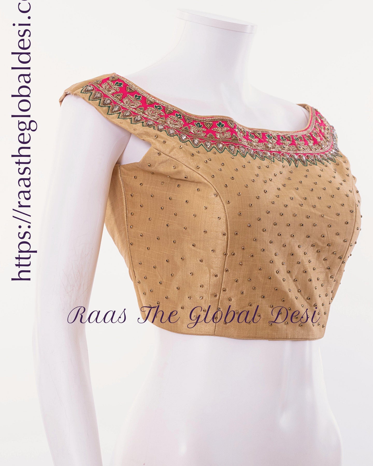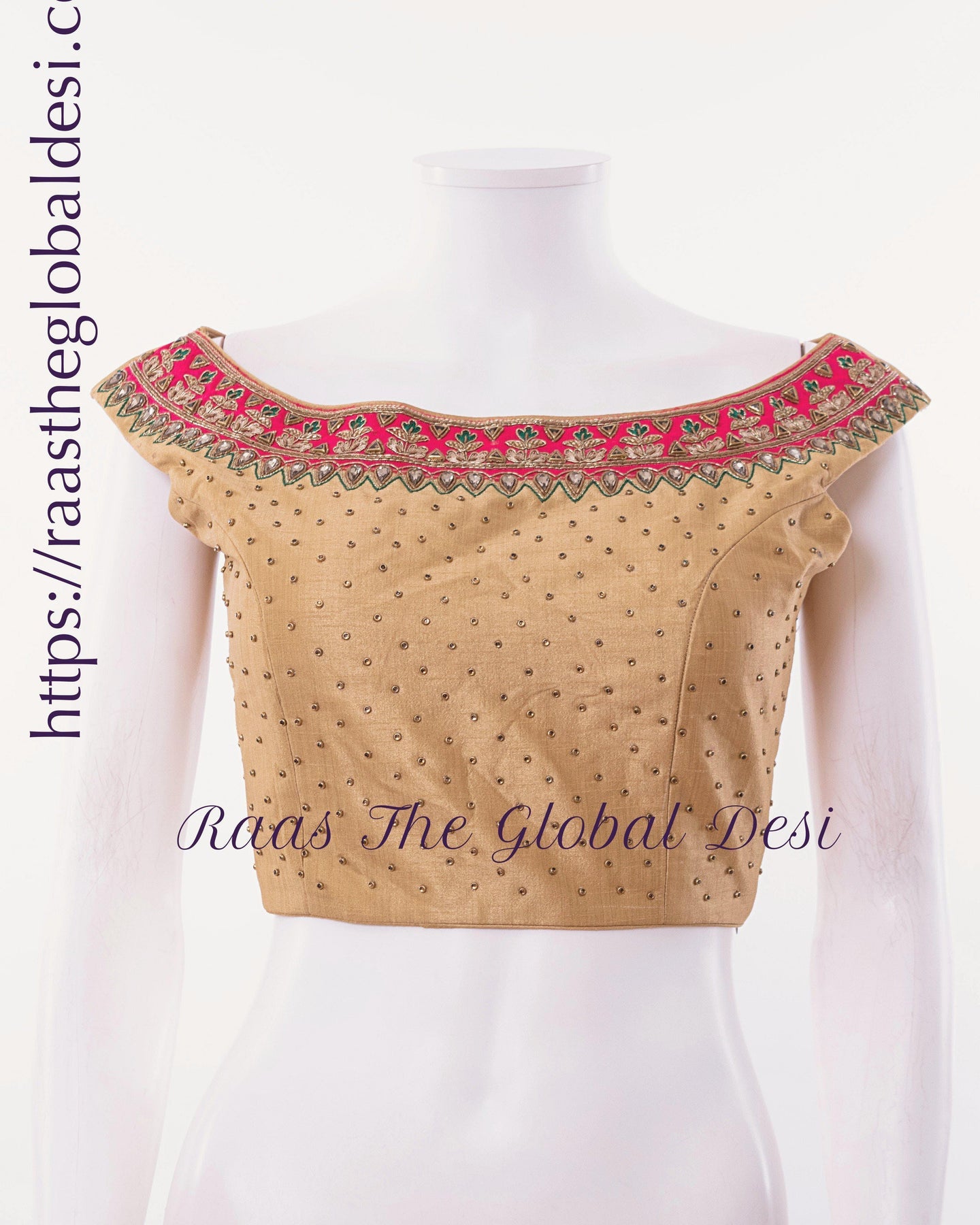Best for traditional events, functions and weddings. This off shoulder silk blouse comes with all over stone work and beautiful resham embroidery on neckline.
