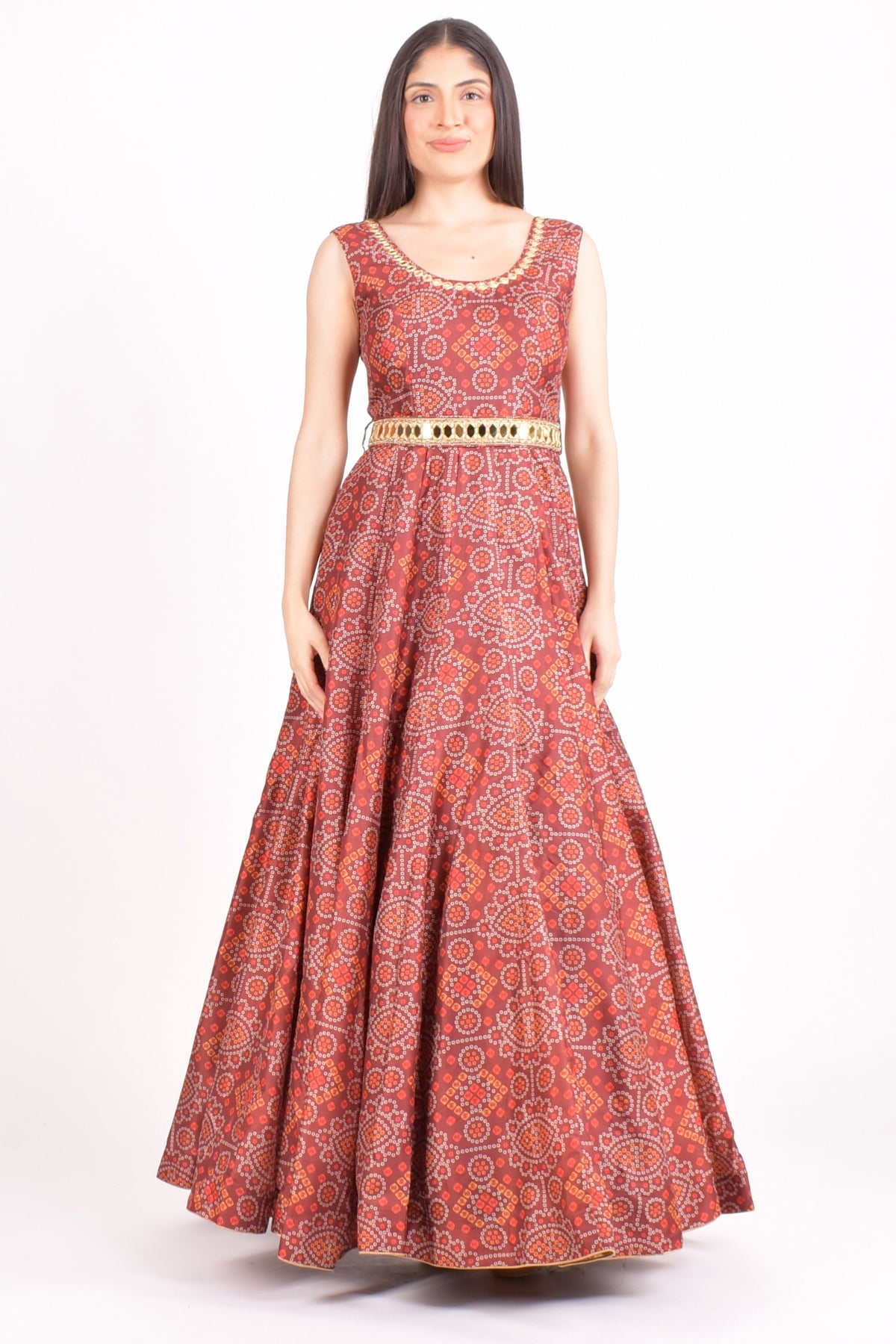 The Darrie Gown features an all-over bandhani print in a rich maroon shade, designed in a polyester-silk blend that drapes beautifully. It comes with a golden mirror belt that adds a refined touch of sparkle.