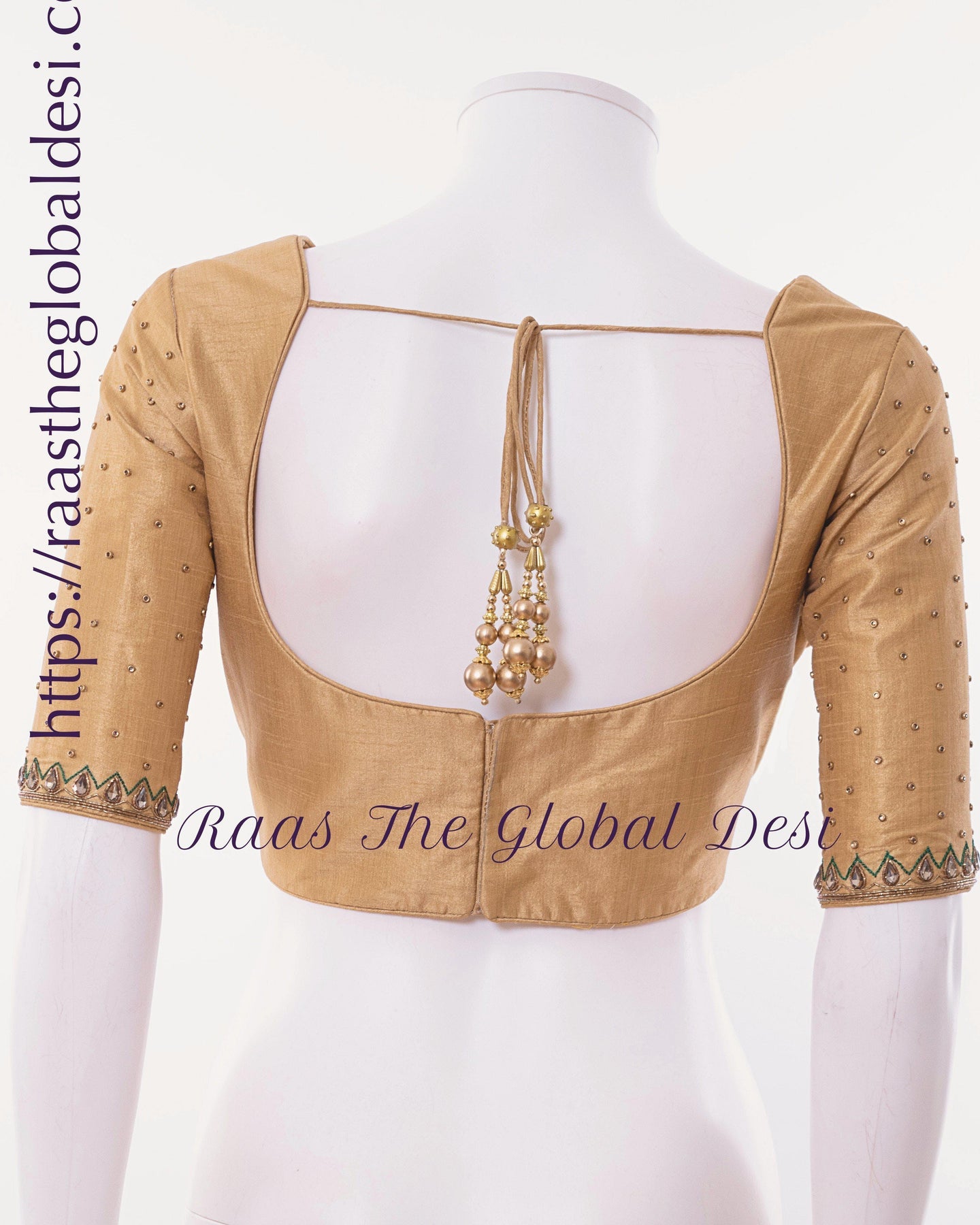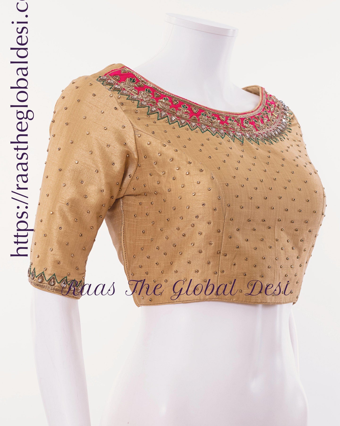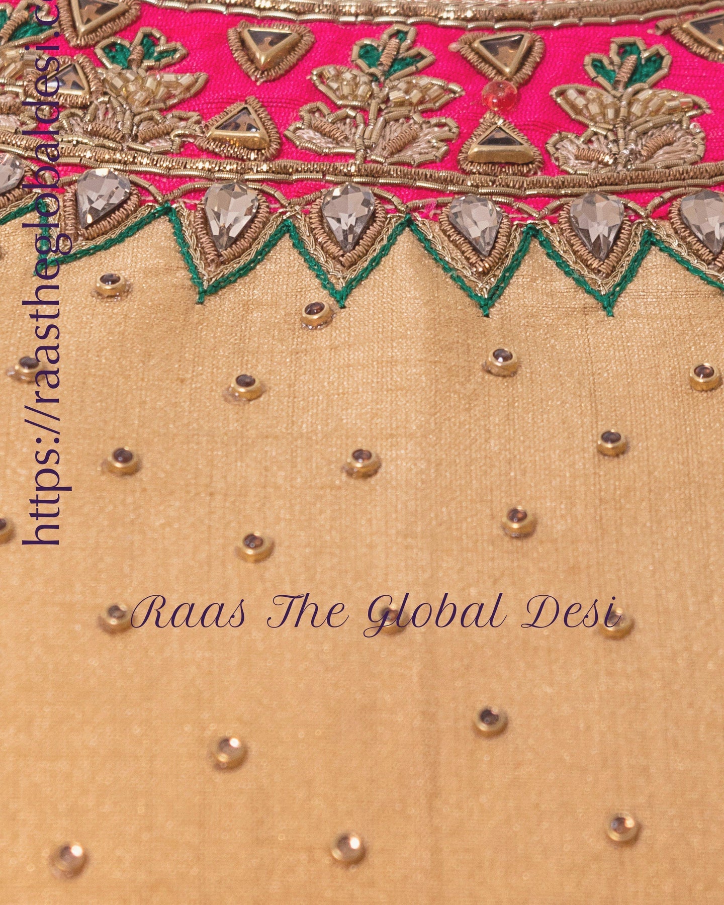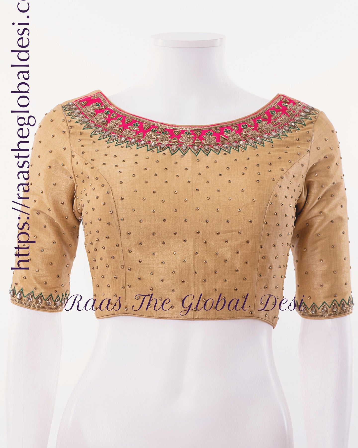 Best for traditional events, functions and weddings. This silk blouse comes with all over stone work and beautiful resham embroidery on neckline.
