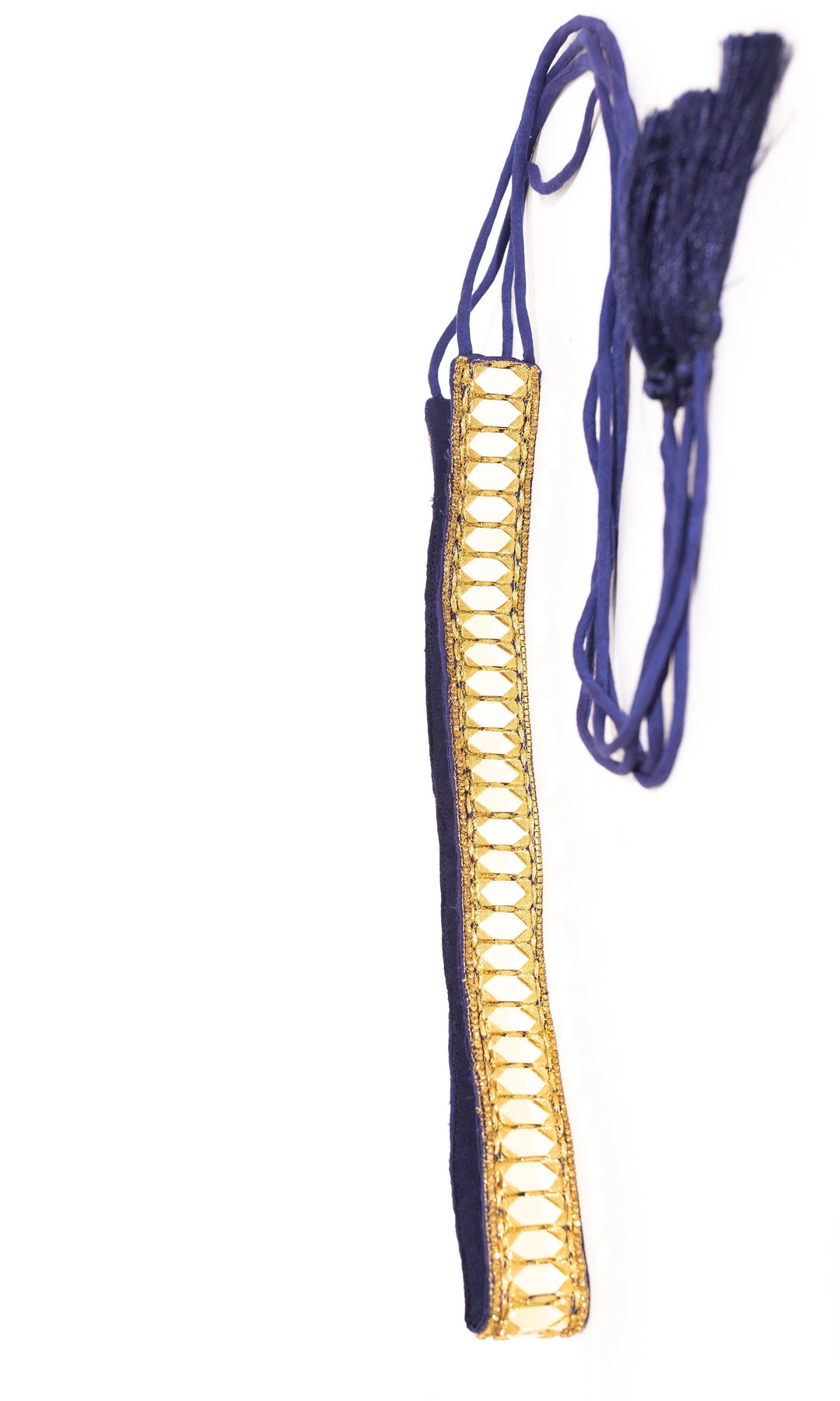 Enhance your look with this striking gold and blue waist belt. It displays intricate mirror work with rhinestone accents, making it ideal for wedding, receptions, navratri, parties, and other formal occasions.