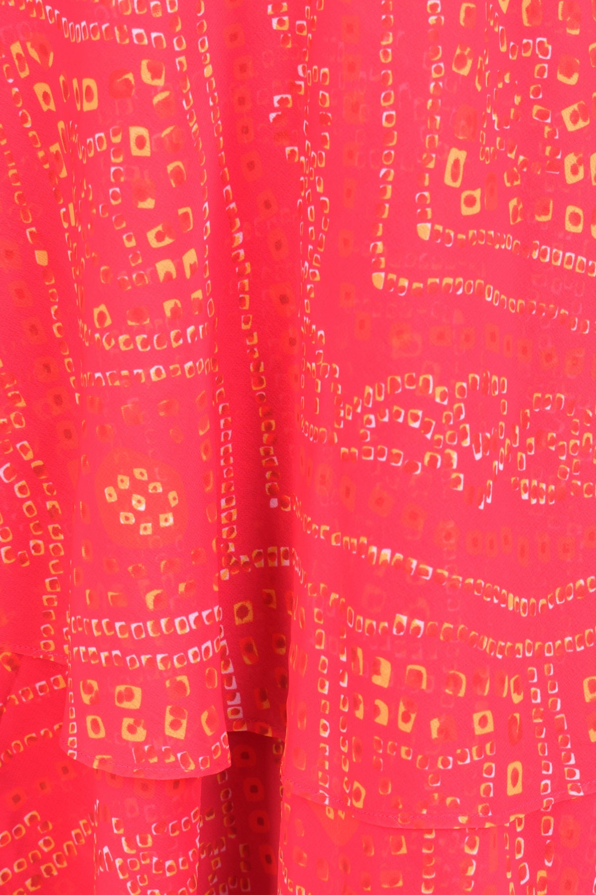 This vibrant two-piece set in a striking red features a tiered skirt crafted from soft georgette, showcasing elegant bandhani patterns throughout. The matching blouse mirrors the same rich red tone and delicate bandhani detailing, creating a cohesive look. Lightweight and flowy, this two piece set is perfect for summer days.