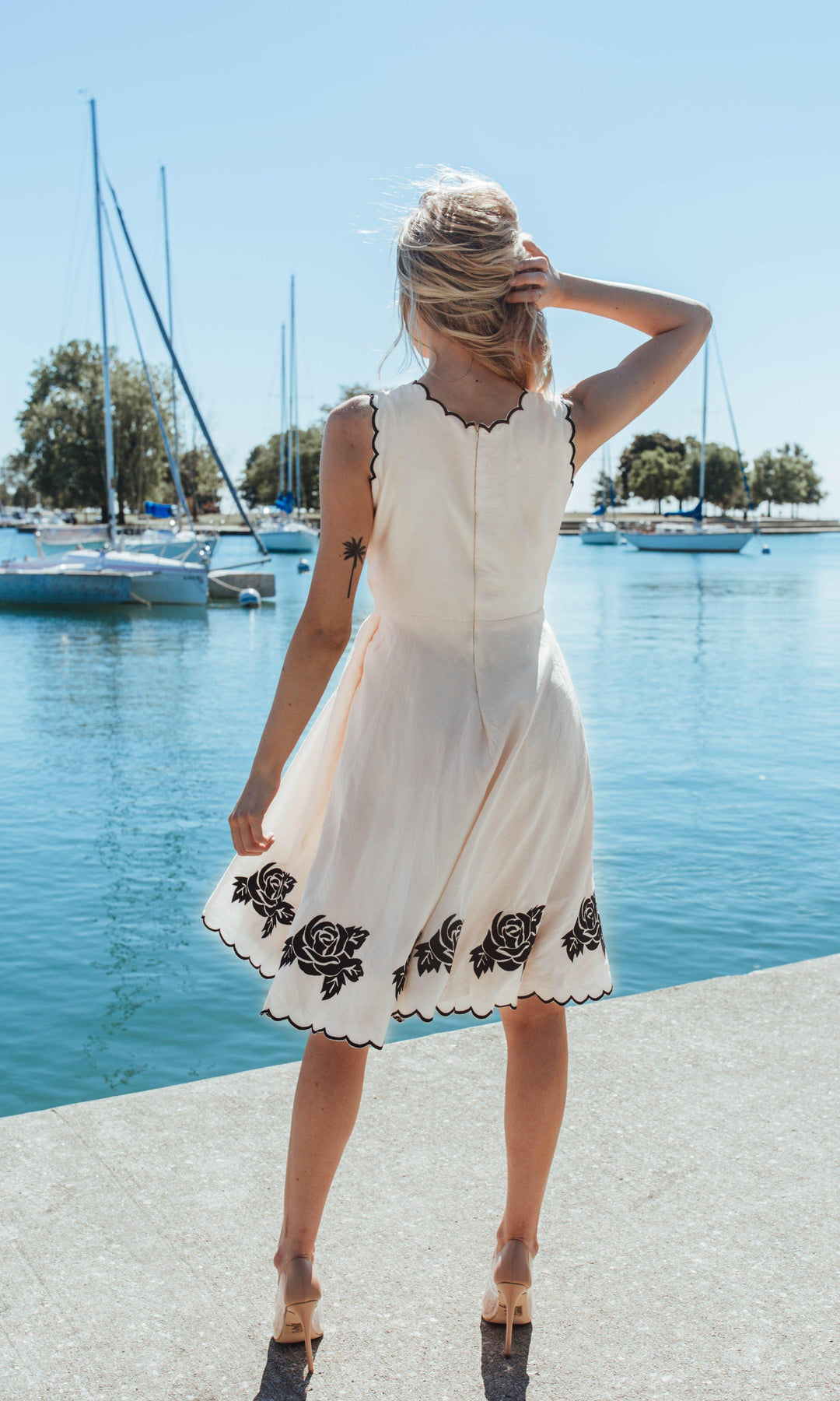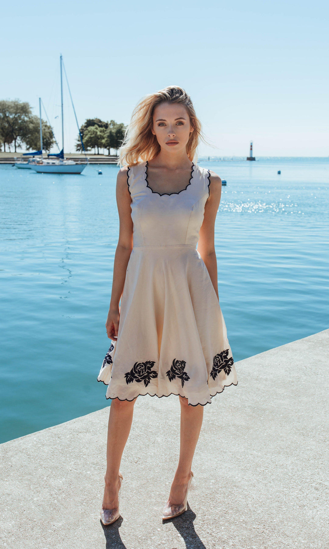 - Specifications: Fully lined, sleeveless, fit and flare silhouette, embroidered, flared hemline
