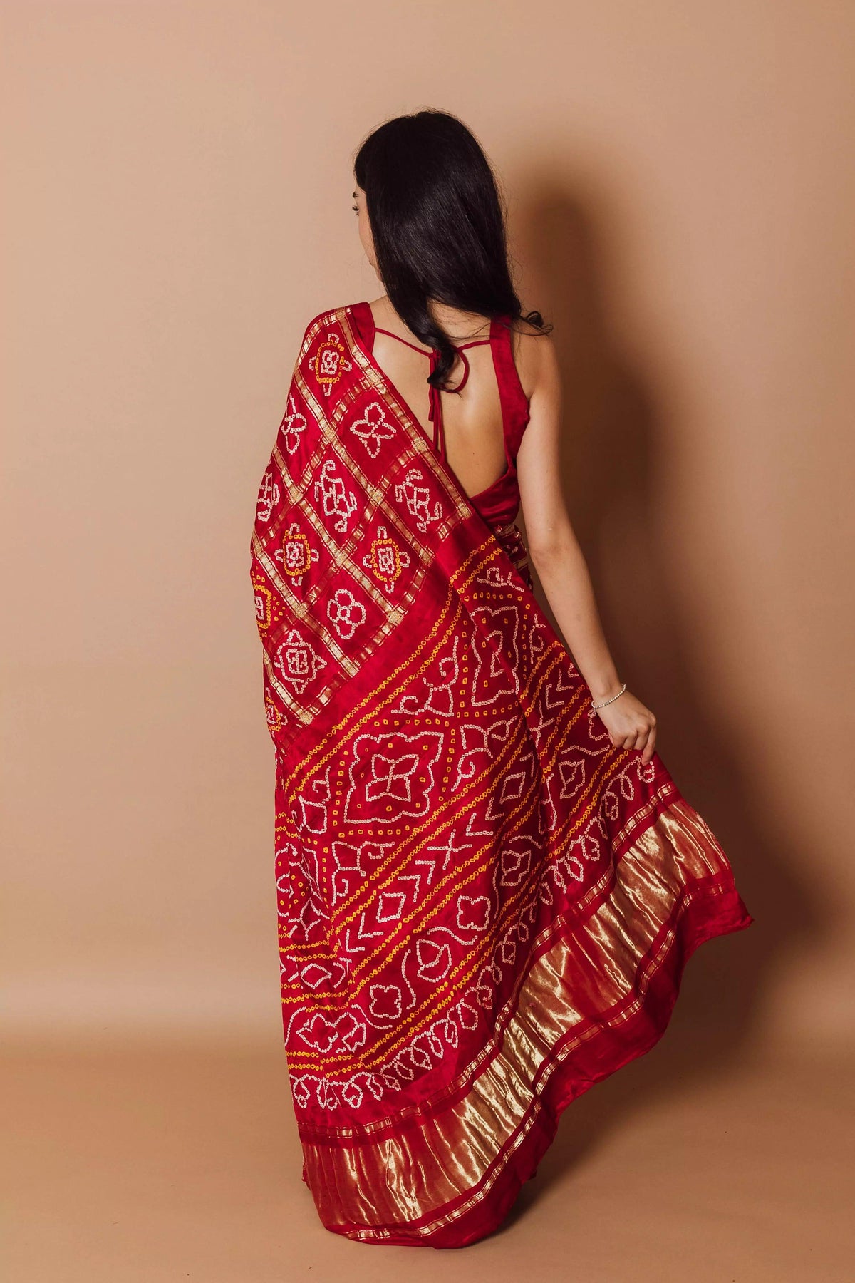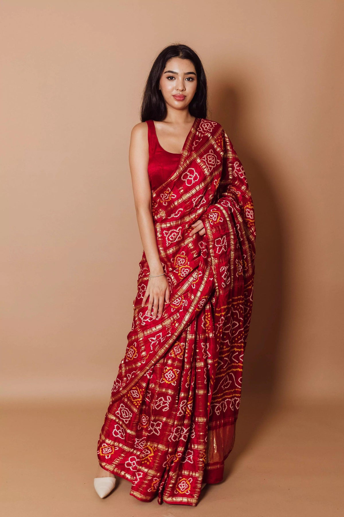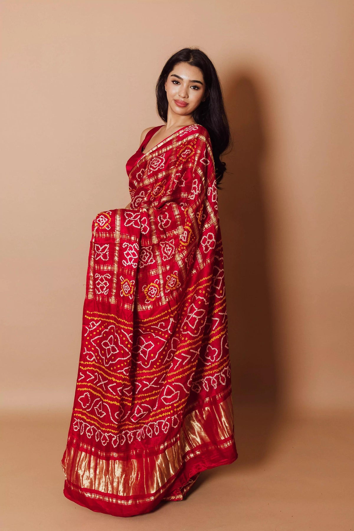 This hand bandhej gaji saree is a premium piece boasting intricate details for a stylish look, perfect for wedding wear, formal events or evening wear. The outfit is paired with an accompanying blouse for a classic effect.