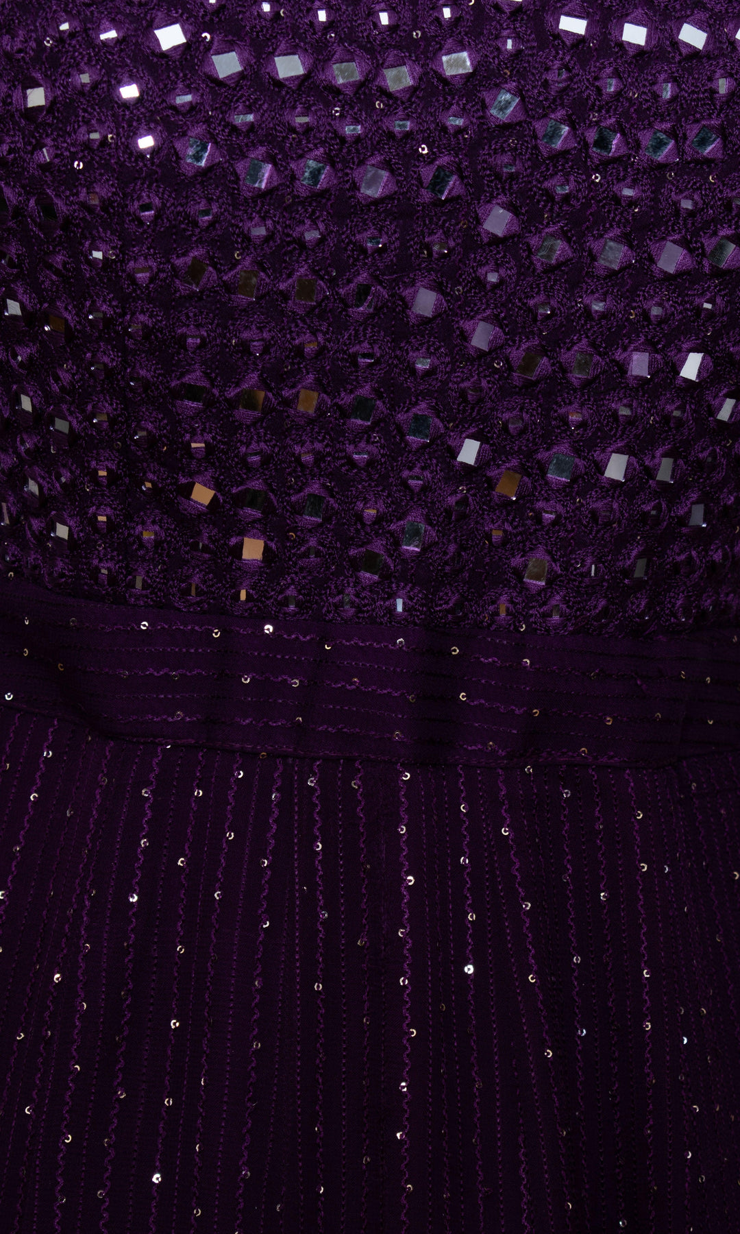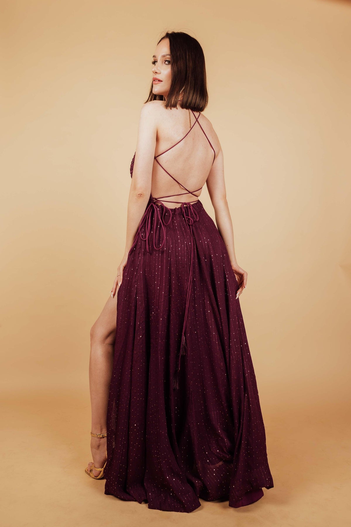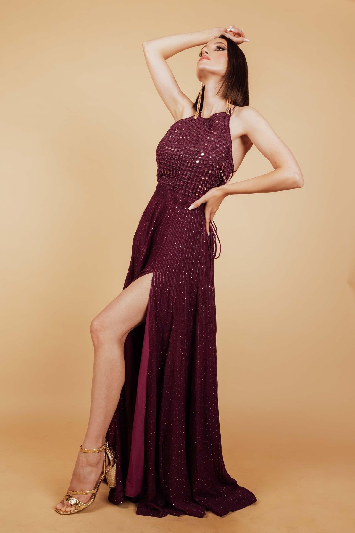 Elevate your style with the Astra Gown, designed to dazzle with its intricate details and bold design. Crafted from high-quality georgette in a rich wine hue, the gown features an embroidered torso adorned with all-over mirror work, adding sparkle to every step. The lower half of the gown showcases all-over sequins work, exuding glamour and elegance. A front slit and open back complete the modern look of the Astra Gown.