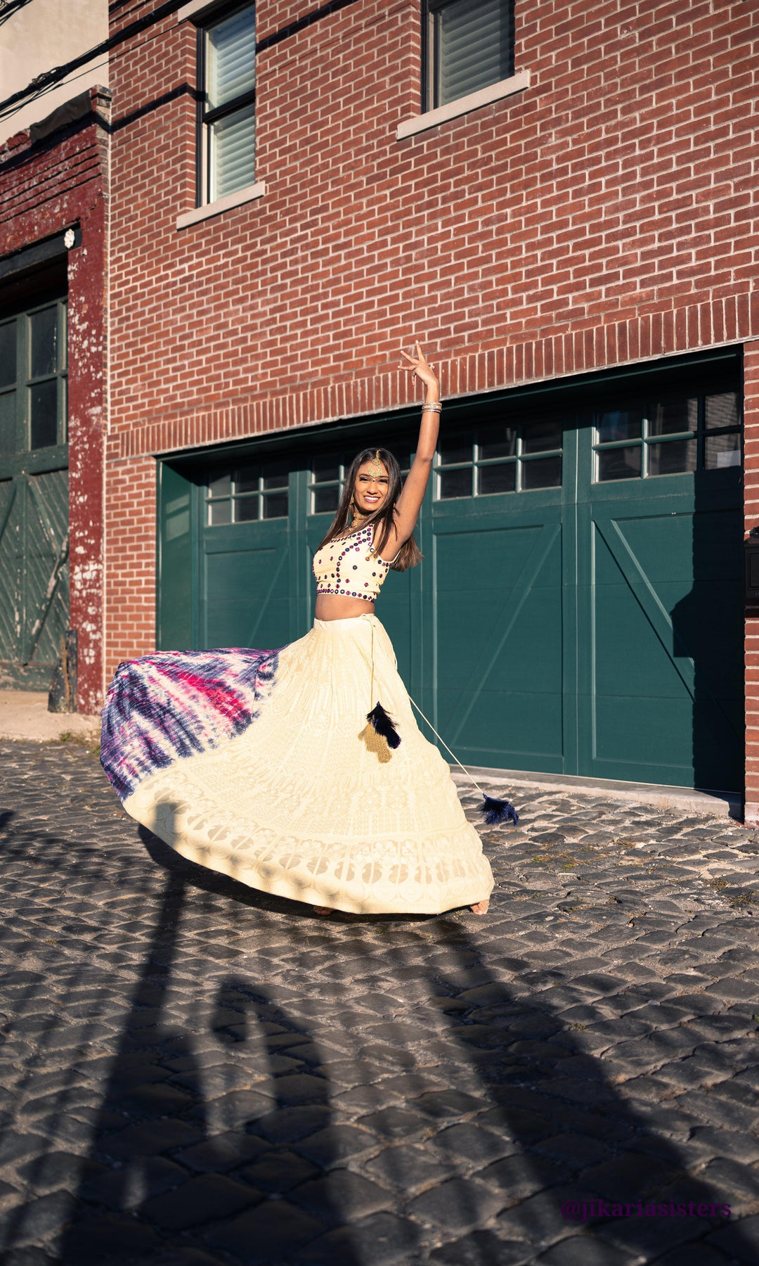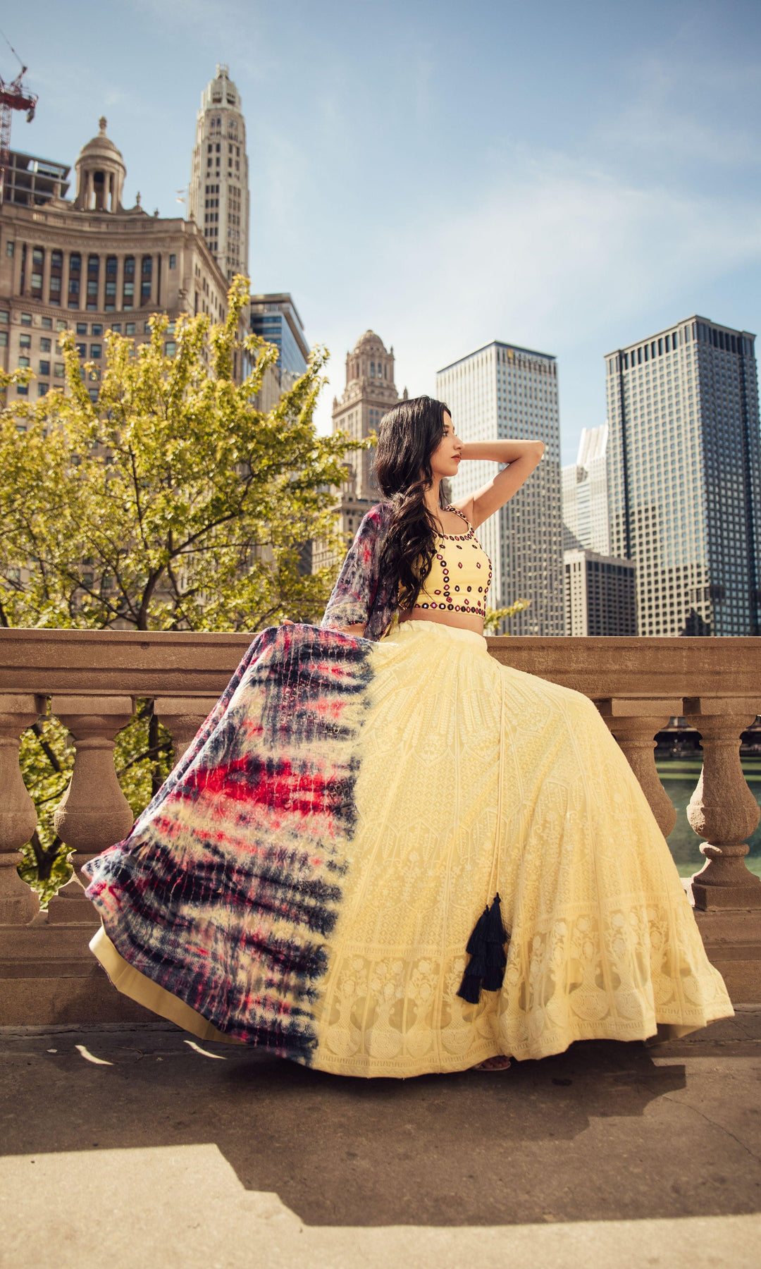 Awaken the diva within and shine brightly in this gorgeous Anastasia Tie-Dye Lehenga Choli Set. Crafted from luxurious georgette fabric, this lehenga boasts vibrant tropical hues and a lively tie-dye pattern designed for both comfort and style. The lehenga features a flattering A-line silhouette, with intricate chikankari embroidery that adds texture and charm. The blouse is beautifully paired with mirror work and colorful embellishments, which tie in perfectly with the details of the lehenga. The yellow tie-dye lehenga choli set is completed with an elegant georgette dupatta, which adds a refined touch to the exuberant colors.