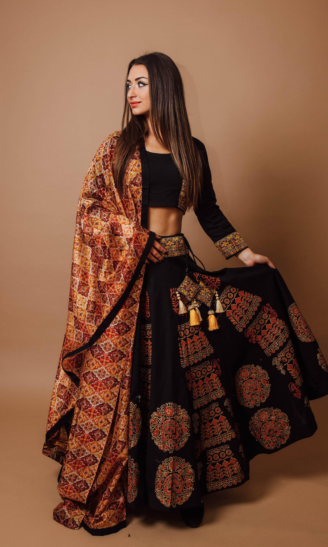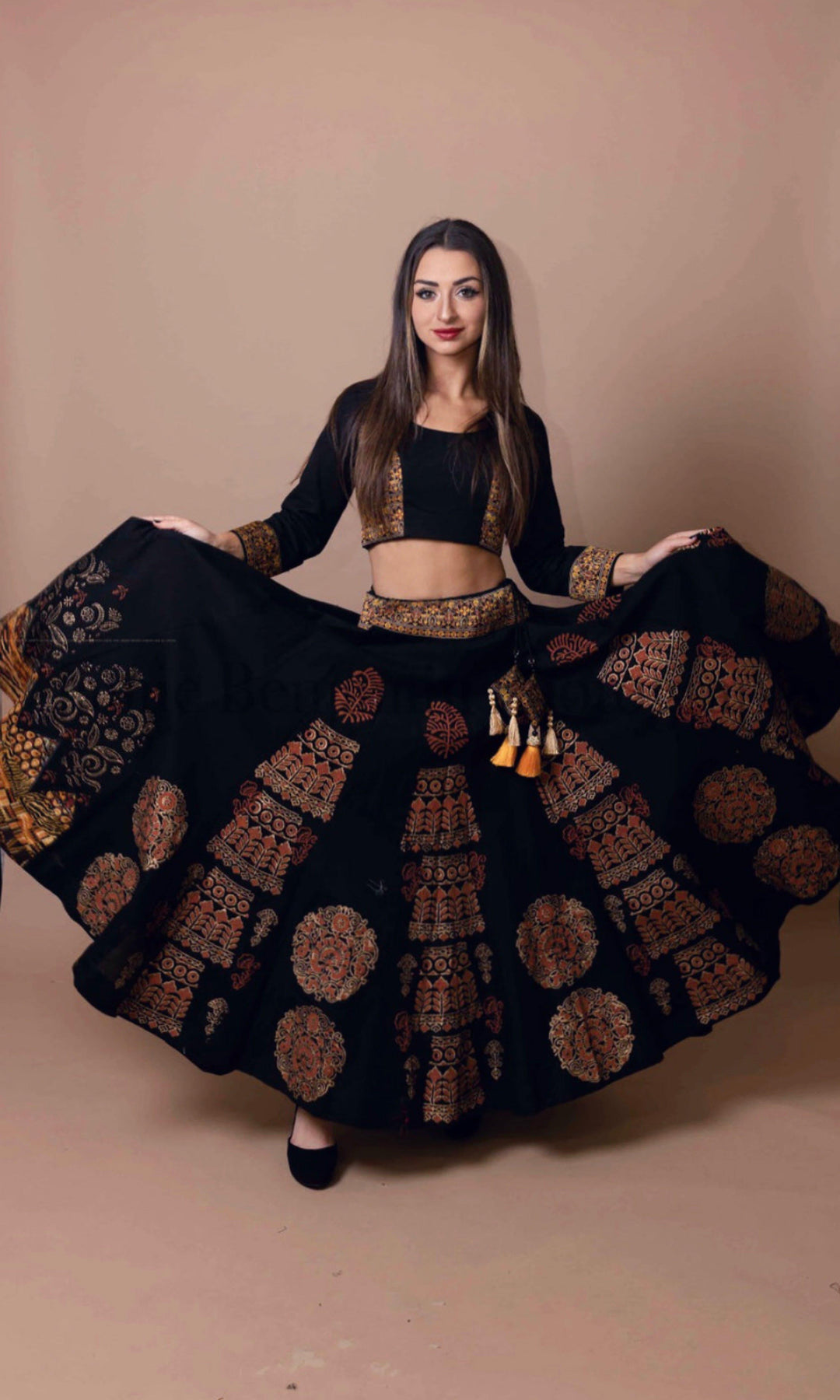 The Veruca Chaniya Choli Set strikes the perfect balance between subtlety and boldness. The full-flare black lehenga, crafted from lightweight cotton, features ethnic block prints and silk-patchwork that create a timeless appeal. Enhancing its statement look is an in-built embroidered belt.