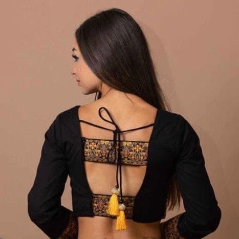 - Blouse: Embroidered, long sleeves, back closure with string tie, fully lined