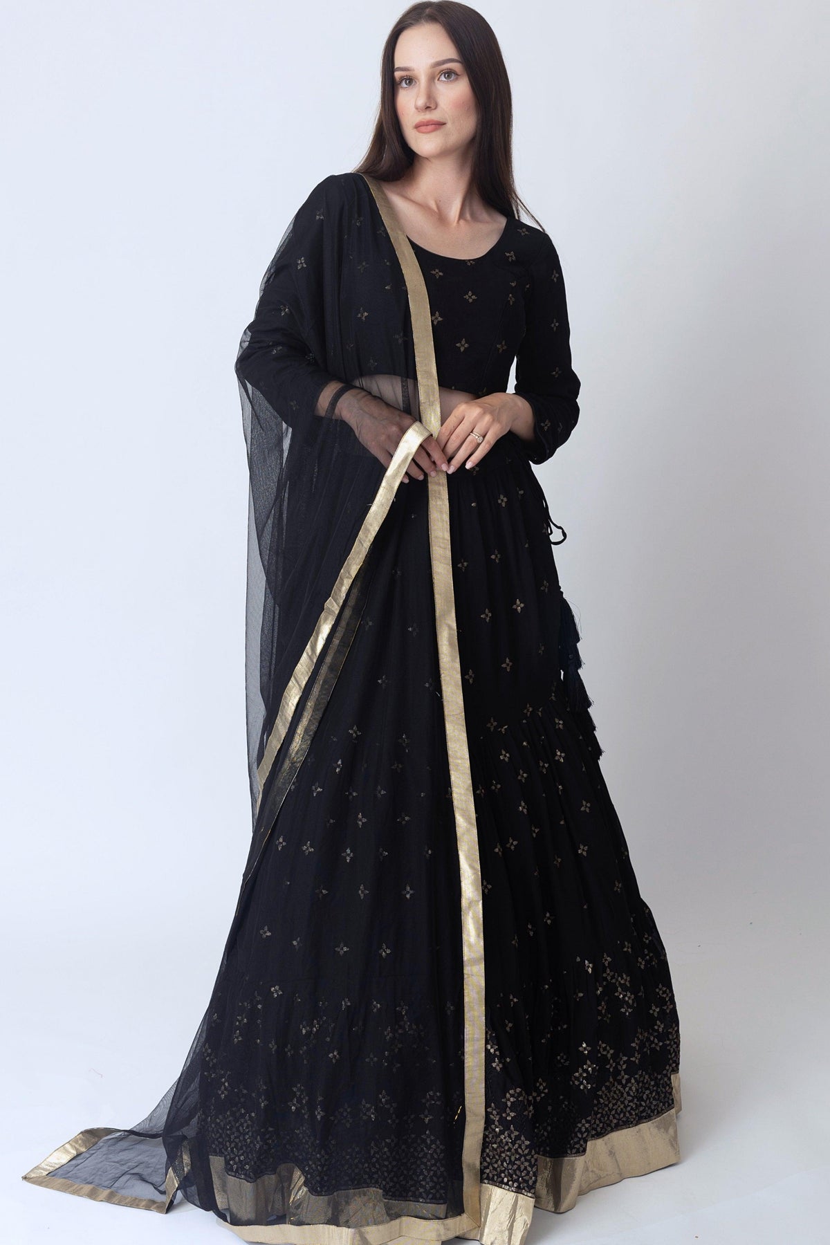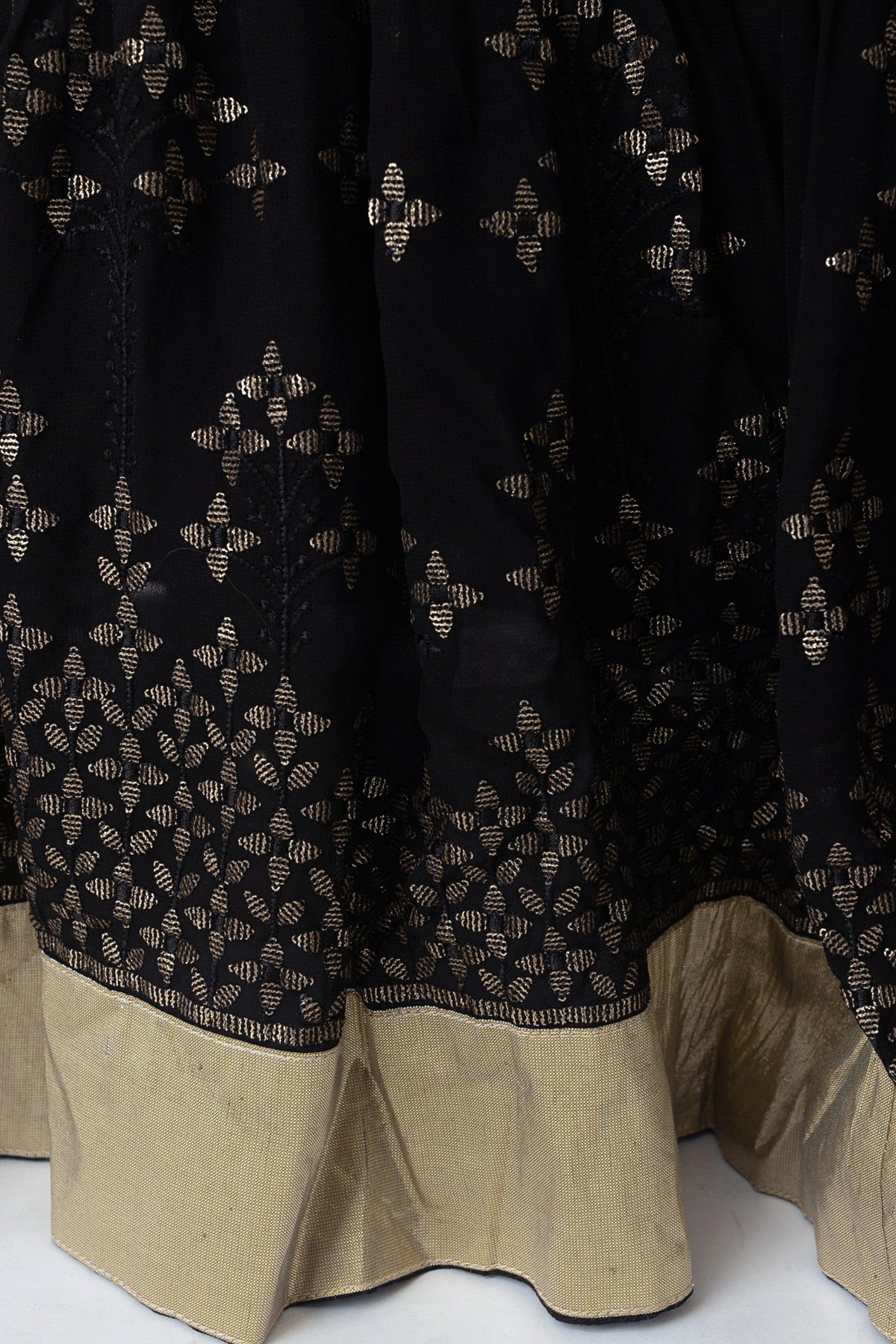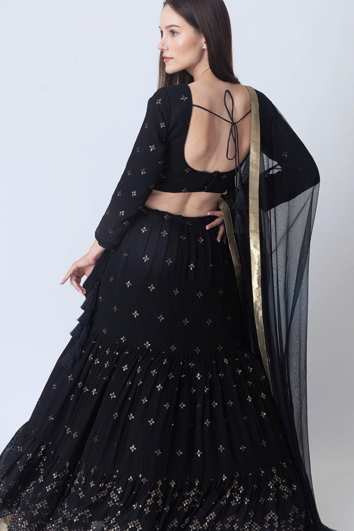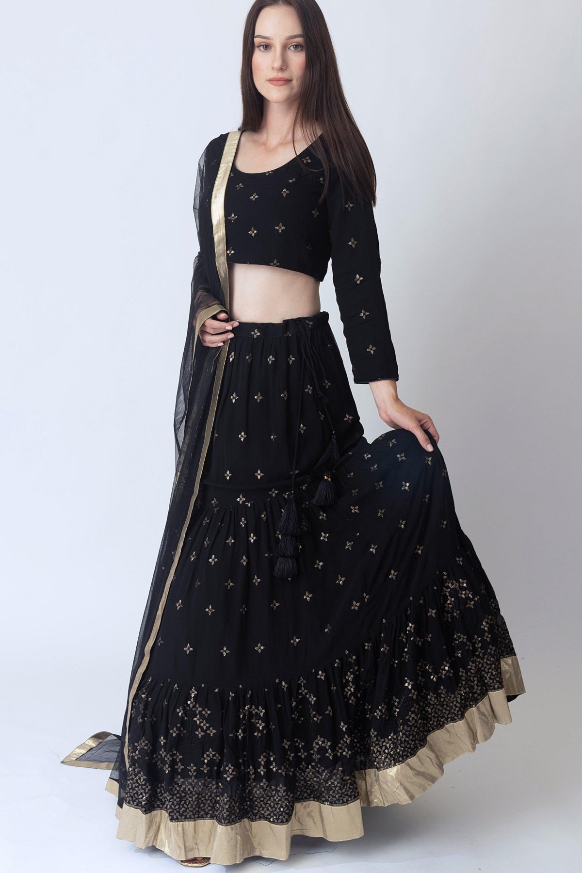 This luxurious Georgette Asha Black Lehenga Choli Set is a refined choice for special occasions that call for classy look. The black lehenga, crafted from premium georgette, features intricate all-over gold sequins embroidery. Complementing the lehenga is a matching georgette blouse adorned with coordinating all-over gold sequins embroidery to create a harmonious look. The Asha Lehenga Choli set is completed with a black net dupatta that is beautifully accented with a golden border that echoes the detailed border of the lehenga. The rich interplay of black and gold, combined with the premium georgette fabric, ensures a flattering fit and an effortlessly classy appearance.