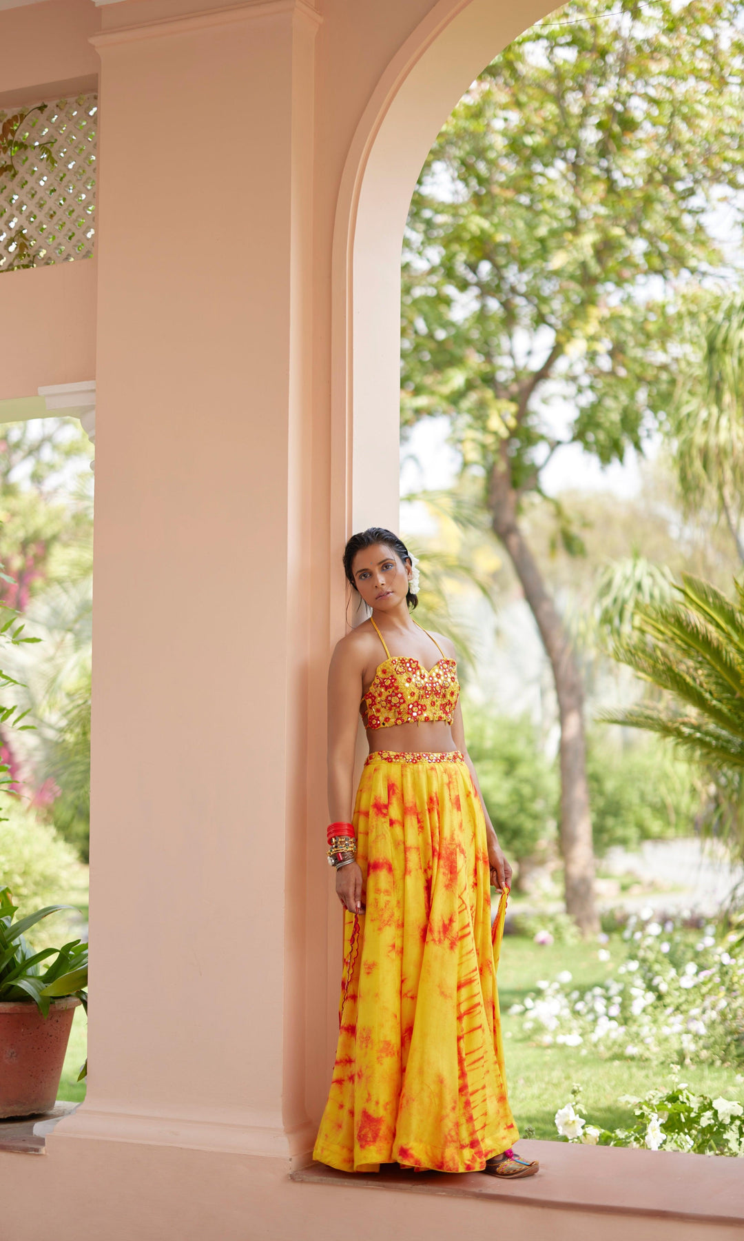 Make a bold and stylish statement at your next special occasion with the Yellow Tie-Dye Lehenga Choli. Crafted from luxurious silk fabric, this lehenga features an elegant slit design, creating a striking silhouette that will turn heads wherever you go. The intricate embroidery on the blouse adds a touch of sophistication, while the sleeveless cut and open-back design offer a contemporary, flattering fit. Perfect for weddings, receptions, or festive events, this ensemble combines traditional craftsmanship with modern style, ensuring you stand out in style and confidence. 3 week delivery