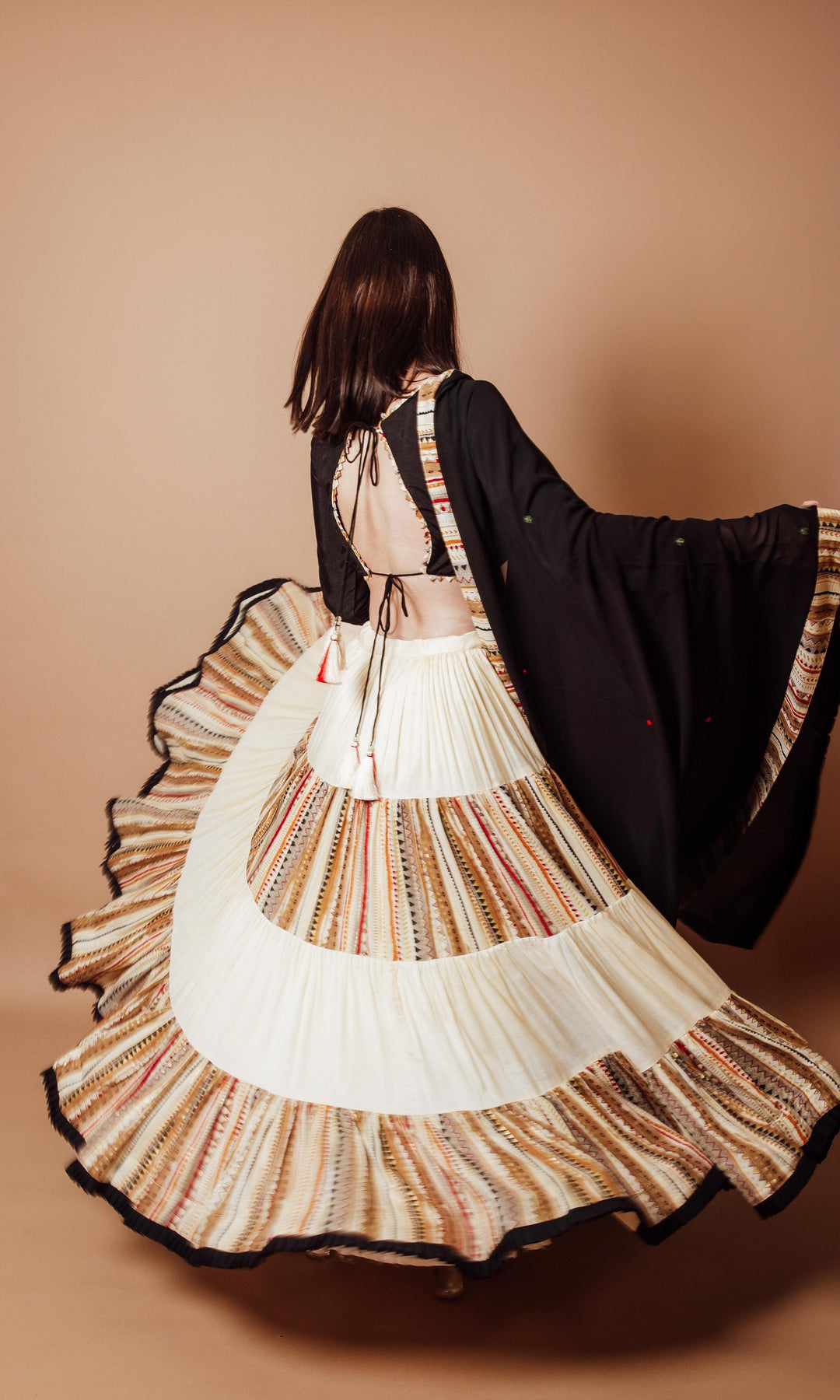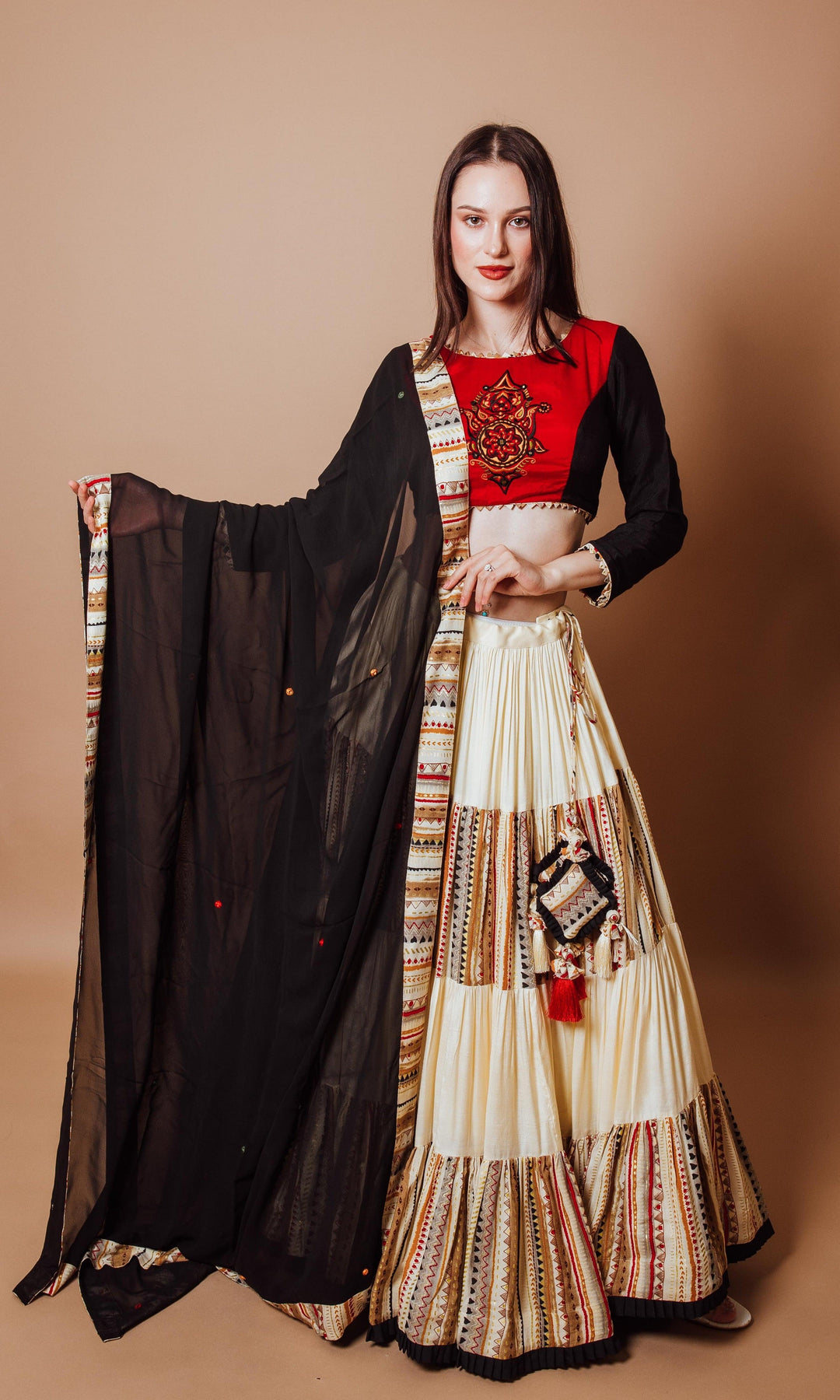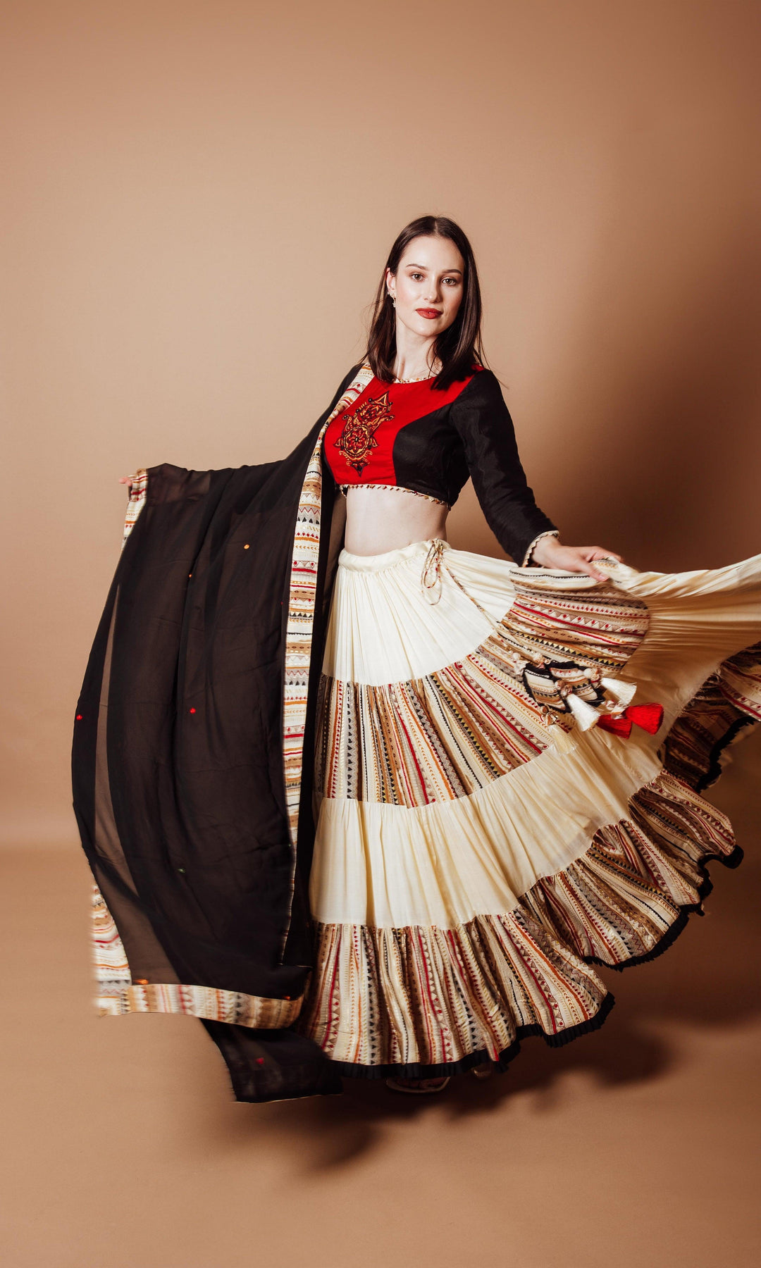 Crafted from cotton, the Izel Multi-Color Tier Chaniya Choli set is a masterpiece of royal embroidery and exquisite craftsmanship. The off-white tiered lehenga, featuring a vibrant print and a stunning 12-15 meter flare, creates a dramatic silhouette. The blouse contrasts the lehenga beautifully with its rich black and red hues to add depth to the ensemble. The Izel Mult-Color Lehenga Choli set is completed with a black georgette dupatta containing intricate all-over butti work. The Izel Chaniya Choli set is perfect for twirling gracefully at any special occasion with its extensive flare and timeless charm.
