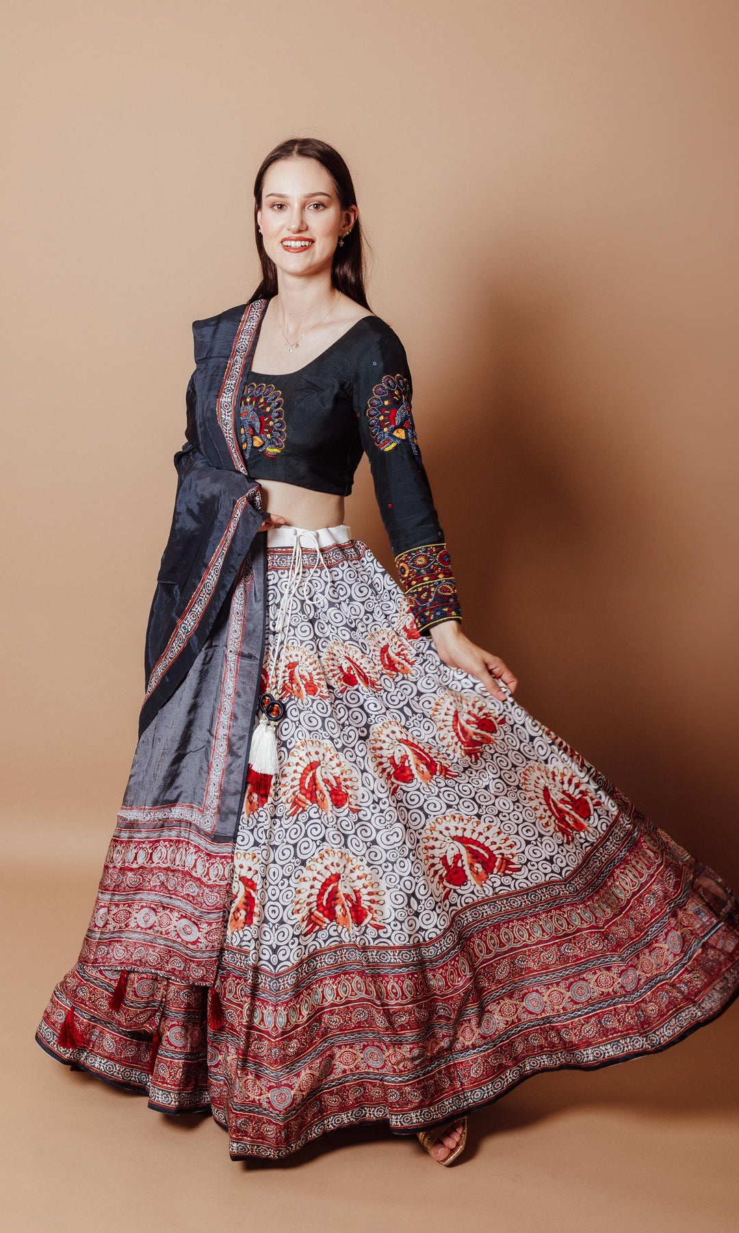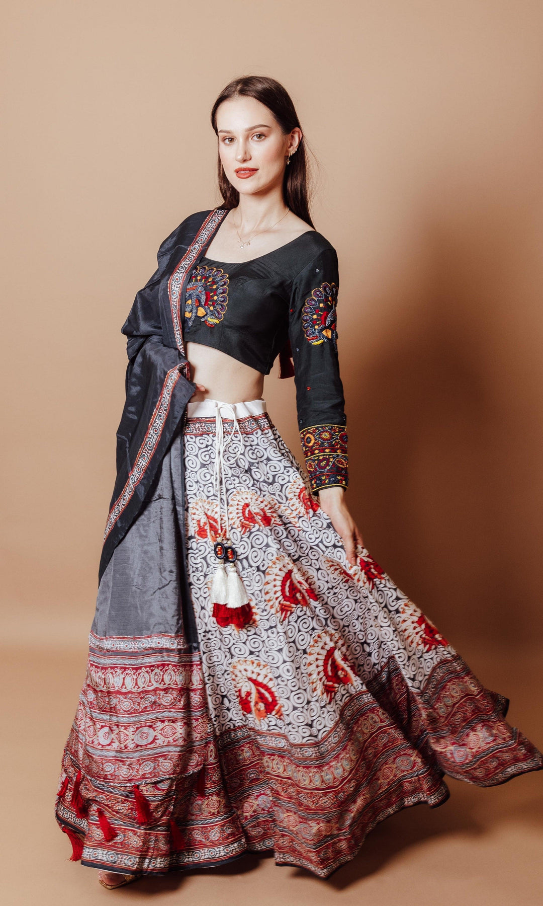 Hand crafted from luxurious fabrics, the Lana lightweight soft silk Lehenga Choli showcases elegance and charm. The set features a beautifully handworked full-sleeve blouse with intricate embroidery, paired with a printed silk dupatta radiating regal sophistication. This ensemble's combination of contemporary finesse with timeless appeal makes it perfect for any grand occasion.