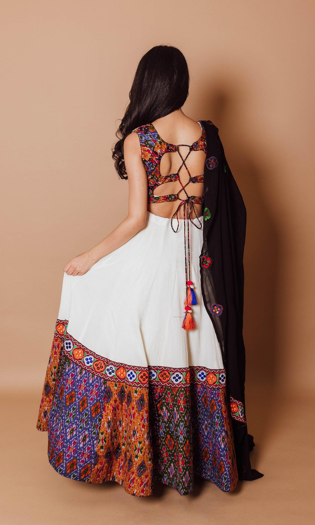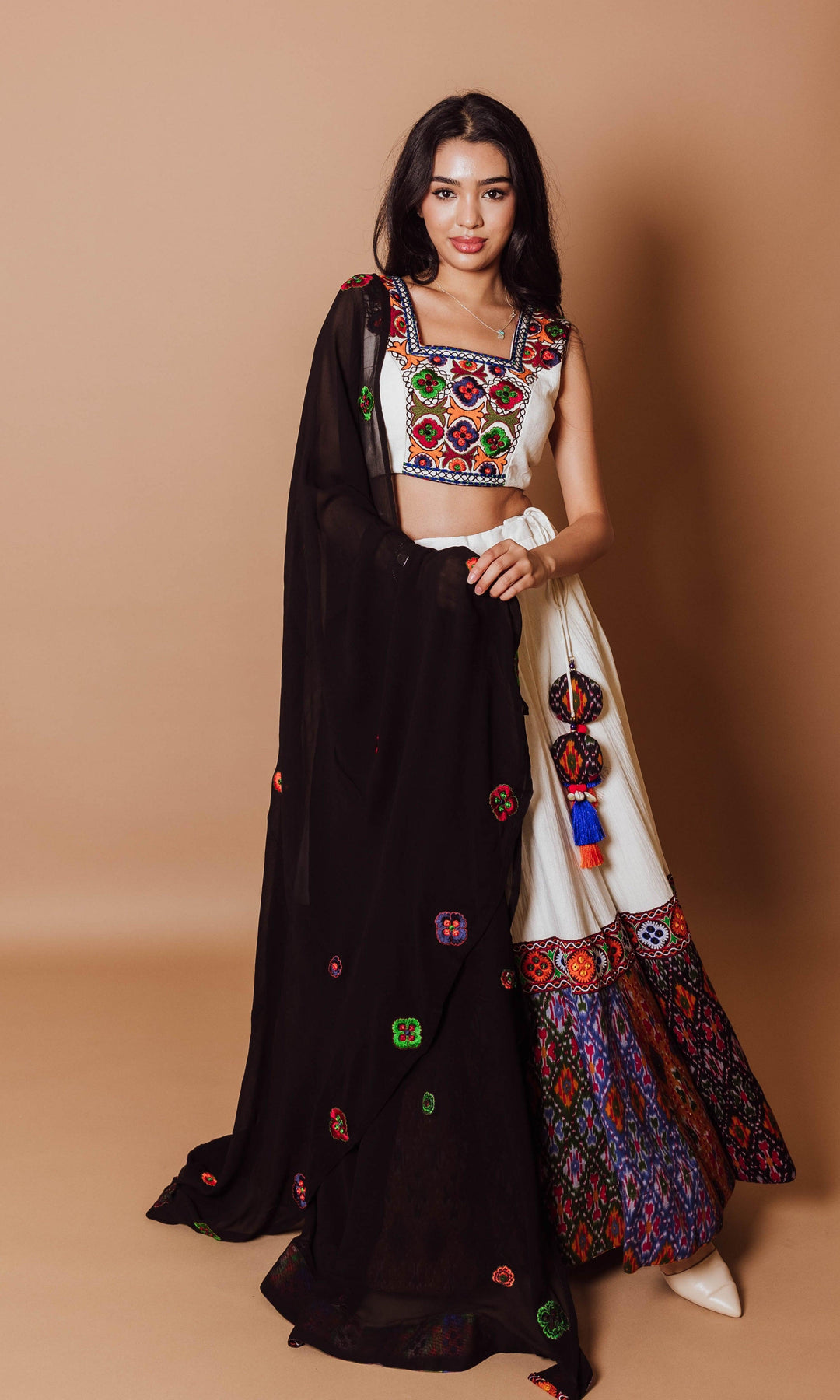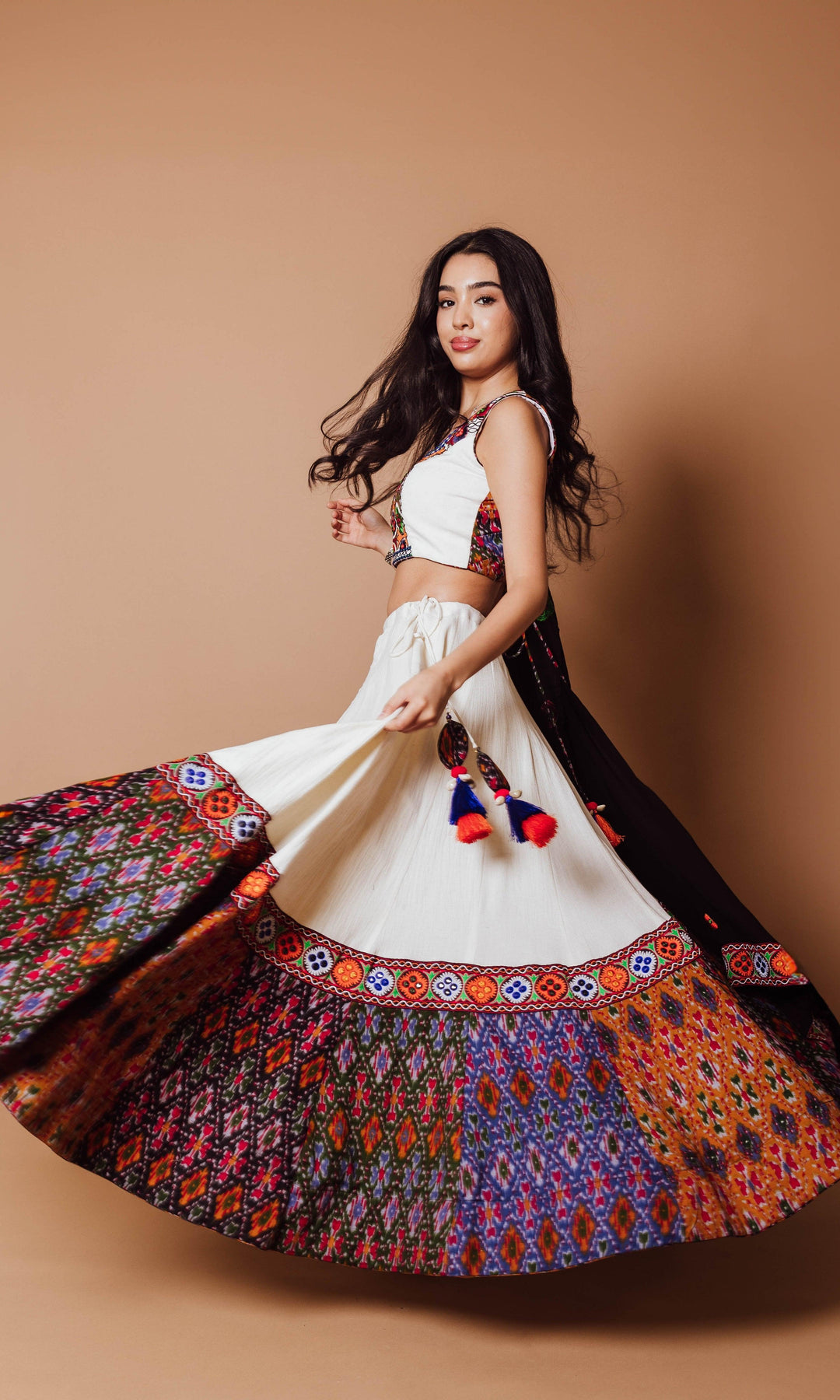 Crafted from cotton, the Andi Full Flare Chaniya Choli features intricate embroidery, mirror work, and kutch work trim along with a beautiful ikkat border. The accompanying blouse and the georgette dupatta are adorned with delicate embroidery, lending a majestic aura to the outfit. This stunning Chaniya Choli set is a perfect choice for Navratri and festive celebrations, bringing traditional charm with a contemporary touch. Border May vary. Delivery 3 weeks.
