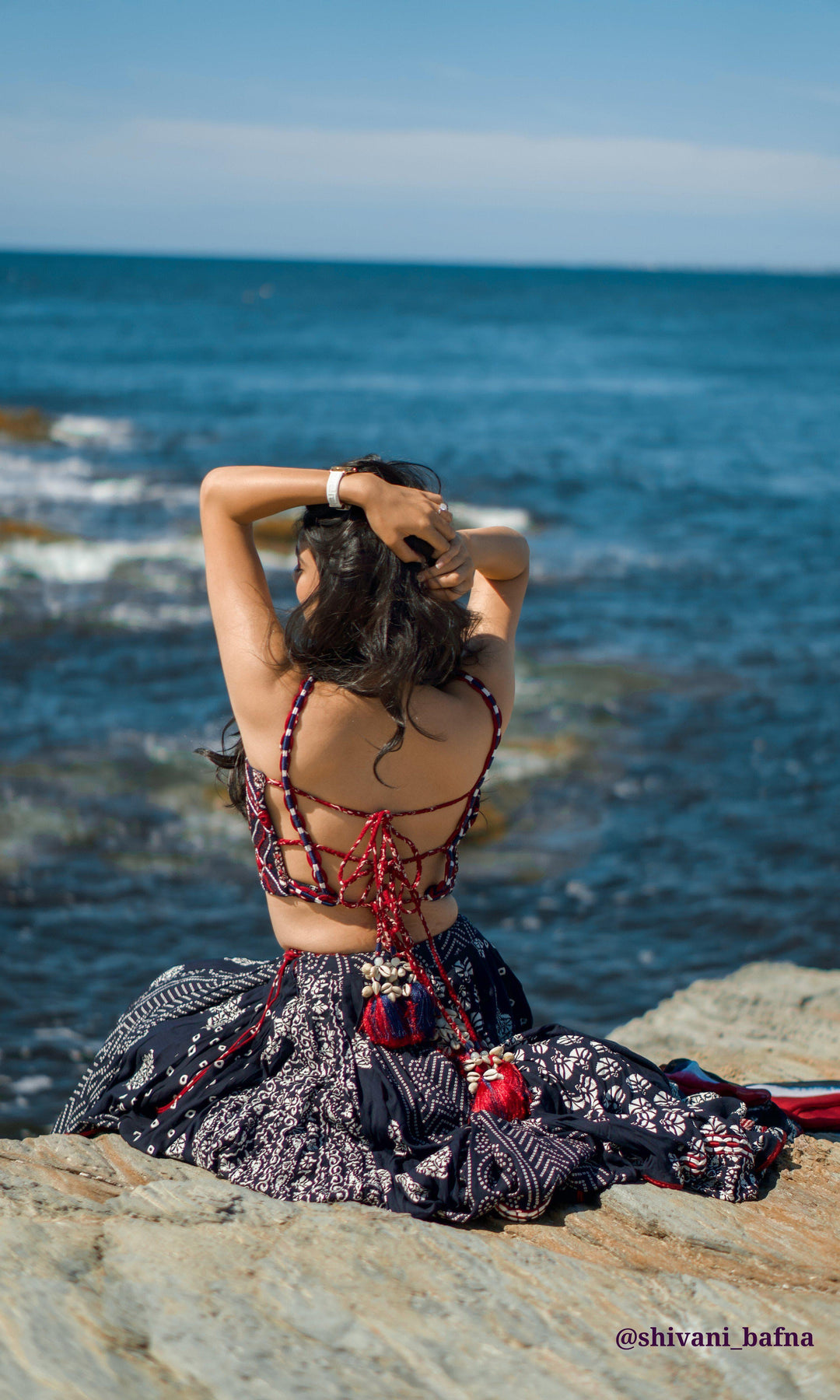 - Blouse: Sleeveless, embroidered with mirror & thread work, fully lined, open back with string tie