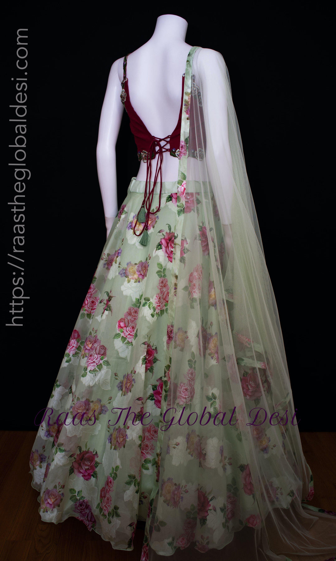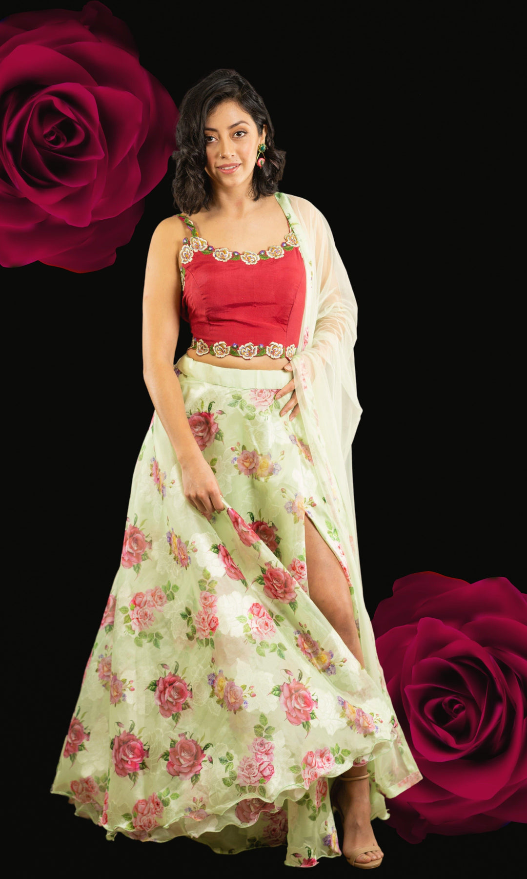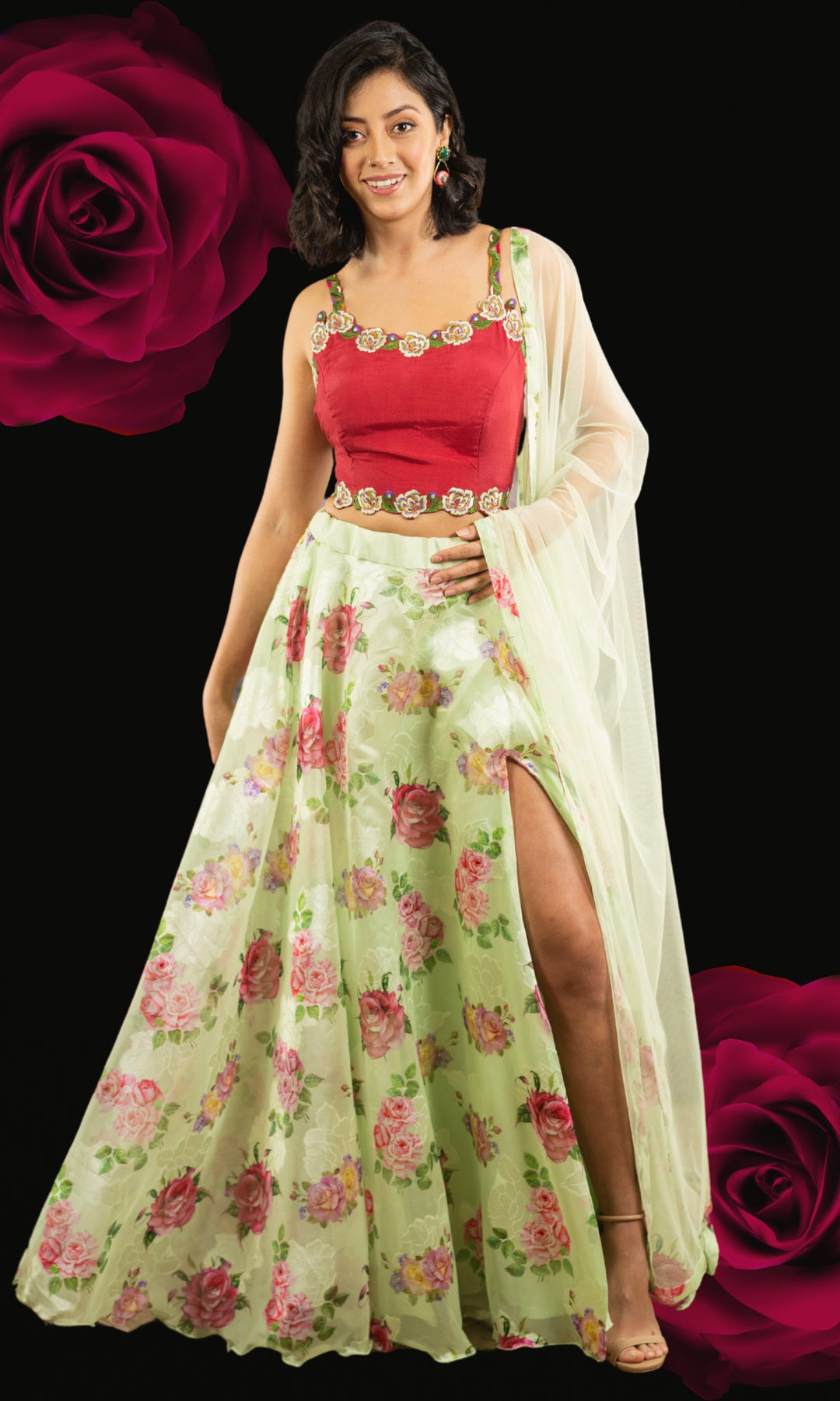 - Fabric: Organza (Lehenga), Silk (Blouse), & Net (Dupatta)
