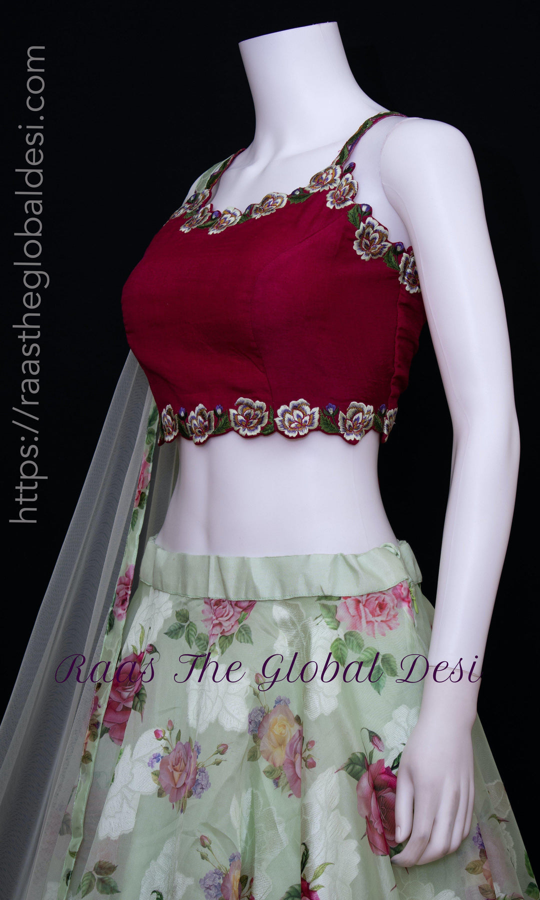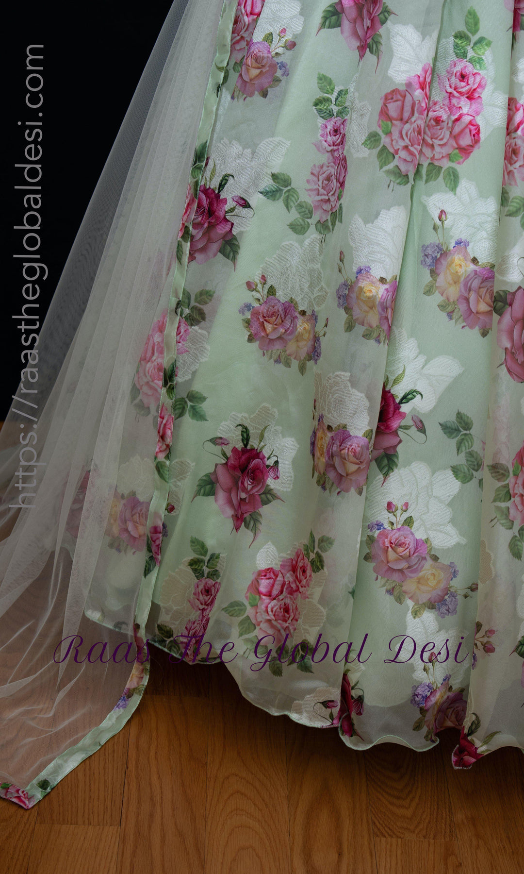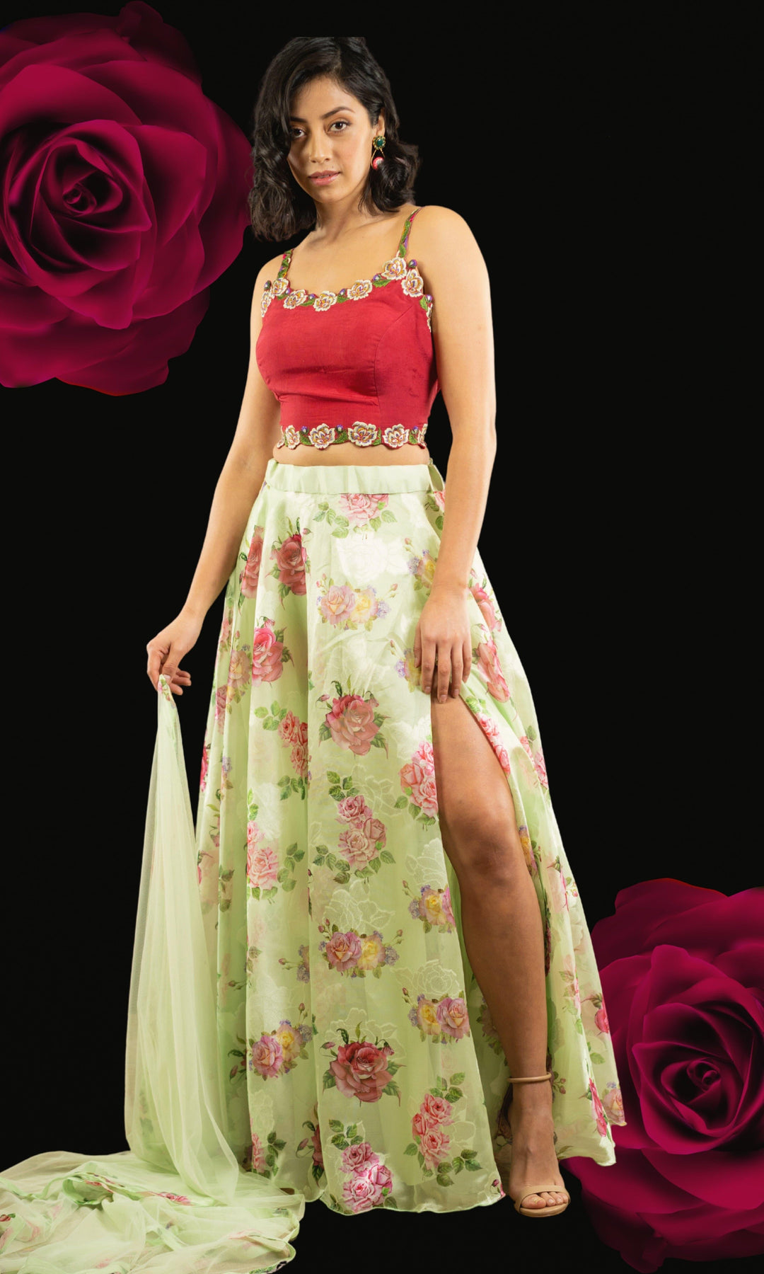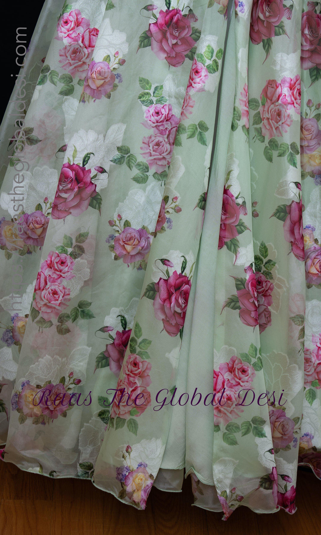 - Fabric: Organza (Lehenga), Silk (Blouse), & Net (Dupatta)