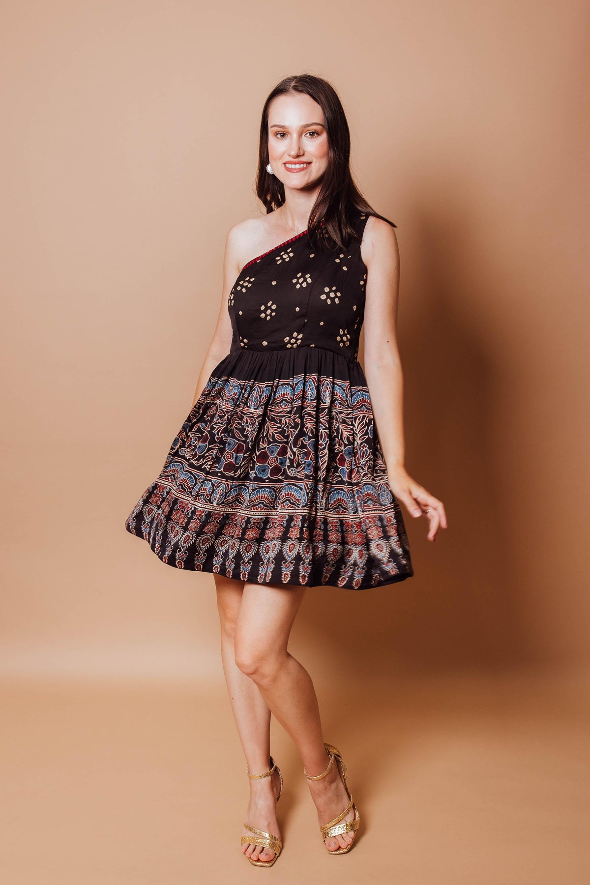 The Olivia Black One-Shoulder Dress is a stunning blend of tradition and modernity. Handcrafted from soft modal silk, the Olivia One Shoulder Dress features a striking combination of traditional Ajrakh print and intricate hand-bandhej detailing on the torso. The neckline is adorned with mirror embroidery to add a touch of shimmer to its elegant design. This One Shoulder Dress is perfect for those seeking cozy comfort without compromising on luxurious style.