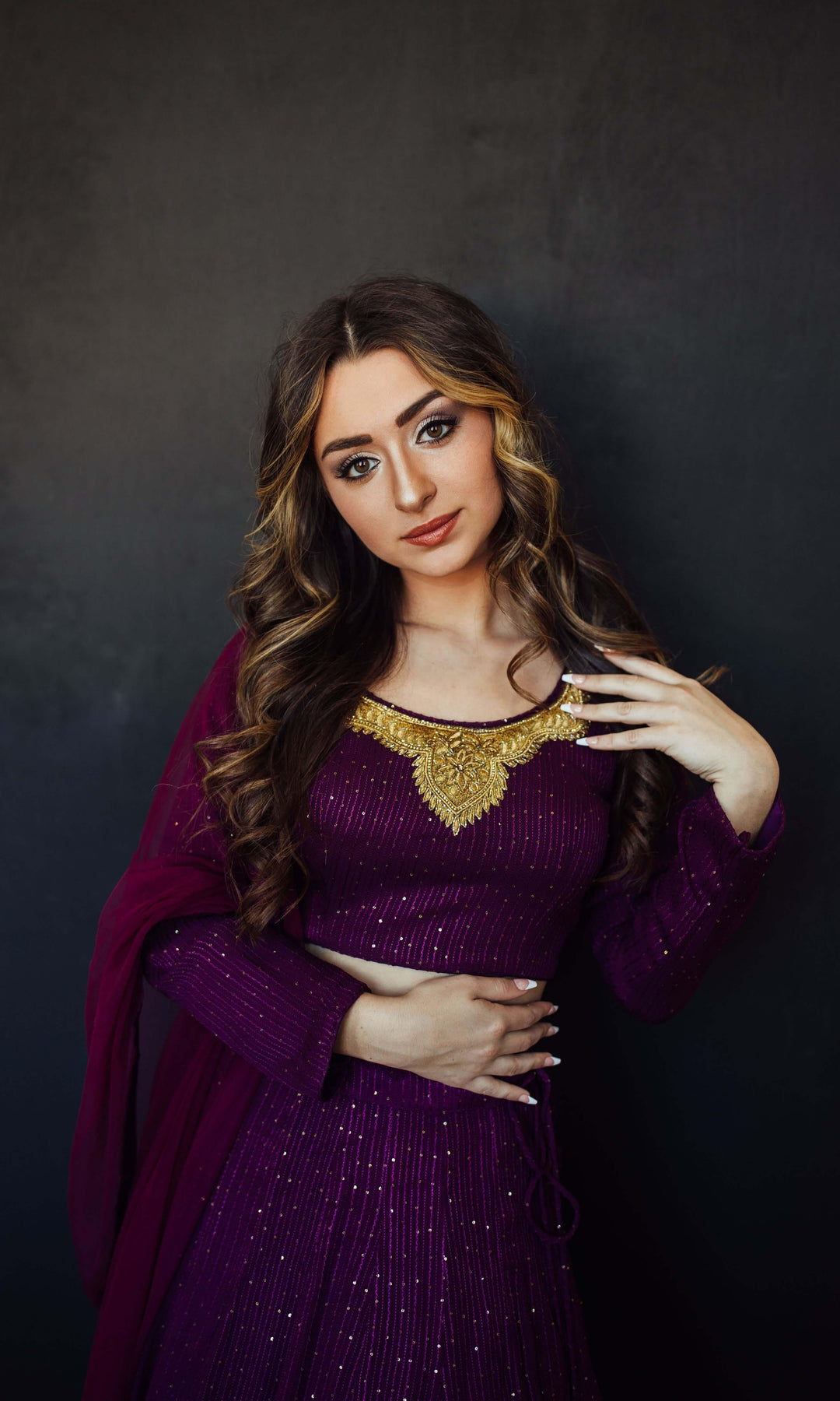 This exquisite Wine and Gold Lehenga Choli is a masterpiece of modern elegance. Crafted from premium georgette and net fabrics, the ensemble features a long-sleeve blouse containing a beautiful hand-embroidered neckline, perfectly complementing the gracefully flowing lehenga. Both Lehenga and Blouse also contain all-over sequins work. The Lehenga Choli Set is completed with a delicate net dupatta, making it a stunning choice for weddings, parties, and festive occasions.