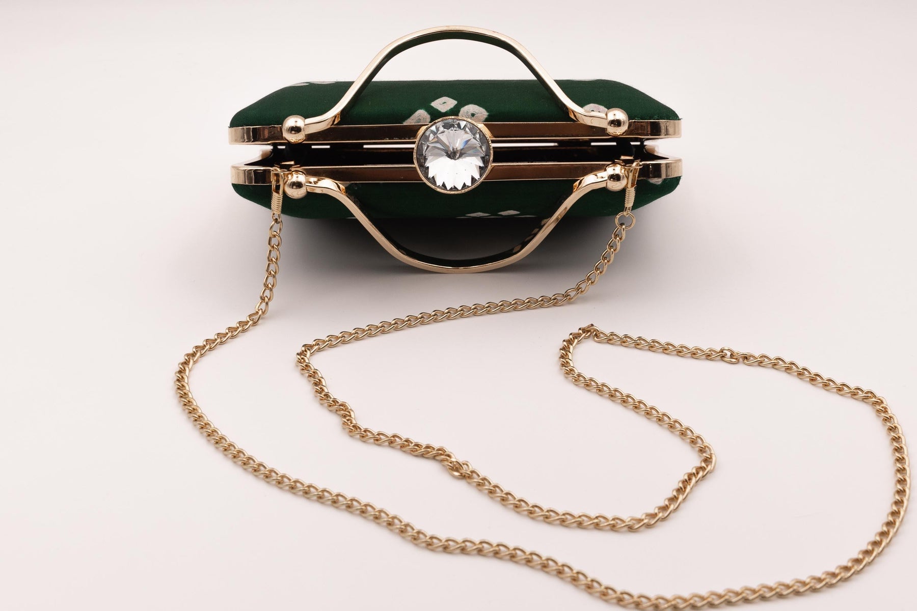 The Bia clutch is a stylish accessory you can hold or wear as a crossbody. Crafted with a metal frame and silk hand bandhej fabric, it's the perfect combination of elegance and durability. The long chain strap is optional, allowing you to customize your look. Metal stand not included
