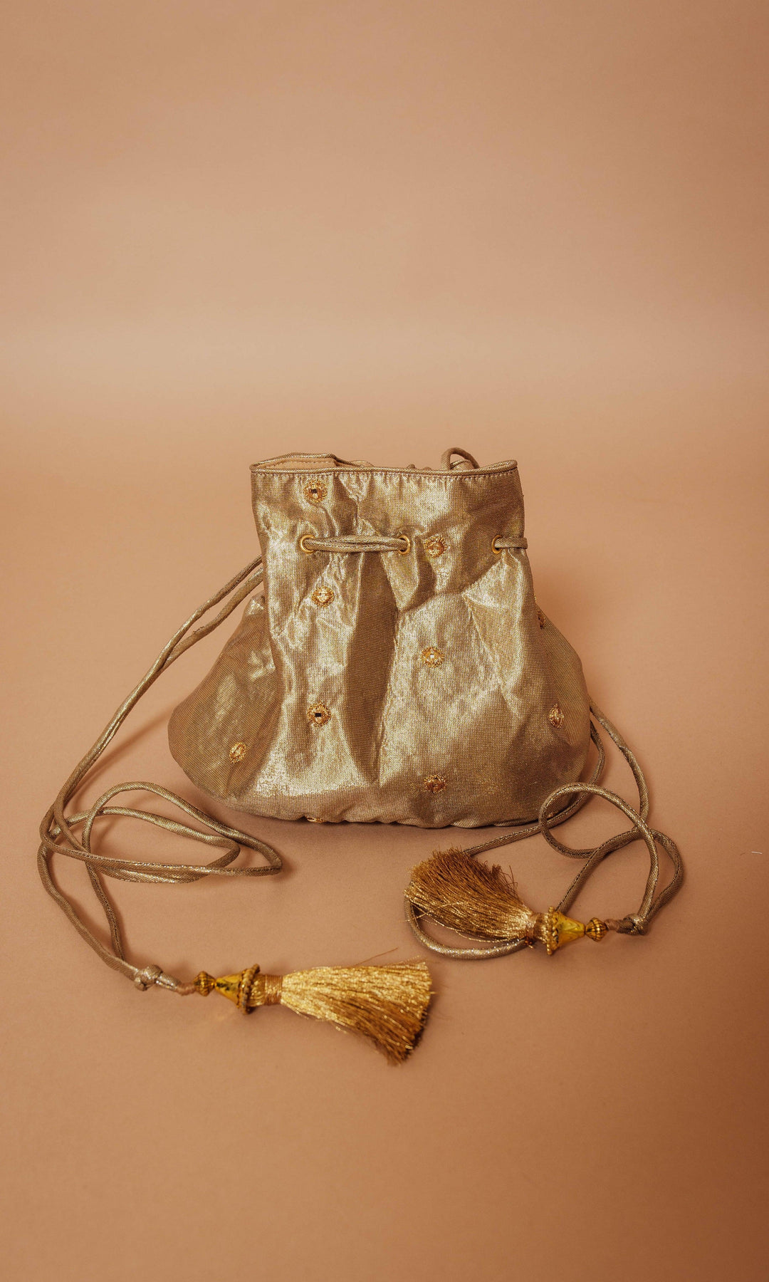 Enhance your ensemble with the luxurious gold potli bag featuring intricate mirror work. Expertly hand-embroidered, this batwa bag is a chic addition to any evening wardrobe. Upgrade your look with this elegant raw silk piece - buy now! Dress not included
