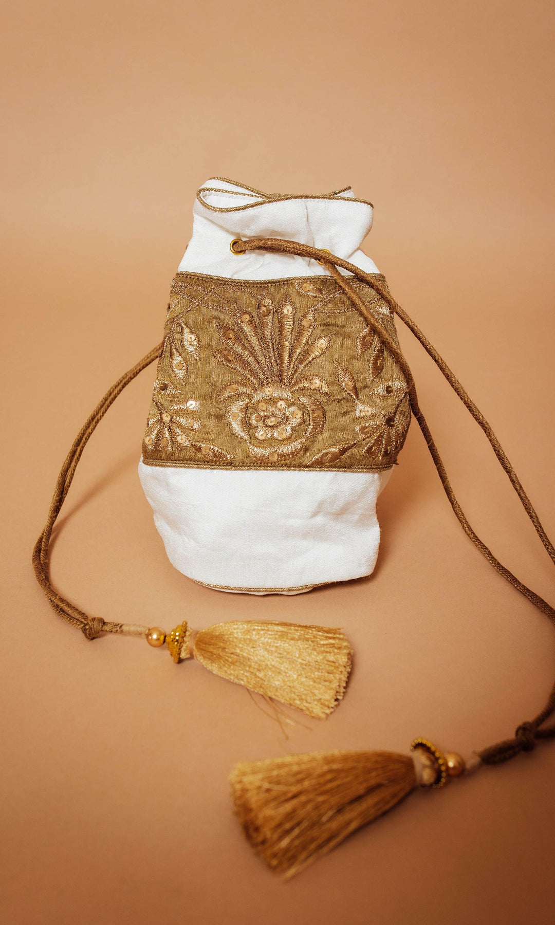 Glamorize your with this white and gold potli bag. Embellished with hand embroidery, this batwa bag will make a stylish statement wherever you go. Find the perfect accessory for your next evening ensemble with this raw silk piece.