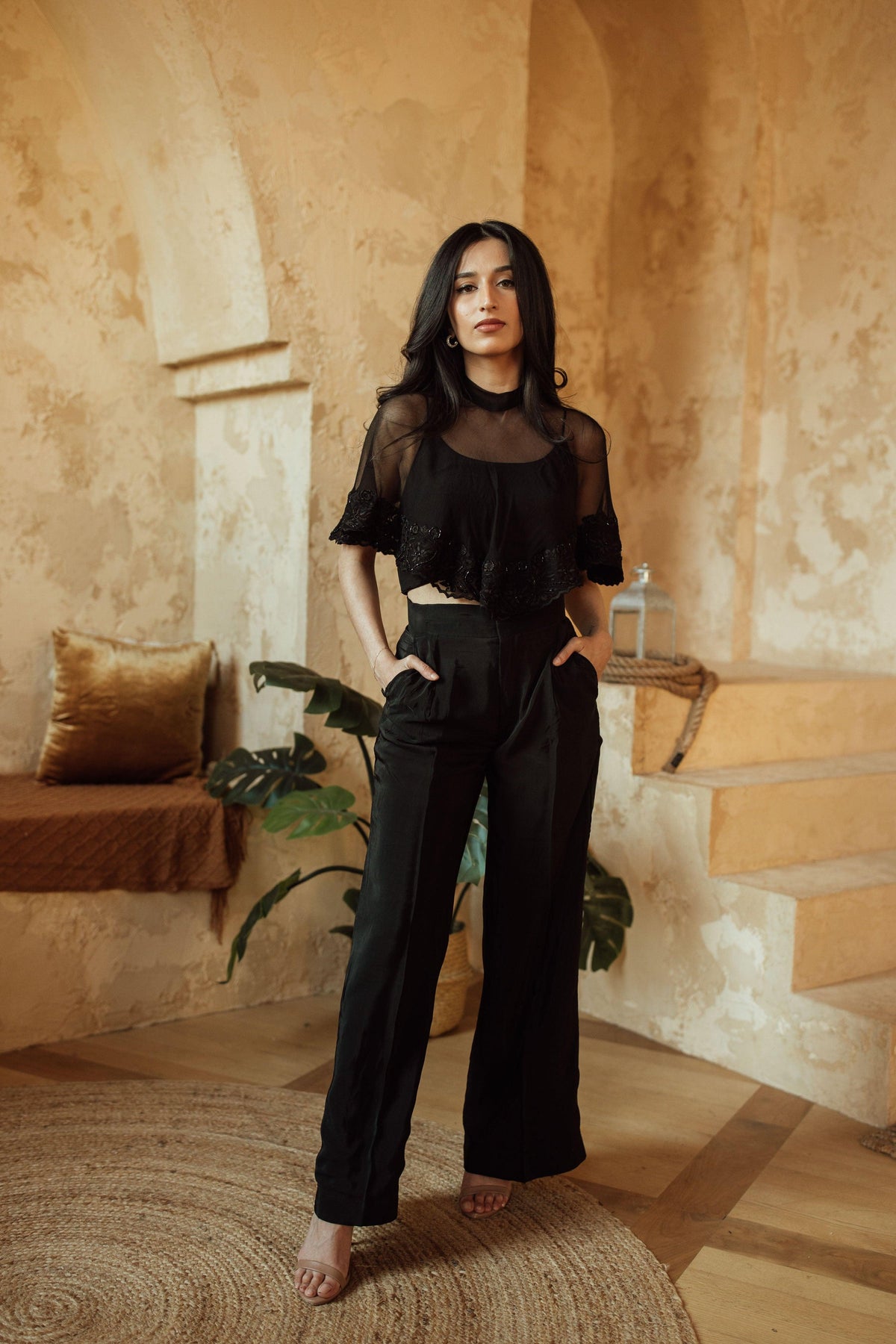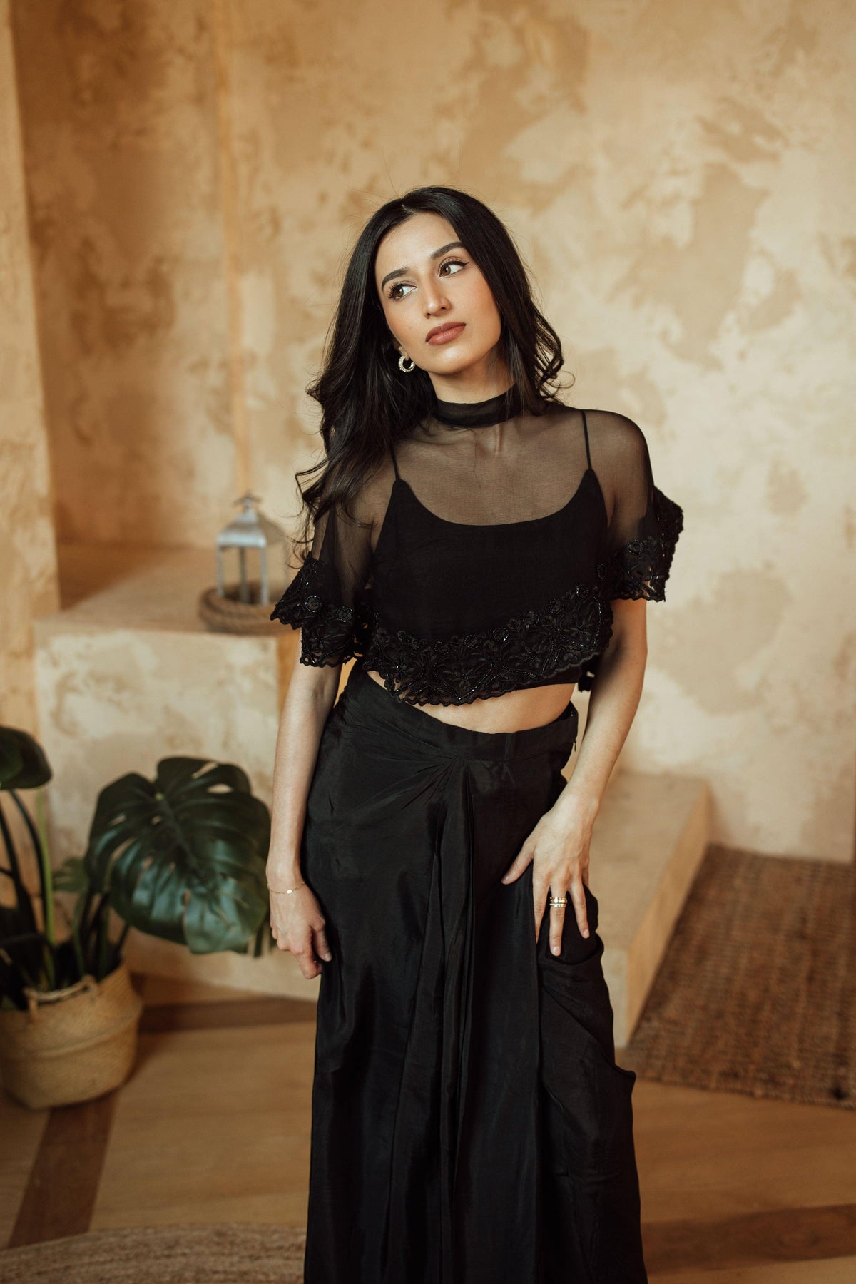 Crafted from lightweight chiffon, the Kai Cape offers a delicate addition to any outfit. The sheer material is adorned with intricate embroidery along the edges.