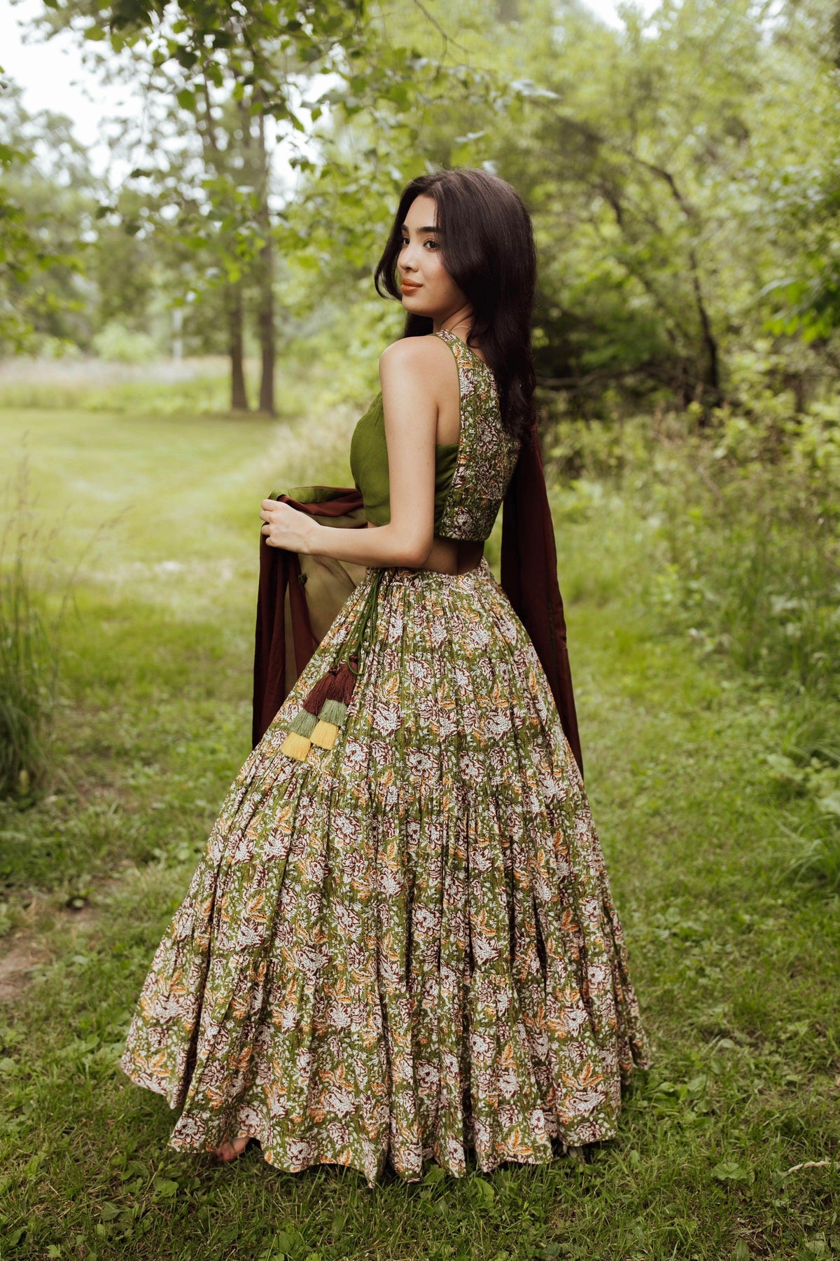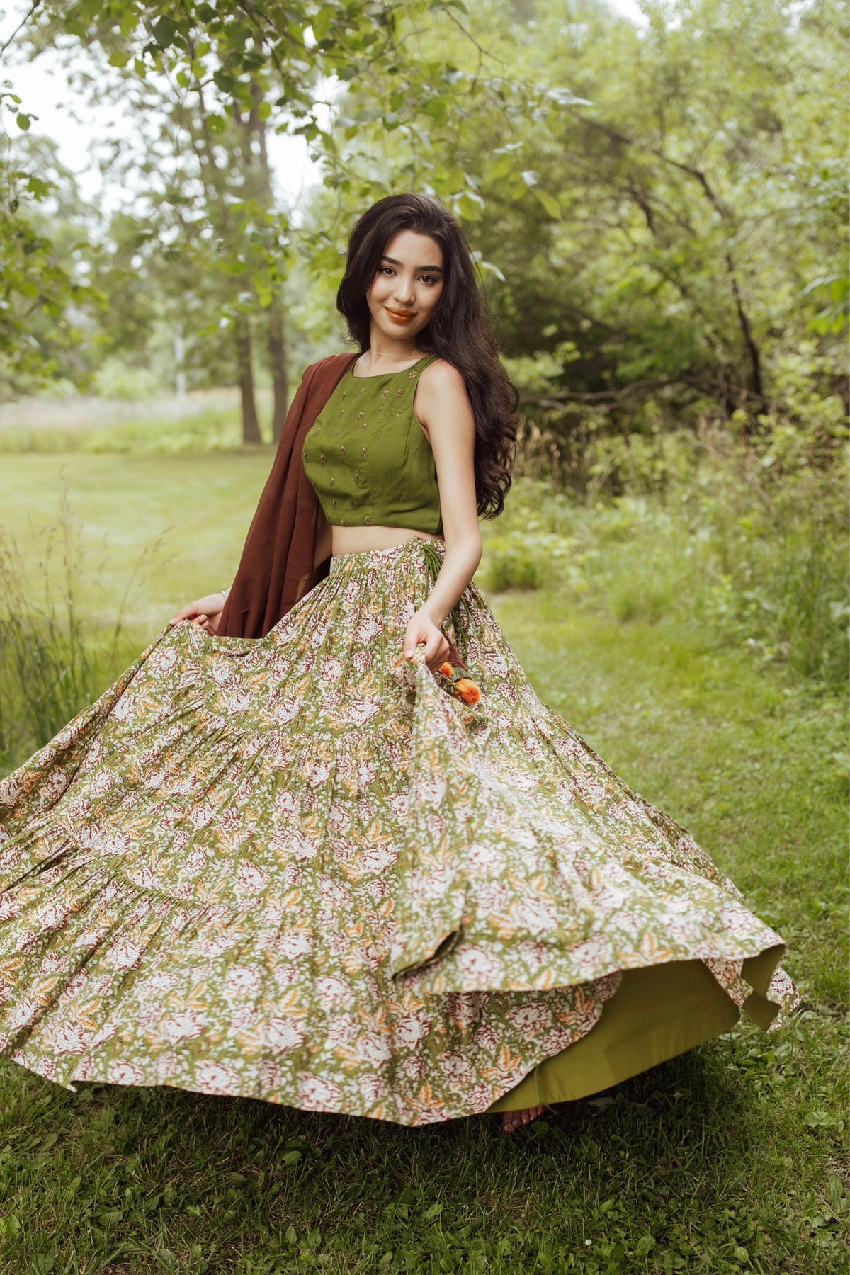 The Clover Chaniya Choli Set combines elegance with subtle charm, creating a look that stands out effortlessly. The tiered cotton chaniya features a beautiful all-over pattern and a dramatic 10-12 meter flare to create a both a eye-catching and refined look. The olive-green blouse has delicate embroidery on the front, while the back is uniquely designed to match the chaniya's pattern. Completing the Clover Chaniya Choli Set is a brown georgette dupatta that adds a graceful finishing touch. This set is perfect for anyone who loves understated yet bold fashion.