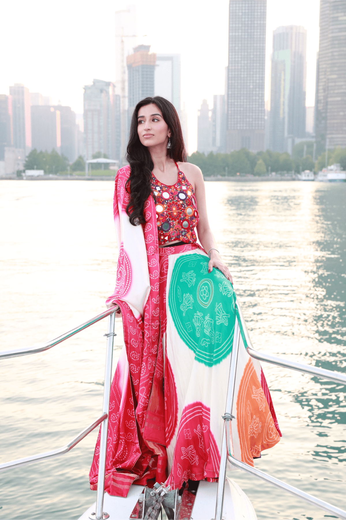 Bright, bold, and beautiful—the Pari Gaji Silk Bandhani Chaniya Choli is a vibrant celebration of tradition and modern flair. The gaji silk chaniya features colorful circular Bandhani prints that swirl with every move. Paired with a richly embroidered mirror-work blouse in Kutchi style and a lace-up back. The matching gaji silk dupatta brings the look together with classic Lagdi Patta pallus. Lightweight yet luxurious, this three-piece ensemble is perfect for festive evenings and Navratri celebrations.