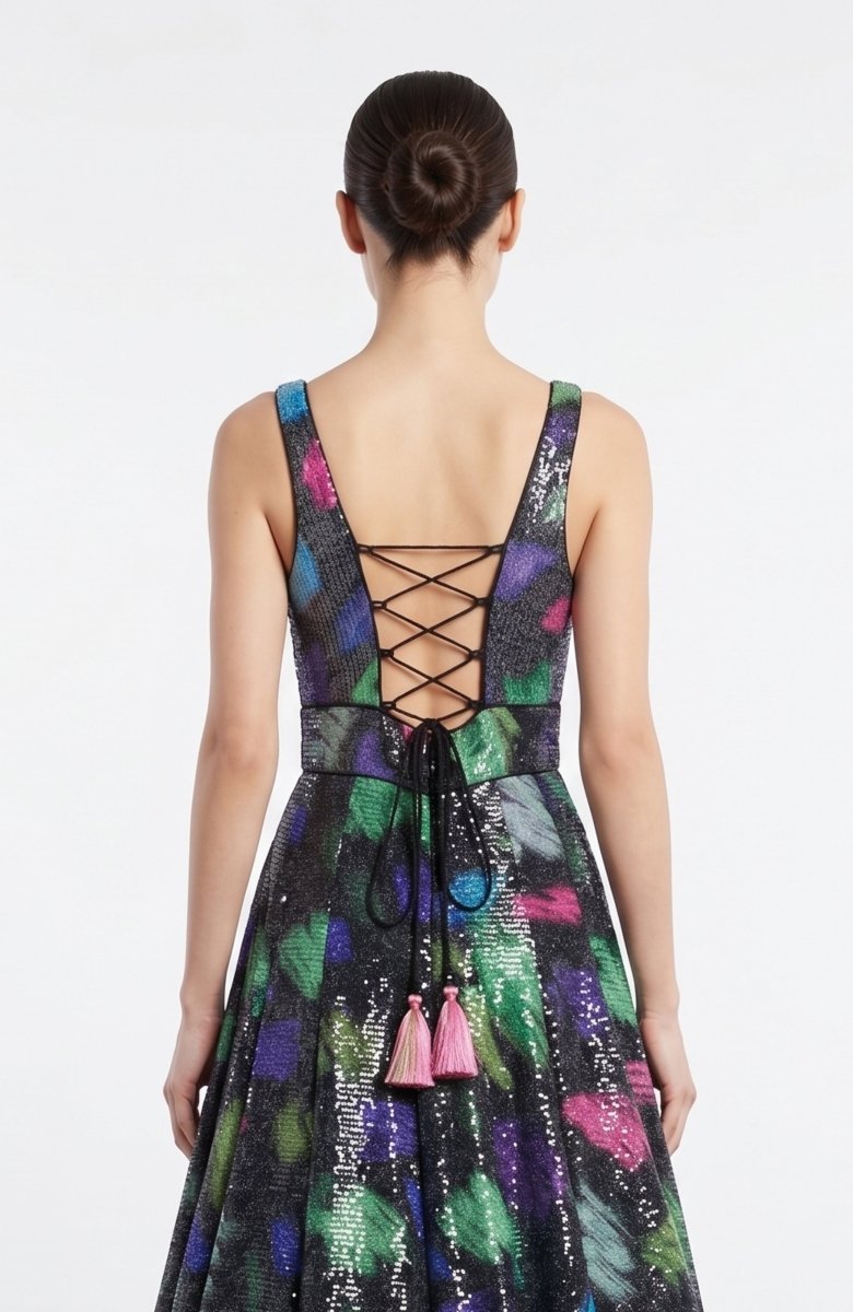 - Specifications: Fully lined, sleeveless, plunge neck, front slit, sequins embroidery