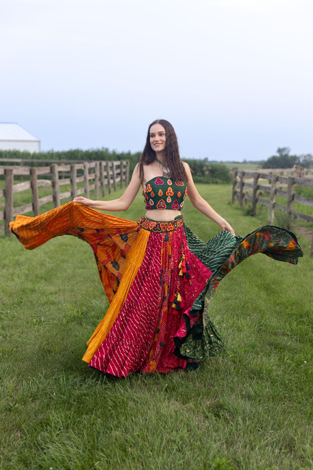 Woman in multi-color cotton-silk chaniya choli with dramatic flare, embroidered halter top, and red dupatta.