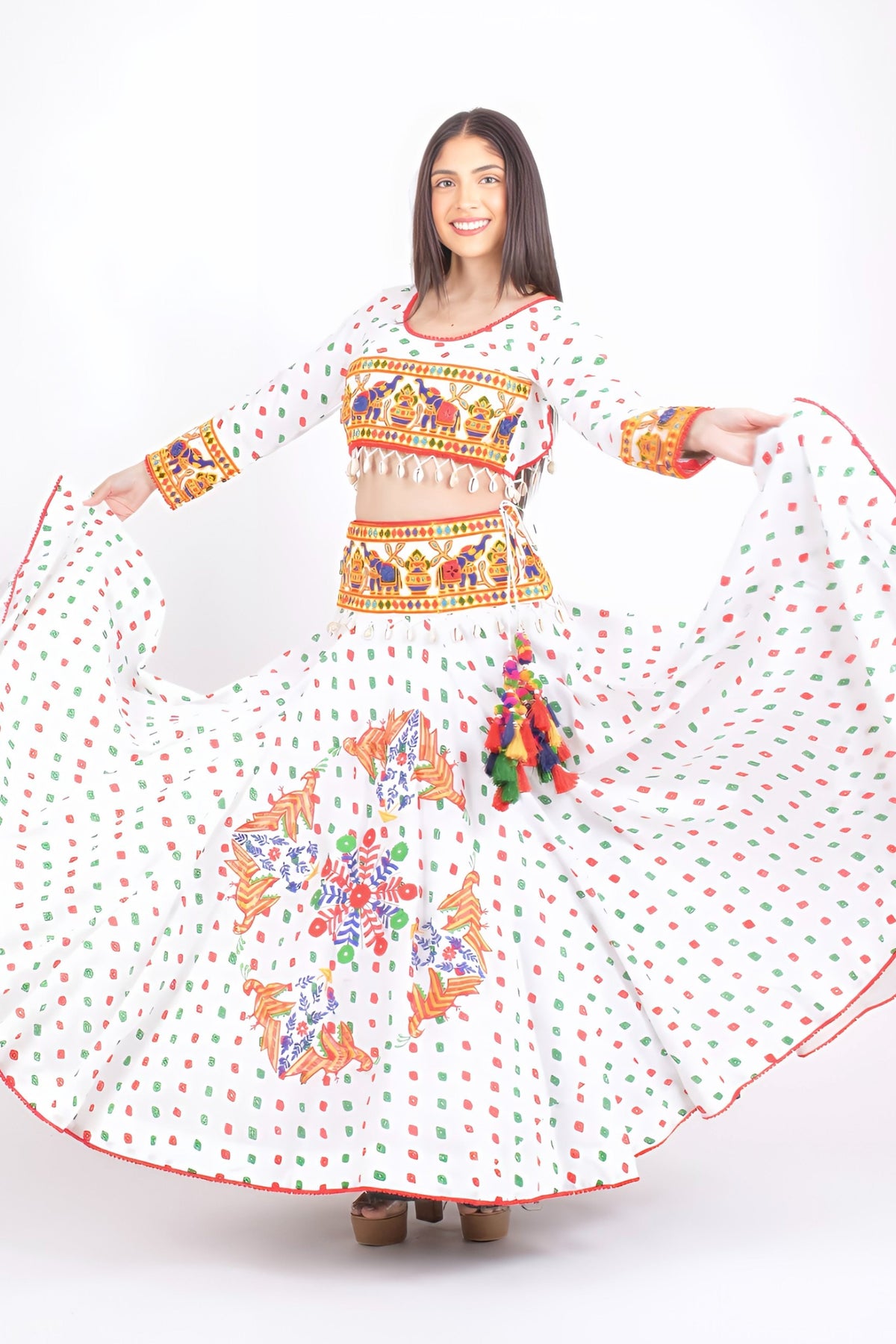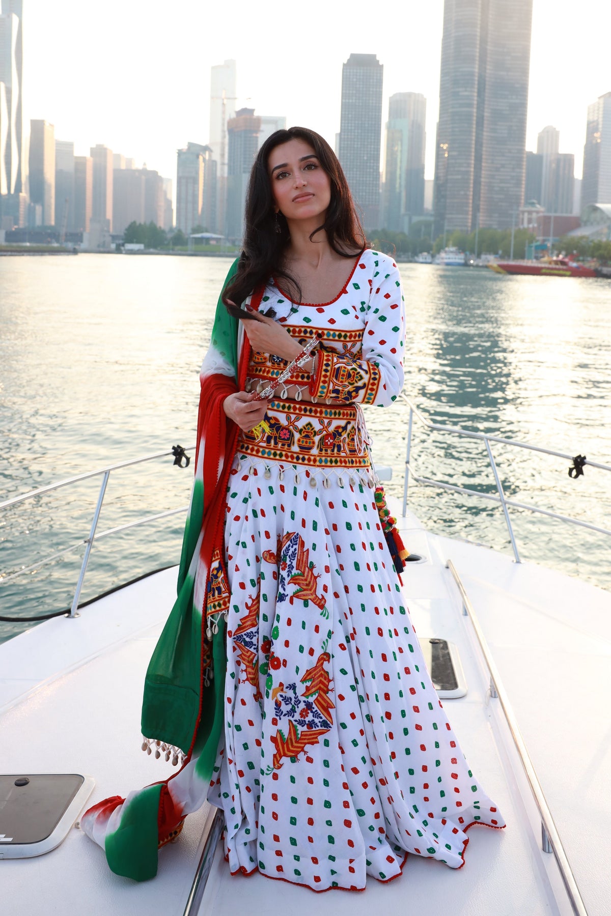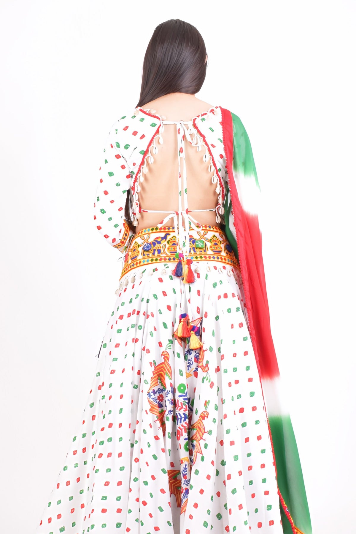 Designed with heritage and handcrafted charm, the Zehra Kutchi Chaniya Choli Set brings Gujarat’s iconic style to life. The cotton blouse is embroidered with intricate kutchi work and real shells, featuring a lace-up back and classic bandhani print. The voluminous chaniya features the same vibrant bandhani design, with an embroidered waistband, striking bird motifs in front and back, and pom-pom detailing on the hem. The Chaniya Choli Set is completed with a shaded georgette dupatta for a soft, flowing finish. Perfect for Navratri, cultural festivals, or standout celebrations.