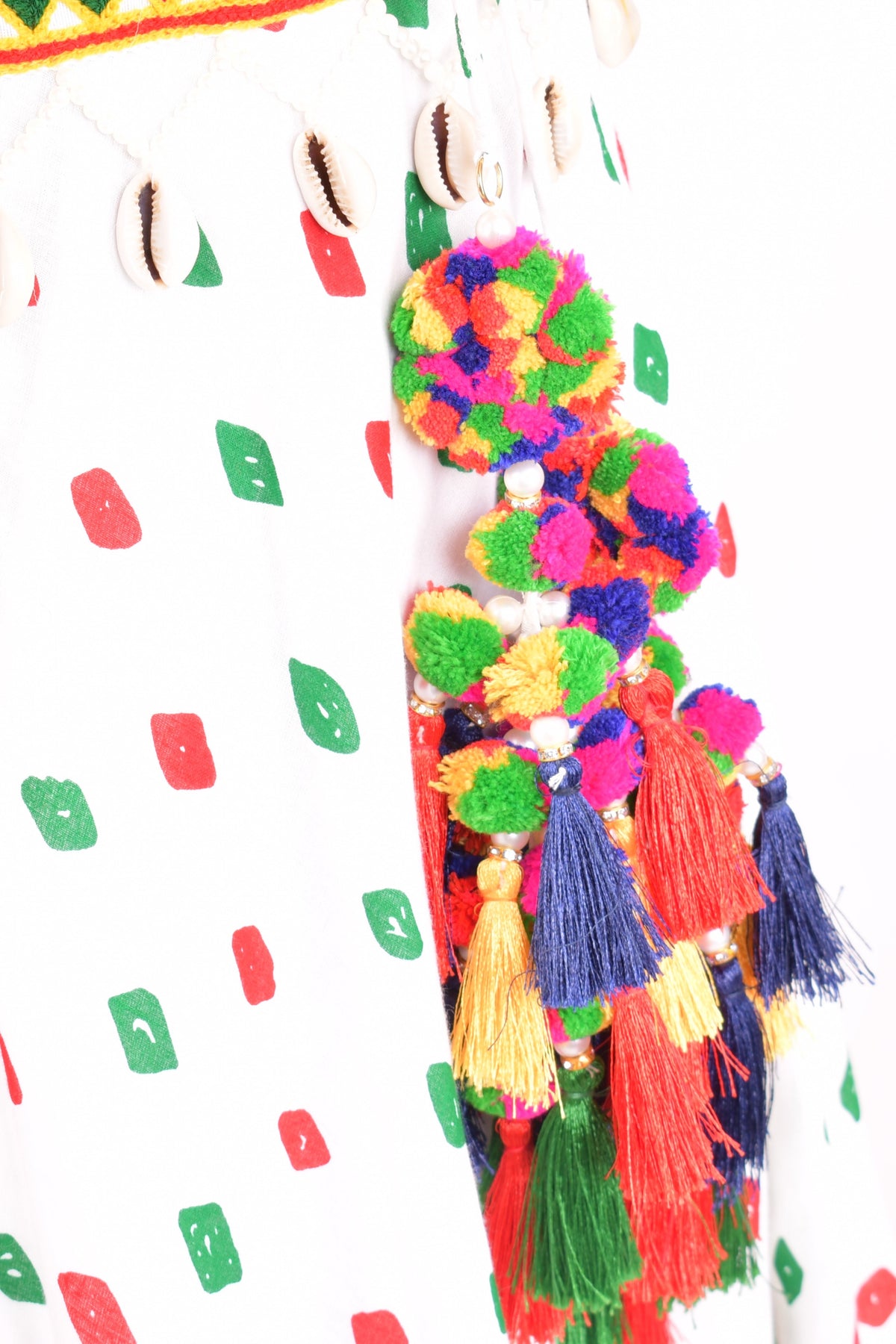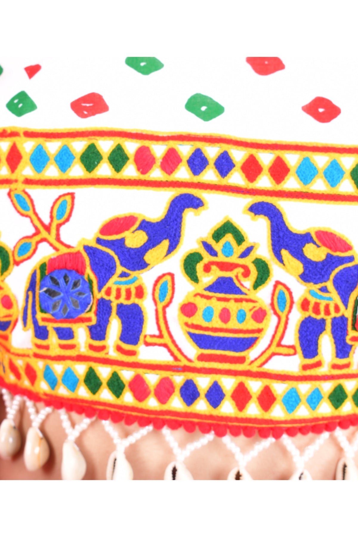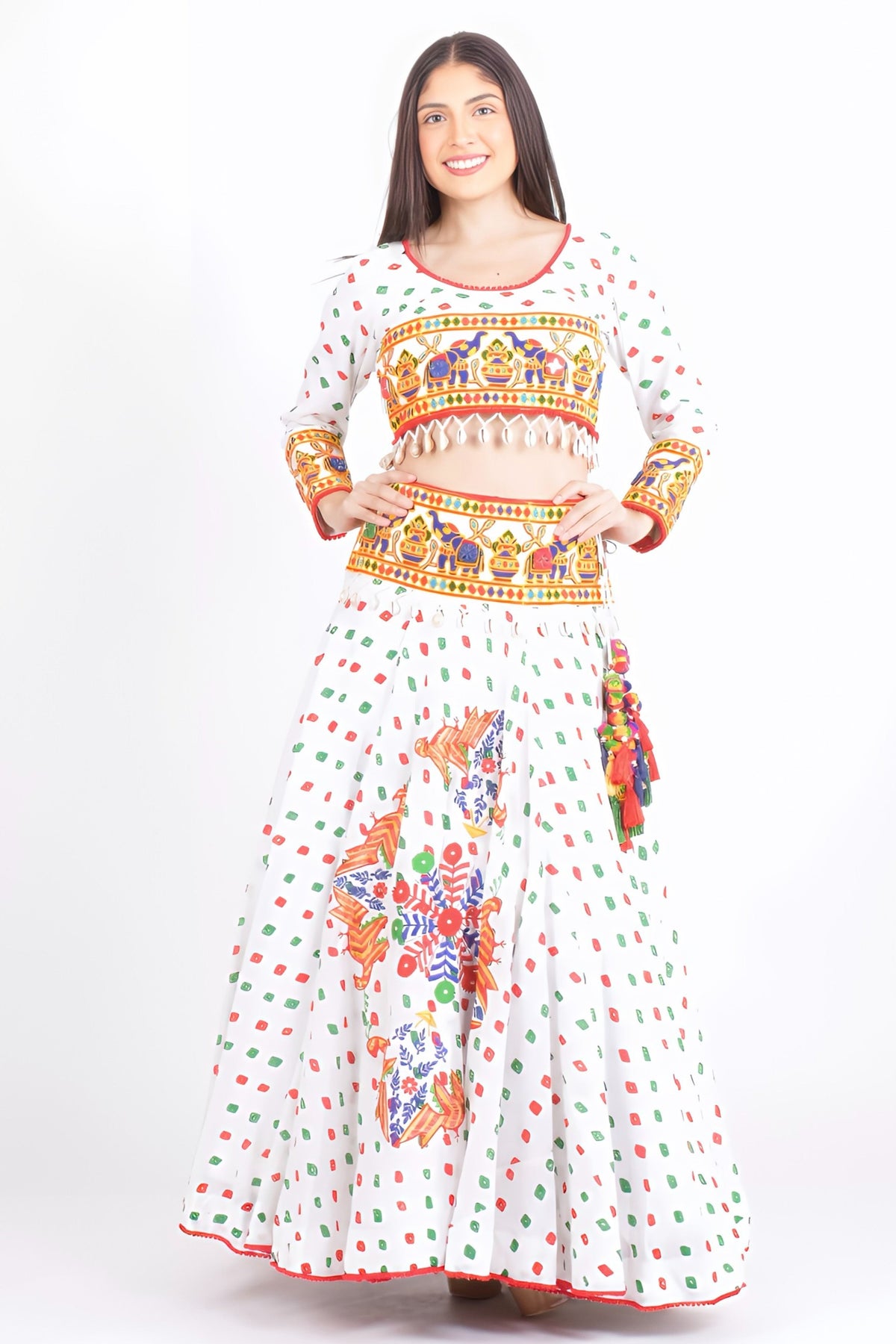 Designed with heritage and handcrafted charm, the Zehra Kutchi Chaniya Choli Set brings Gujarat’s iconic style to life. The cotton blouse is embroidered with intricate kutchi work and real shells, featuring a lace-up back and classic bandhani print. The voluminous chaniya features the same vibrant bandhani design, with an embroidered waistband, striking bird motifs in front and back, and pom-pom detailing on the hem. The Chaniya Choli Set is completed with a shaded georgette dupatta for a soft, flowing finish. Perfect for Navratri, cultural festivals, or standout celebrations.