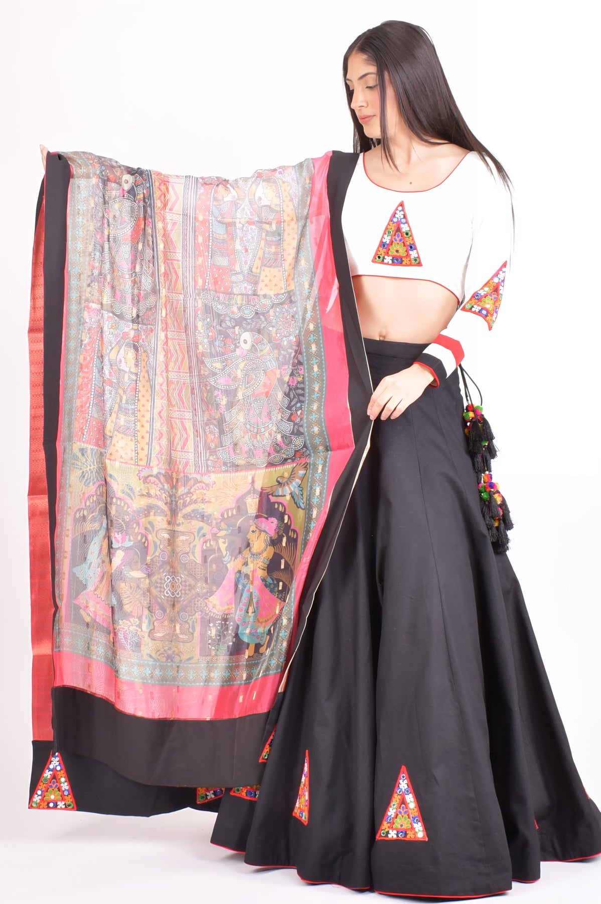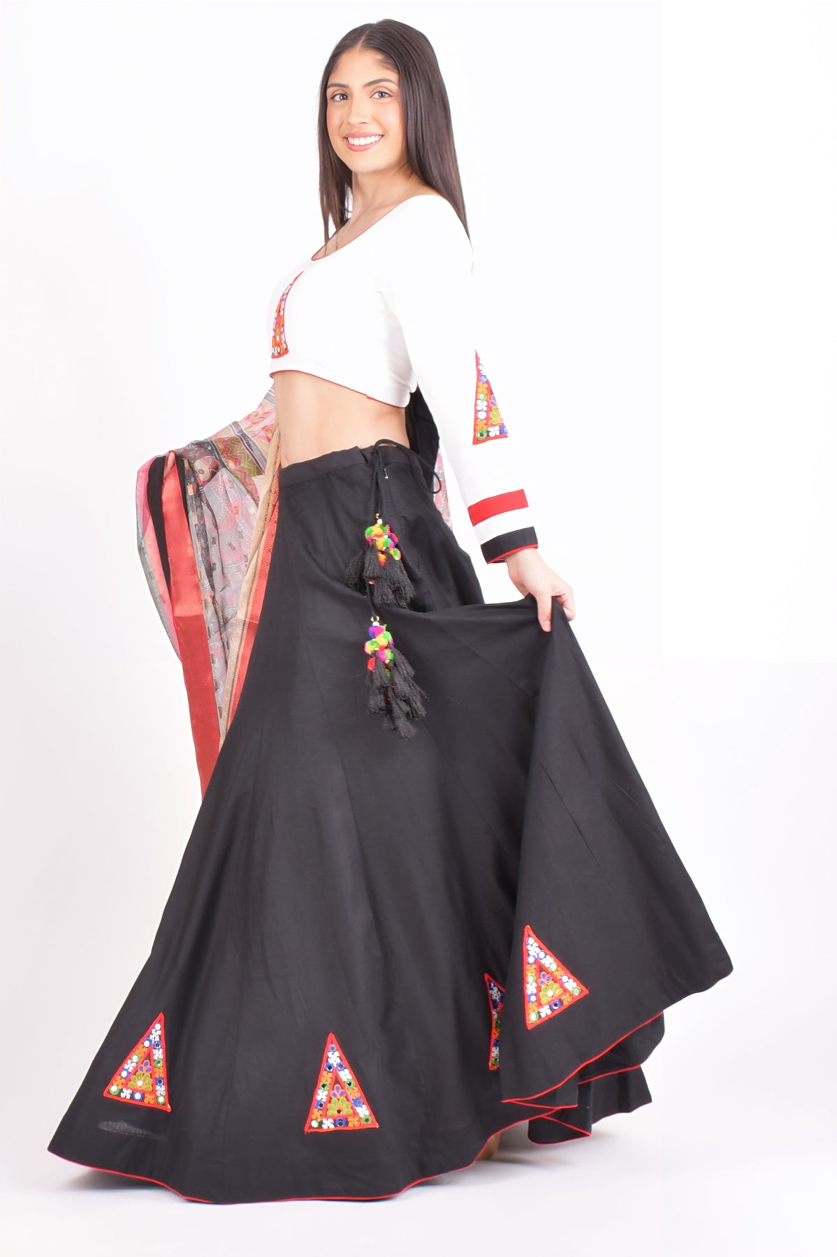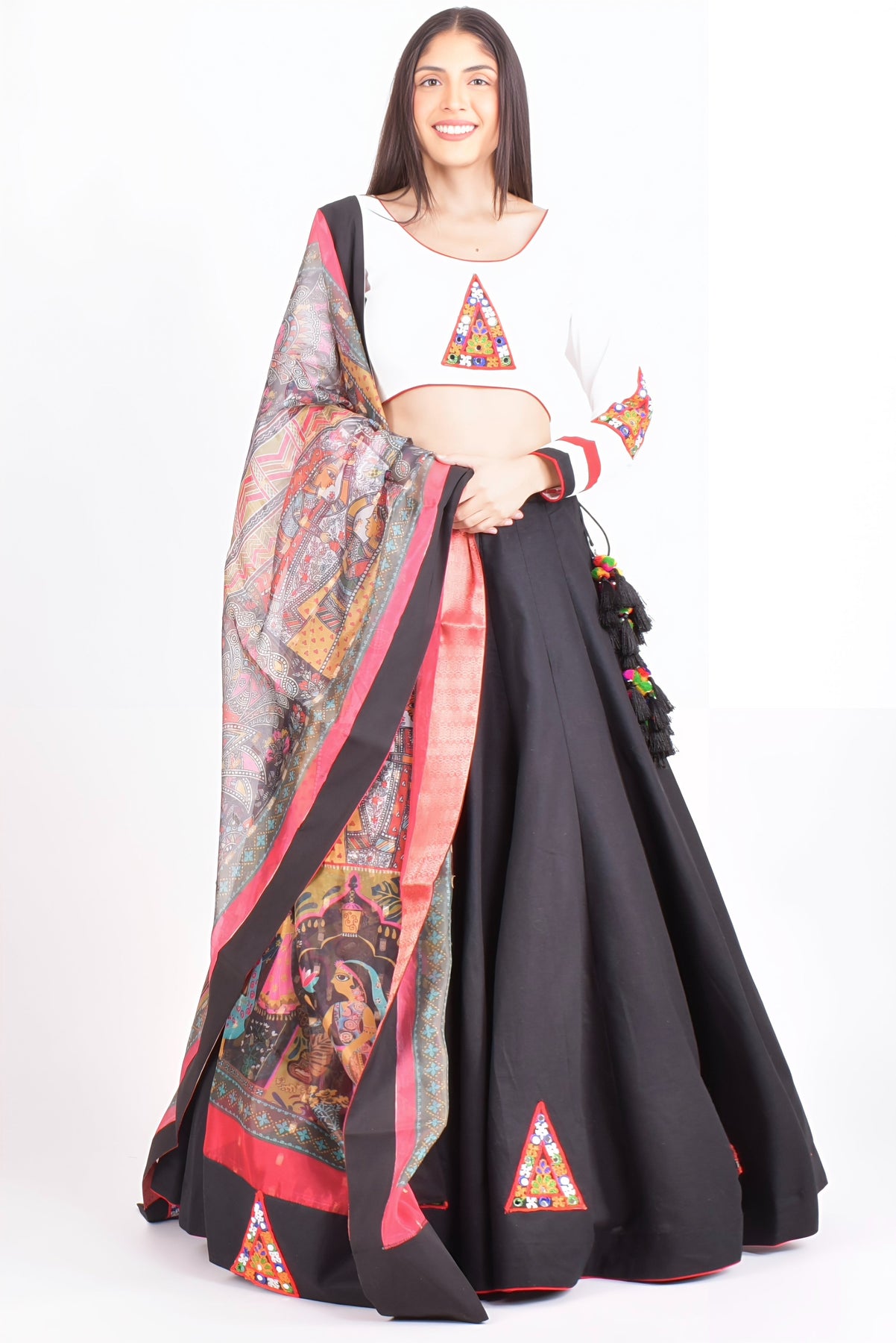 Rooted in tradition and rich in texture, the ISA Cotton Black Chaniya brings artisanal charm to modern festive wear. The black cotton chaniya is finished with vibrant Kutchi embroidery patches along the hem, adding a handcrafted pop of color. It’s paired with a white cotton blouse featuring detailed Kutchi embroidery, and a printed silk dupatta that ties the look together with ease and flair.