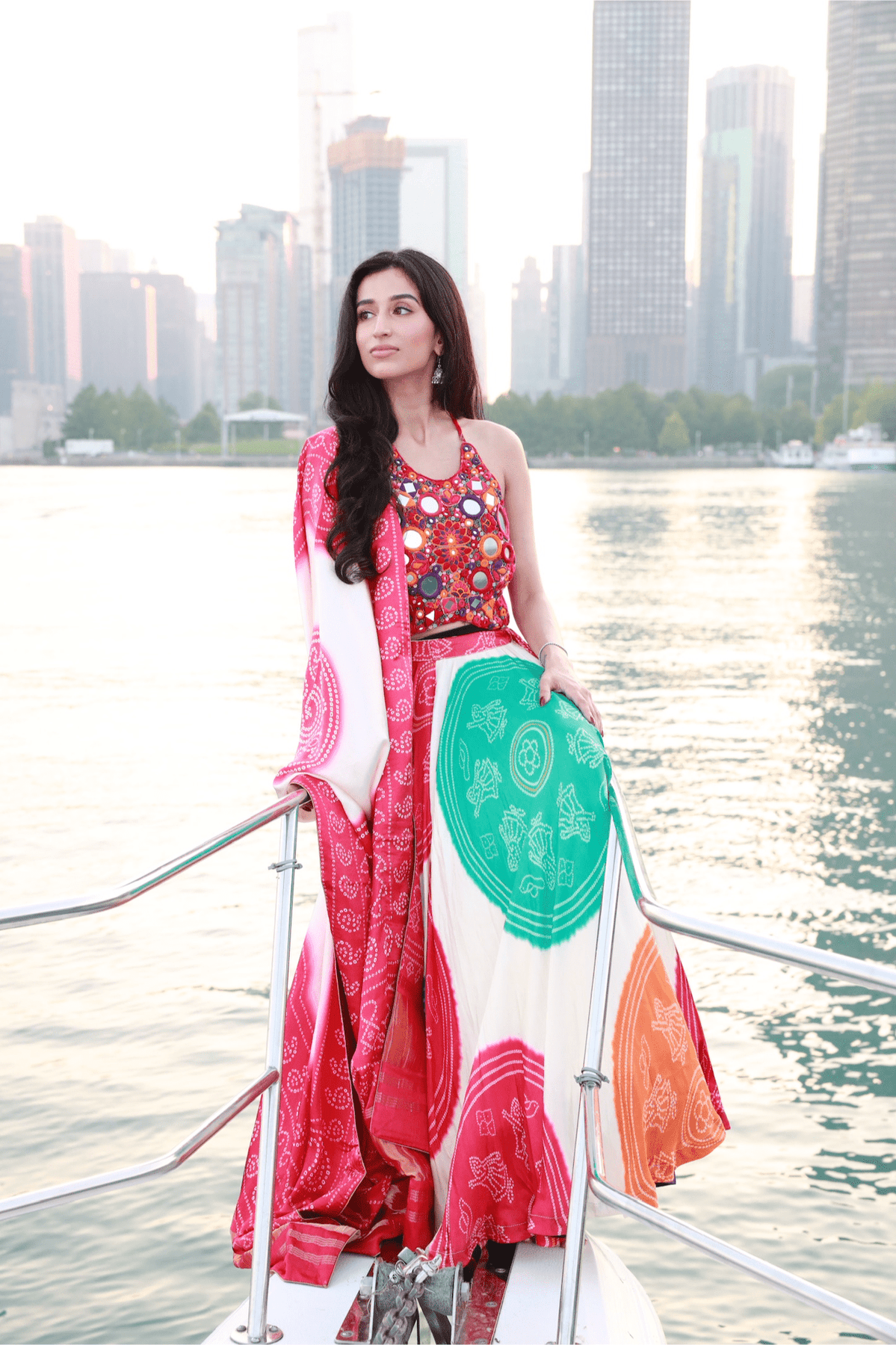 Bright, bold, and beautiful—the Pure Gaji Silk Bandhani Chaniya Choli is a vibrant celebration of tradition and modern flair. The gaji silk chaniya features colorful circular Bandhani prints that swirl with every move. Paired with a richly embroidered mirror-work blouse in Kutchi style and a lace-up back. The matching gaji silk dupatta brings the look together with classic Lagdi Patta pallus. Lightweight yet luxurious, this Chaniya choli is perfect for festive evenings and Navratri celebration.