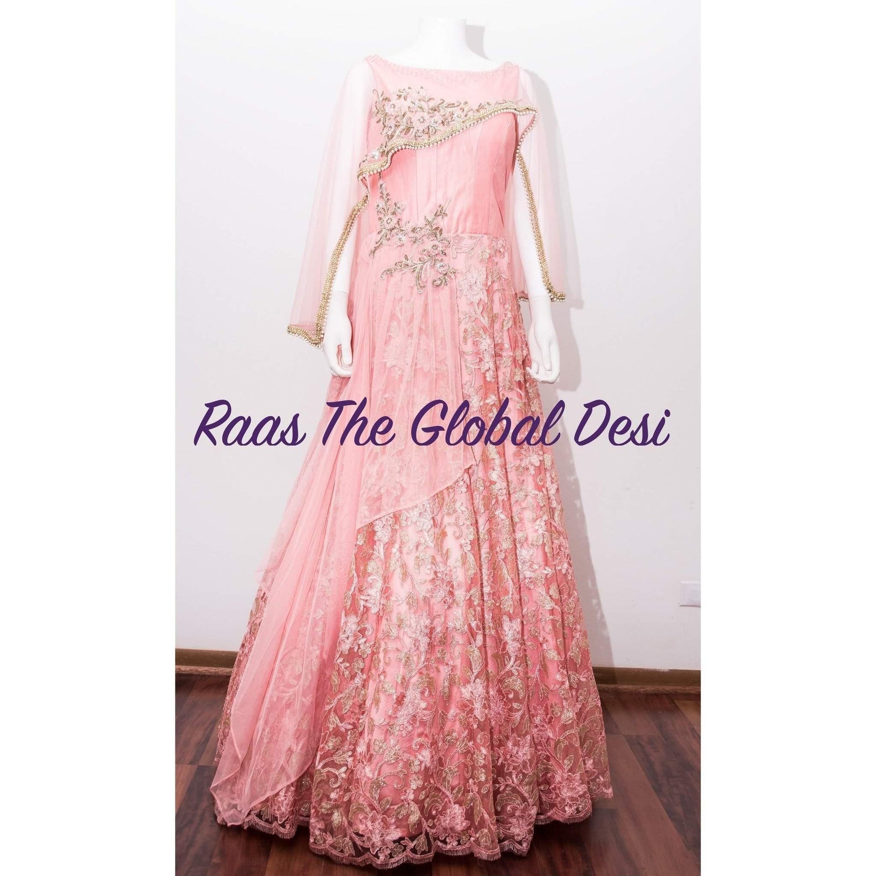 Be the charmer dressed in this spellbinding peach designer gown flowing in a generous sweep of rich t=fabric separated at the waistline with a sheer net belt showing a hint of the waist while a handkerchief cut cape layers the torso gently with its starry kundan work spread about in a gorgeous design and lovely zardosi, zari, kundan & sequin embellishments highlighting the neckline for a look of sheer grandeur!