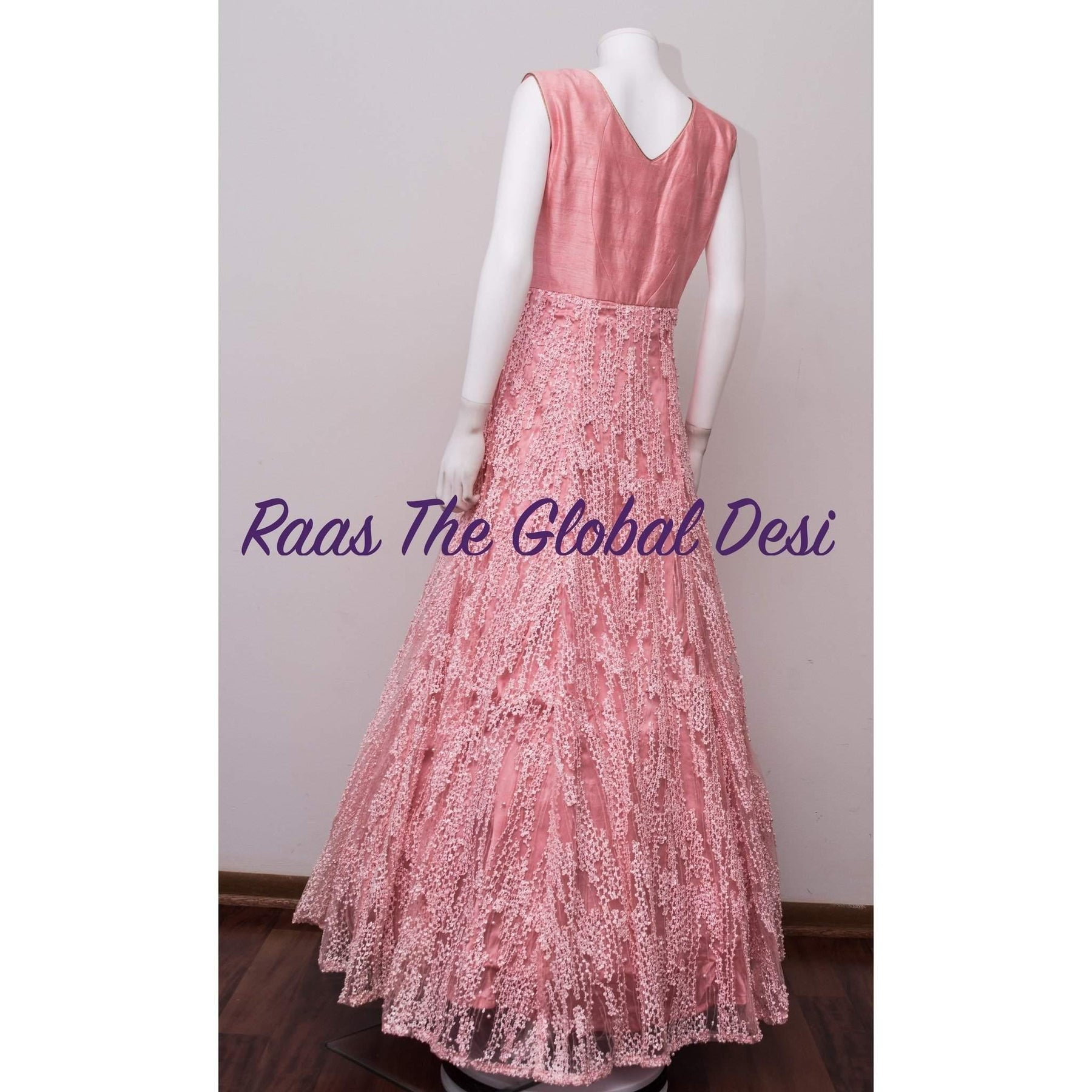 A charismatic appearance in this bewitching peach net gown with a premium regal net story, done up at one part of the neckline & another part of waist in striking zari & sequin worked buttas while the waist belt is enhanced with self color cross detailing in a charming finish . Note: Color may slightly vary due to digital photography.