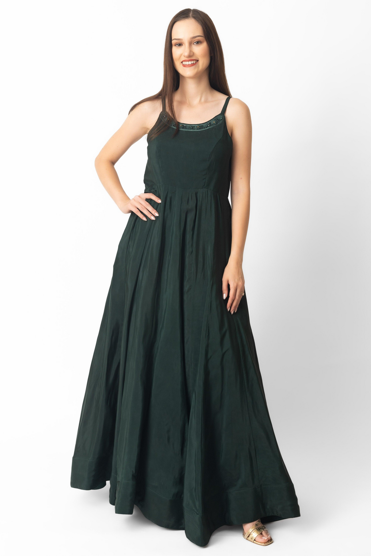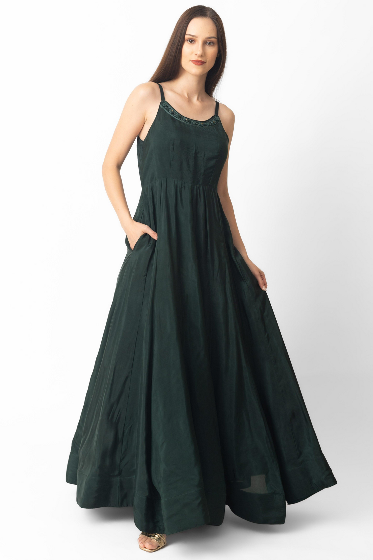 This opulent Mirena Green A-Line Long Dress is crafted from sumptuous silk, designed to keep you comfortable while exuding effortless style. Its lightweight, soft fabric ensures you look your best with every wear. The Mirena long dress features intricate resham embroidery at the neckline, adding a touch of sophistication. Perfect for classing up any occasion, this piece combines timeless elegance with modern flair.