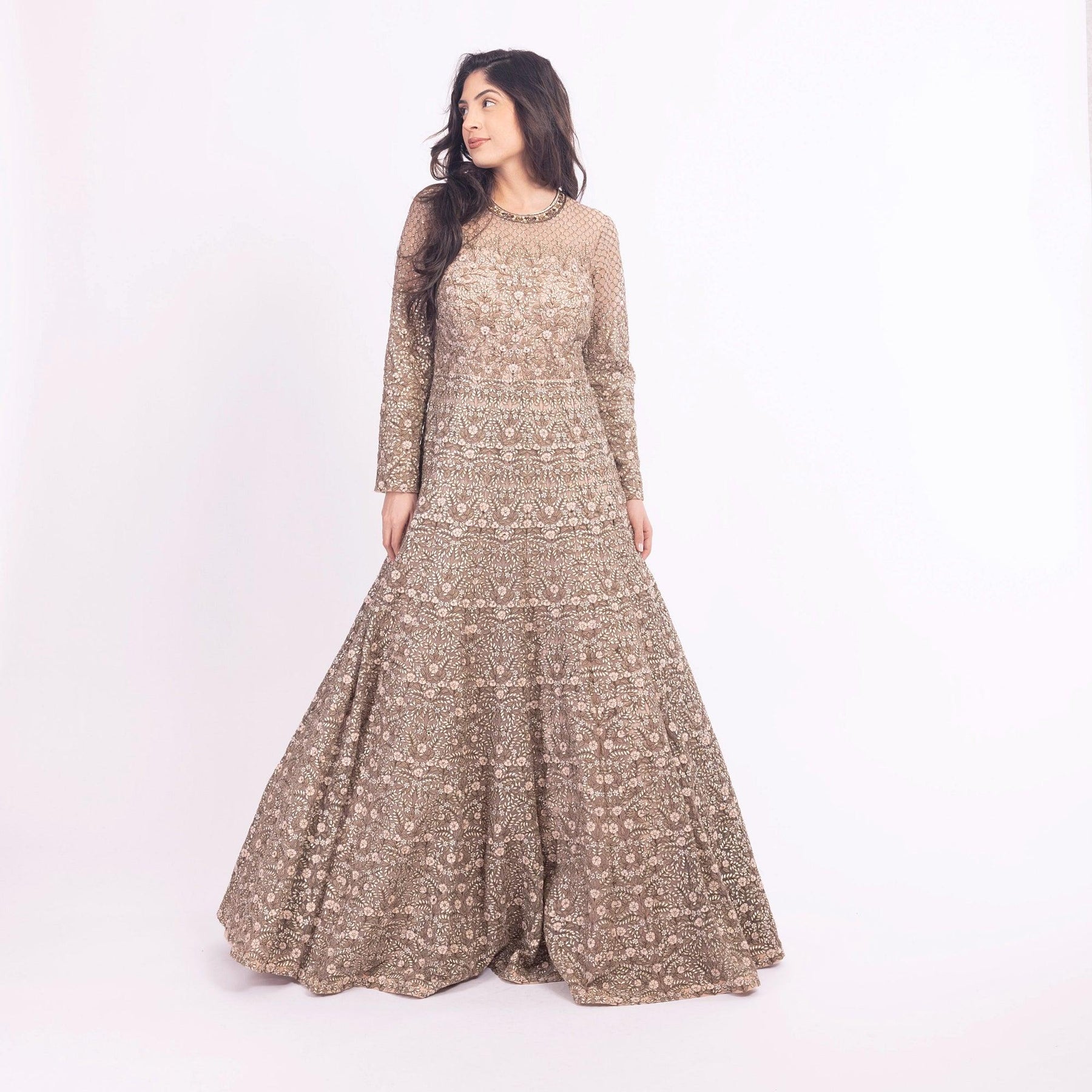- Specifications: Fully lined, resham and self-thread embroidery, long sleeves, includes can can