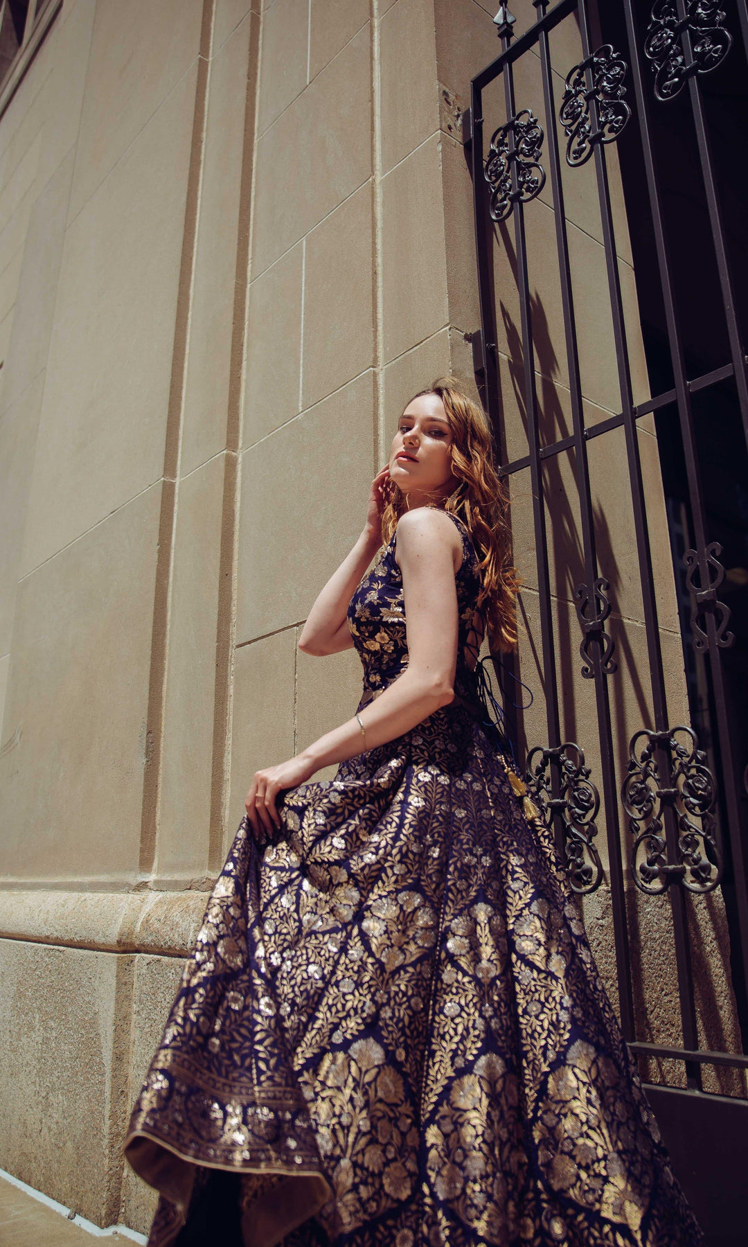 Make an unforgettable impression with the Alisha Blue Gown, crafted from rich jacquard silk. The fabric showcases intricate all-over patterns that exude classiness while maintaining a subtle charm. The Alisha Gown also features a deep plunge and hand embroidered neckline to add an artisanal touch. The A-line silhouette adds a voluminous effect as the design gracefully flows downward.