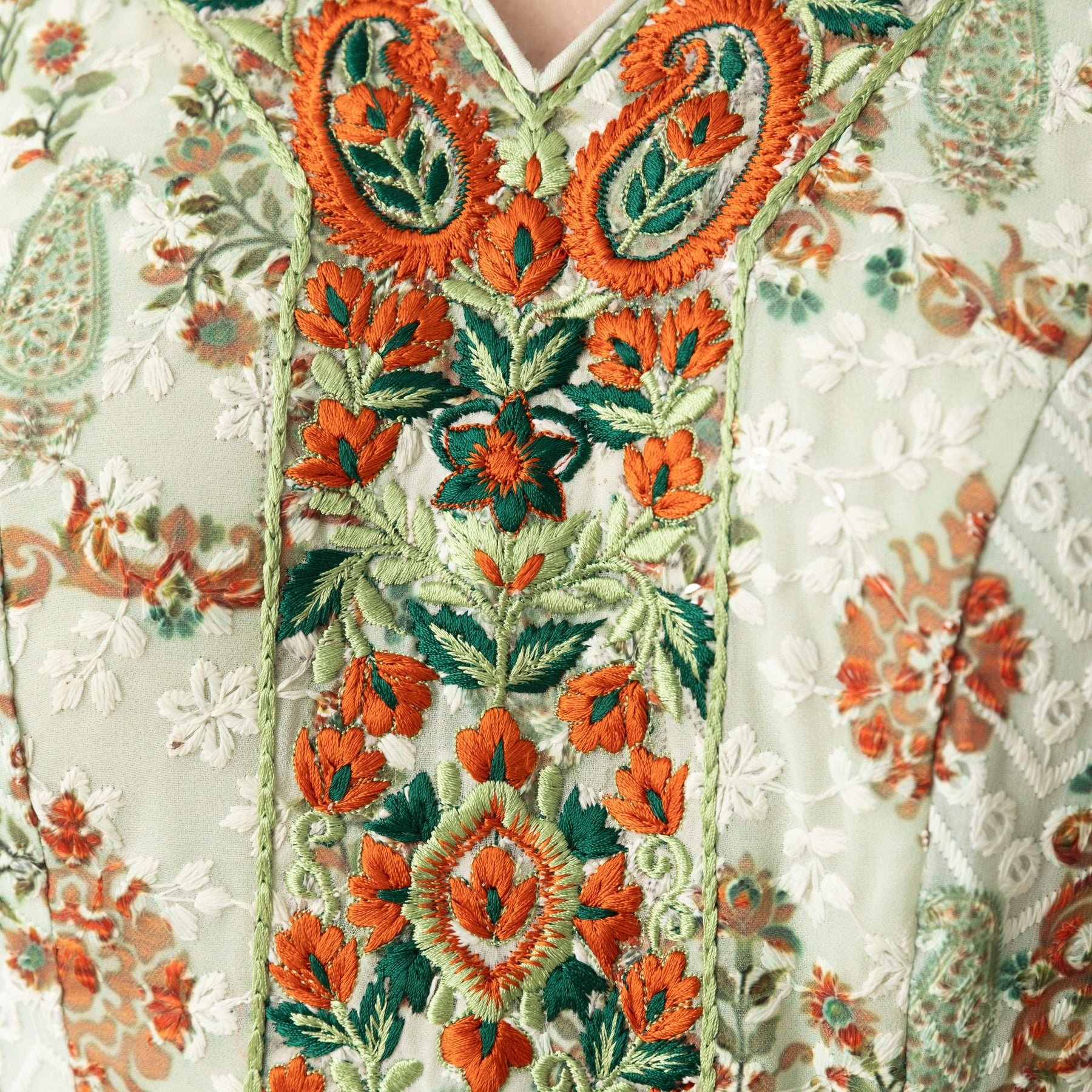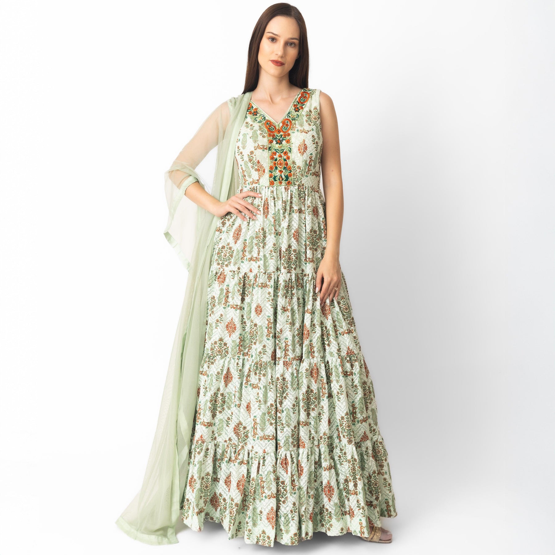The Cate Green Gown Dress is a stunning masterpiece, designed to turn heads with its exceptional craftsmanship. Featuring all-over embroidery in a beautiful shade of green, this dress is made from soft, flowing georgette that drapes gracefully. The V-neckline adds a touch of elegance, while the intricate embroidery creates a textured look. It also comes with a matching green net drape to add an extra layer of refinement to the ensemble. Perfect for events where you want to make a bold yet graceful statement, the Cate Green Dress combines artistry and elegance seamlessly. 2 week delivery